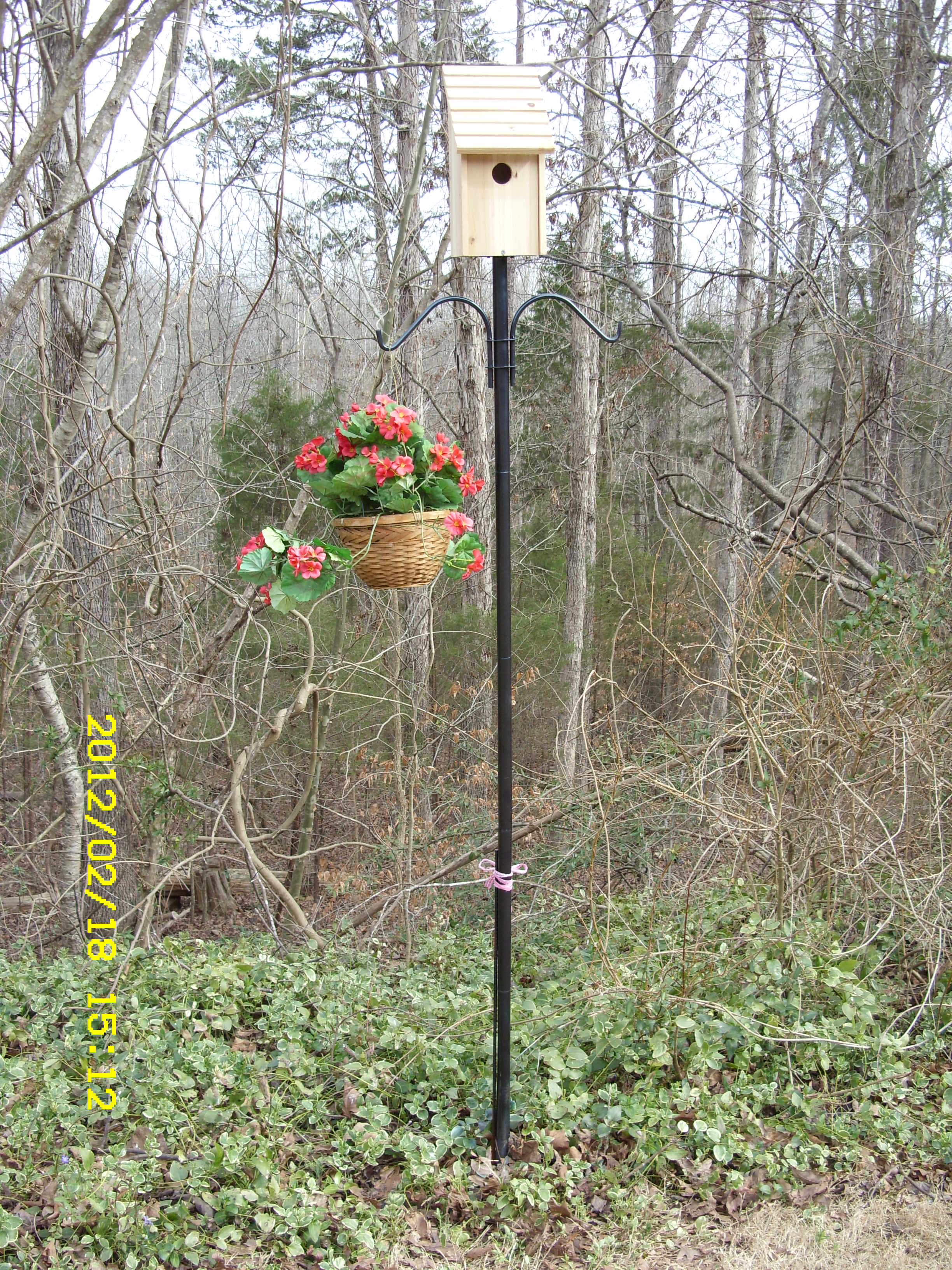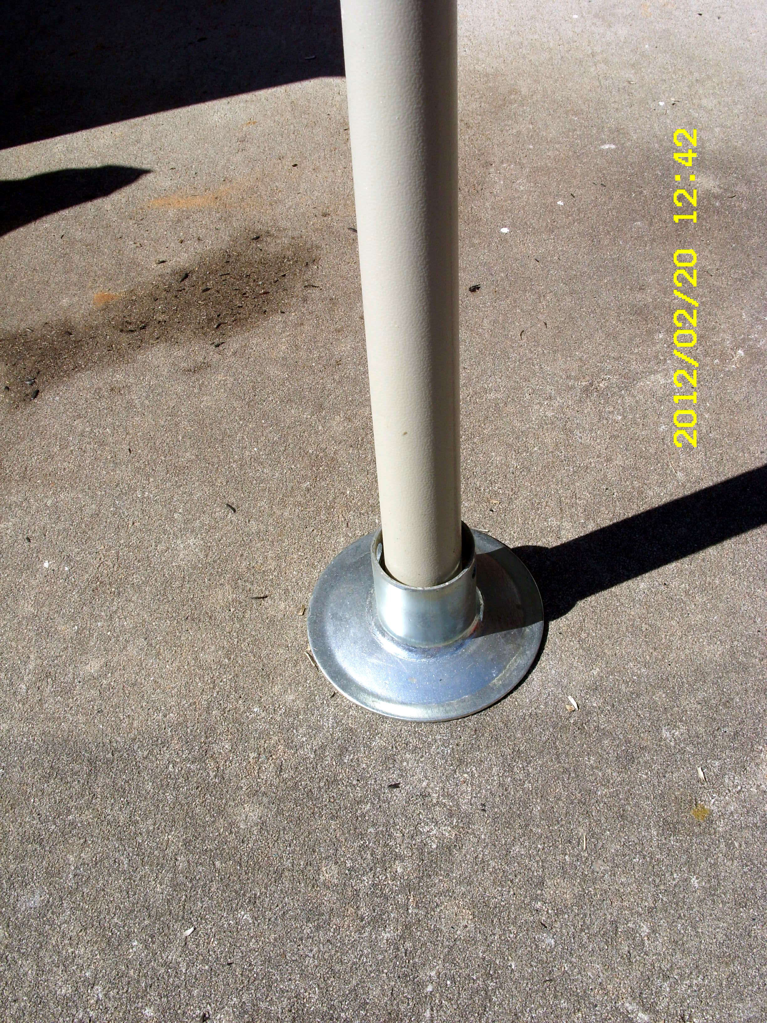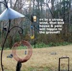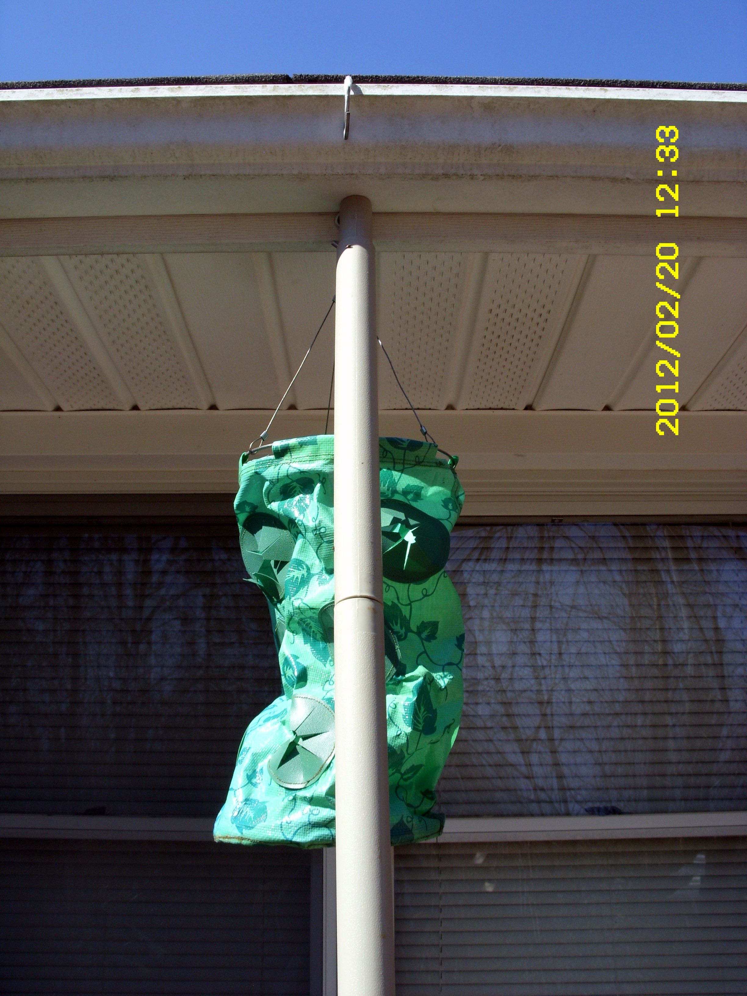 Postscript, Thursday, Feb. 23, 2012: Change of plans!! Now I think I will set the plastic poles in a large container of freshly prepared cement. Then I can move it around (if necessary). I don’t want to risk damaging the eave!!