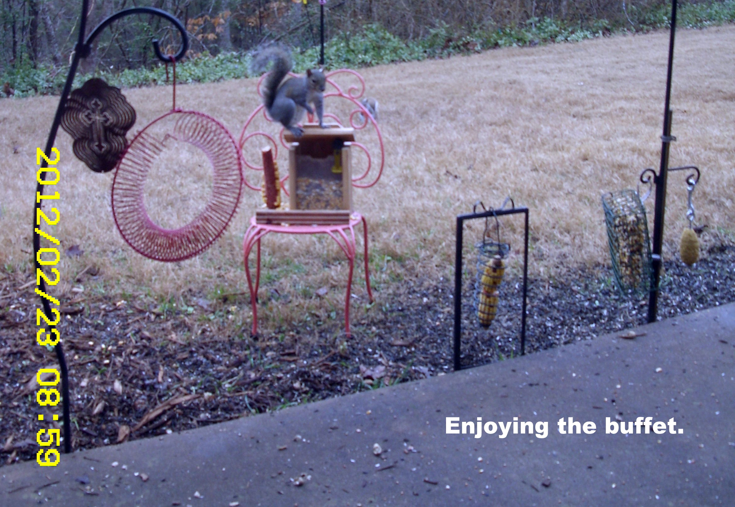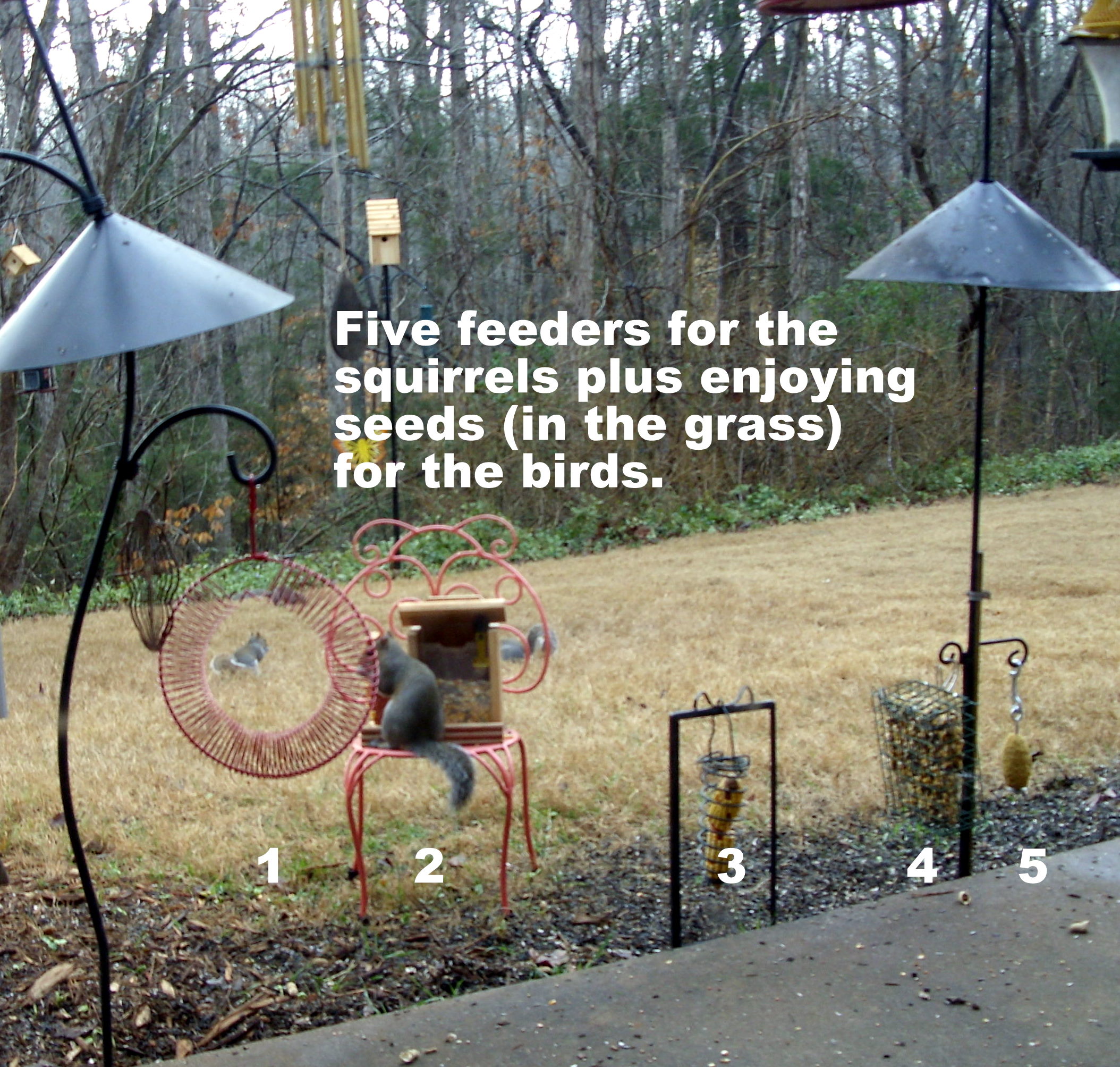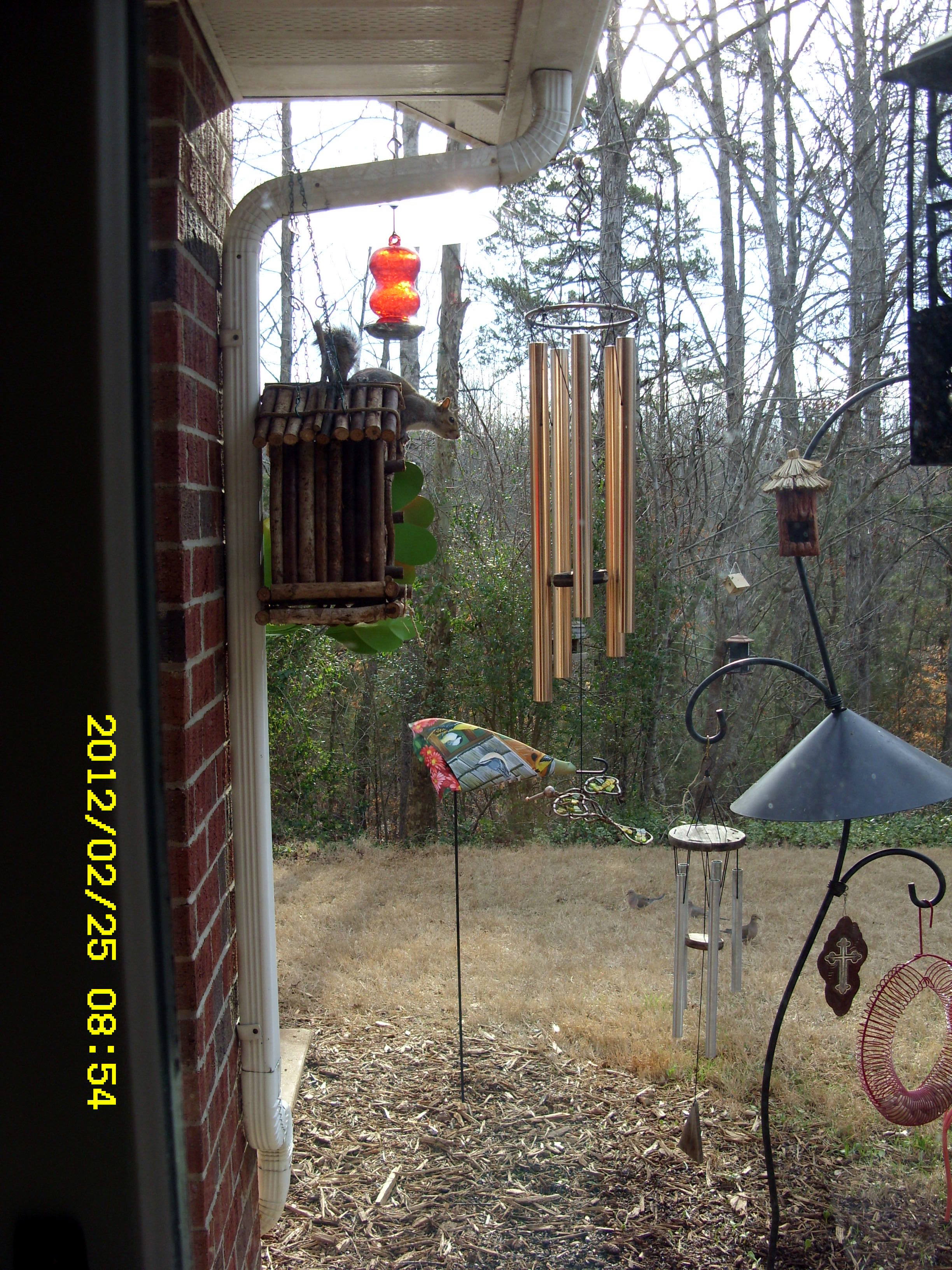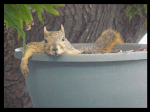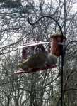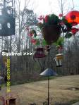 I never cease to be amazed by the skill of my fine furry friends. From the kitchen I could see the birds and squirrels enjoying their buffet. Suddenly I see a squirrel on a sunflower seed bird feeder where he is not supposed to be. I went to the patio door and scolded–with a polite “no.” Minutes later he was back!! I had to remove the feeder from the eave of the roof. The squirrels are blessed with an abundant supply of food but they go after things that are not theirs. FYI: About fifty birds on the grass of the back yard scratching for seeds. (The picture on the right [above] is cute but I can’t claim credit for it. THANKS, again, to blog viewers who send pictures.)