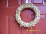 I tossed about one quart of bird seed in the grass, hung the whole peanut feeder (wreath) for the squirrels, rehydrated mealworms for the Bluebirds, and refilled sunflower seed feeders. I recently moved the straw wreath from outside light fixture to the storage-room door. Look, the birds have already started pulling straw out!! Likewise they are pulling fabric and string from the other container. (My “critters” support my emotional health.) ~~ If it gets warm enough… I may spray paint the old wrought-iron posts. I’m so anxious for a really nice warm weekend so I can start positioning baskets in the trees for potential bird nests.