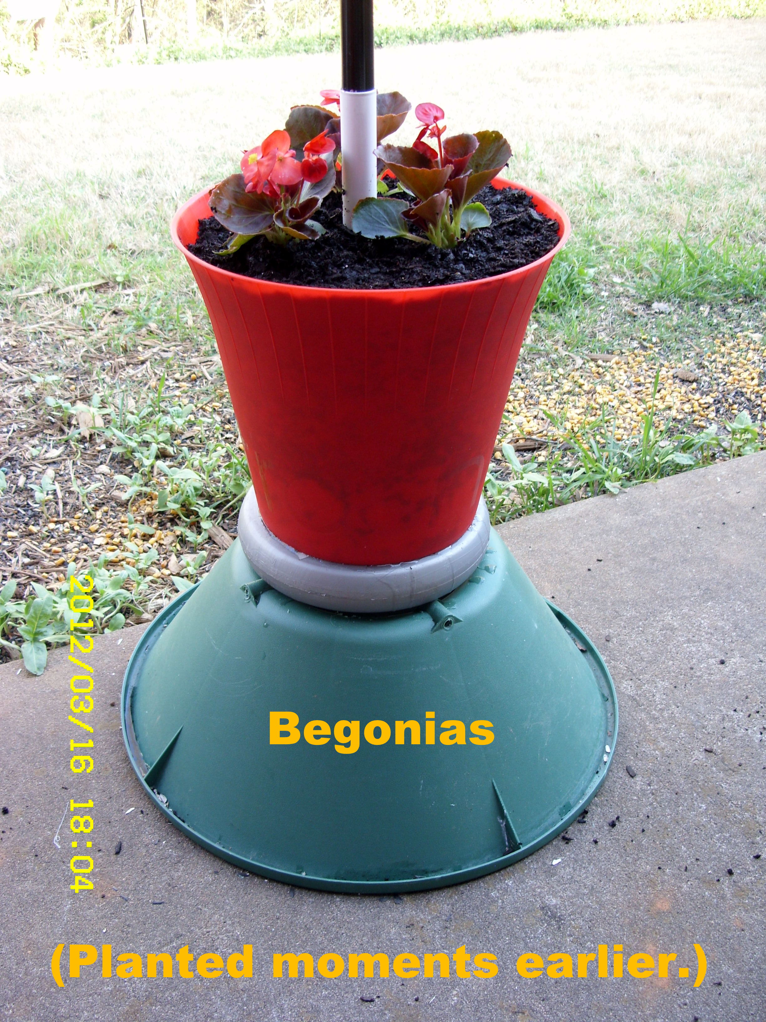 This week, I have a “one-track-mind” as I work to encourage Hummingbirds to my feeders. Still too early for the Hummingbirds but not too early to plan for bright color flowers. I bought two Topsy-Turvy upside-down Hummingbird planters (red, of course) and a hanging stand bearing the Topsy-Turvy brand. (Big Lots is promoting Topsy-Turvy products this week. Had I known…[ha], I could have purchased very sturdy, very nice stands [for $10. each] and been spared all my earlier labor. C’est la vie!!) I’m organizing planters and planning the flowers that I will plant. (Lots of research on the Internet.) All with the objective to attract Hummingbirds!! ~~ We have a greenhouse here at JAARS that opened Thursday evening (for the first time this year). Last night, I purchased—and planted—Begonias in a red pot.