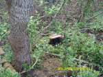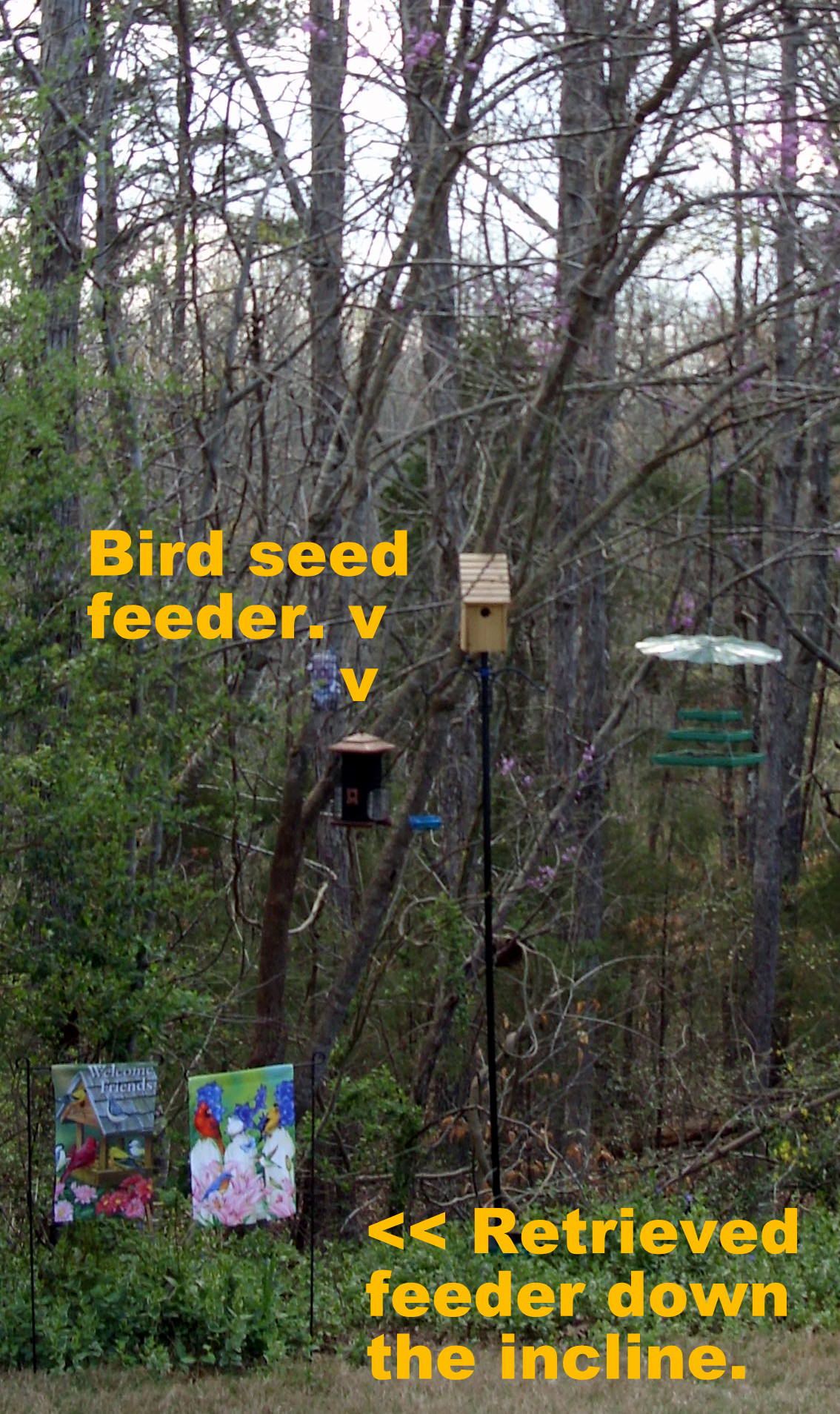 Yesterday I awakened to see that the bird seed and suet feeder had disappeared from its limb at the edge of the woods. I had difficulty retrieving the feeder because there is a steep slope (not obvious in the picture). Fortunately, a fallen tree, or limb, prevented the feeder from cascading into an inaccessible area. ~~ Two days earlier, a smaller feeder disappeared from that same area (and I can’t find it).