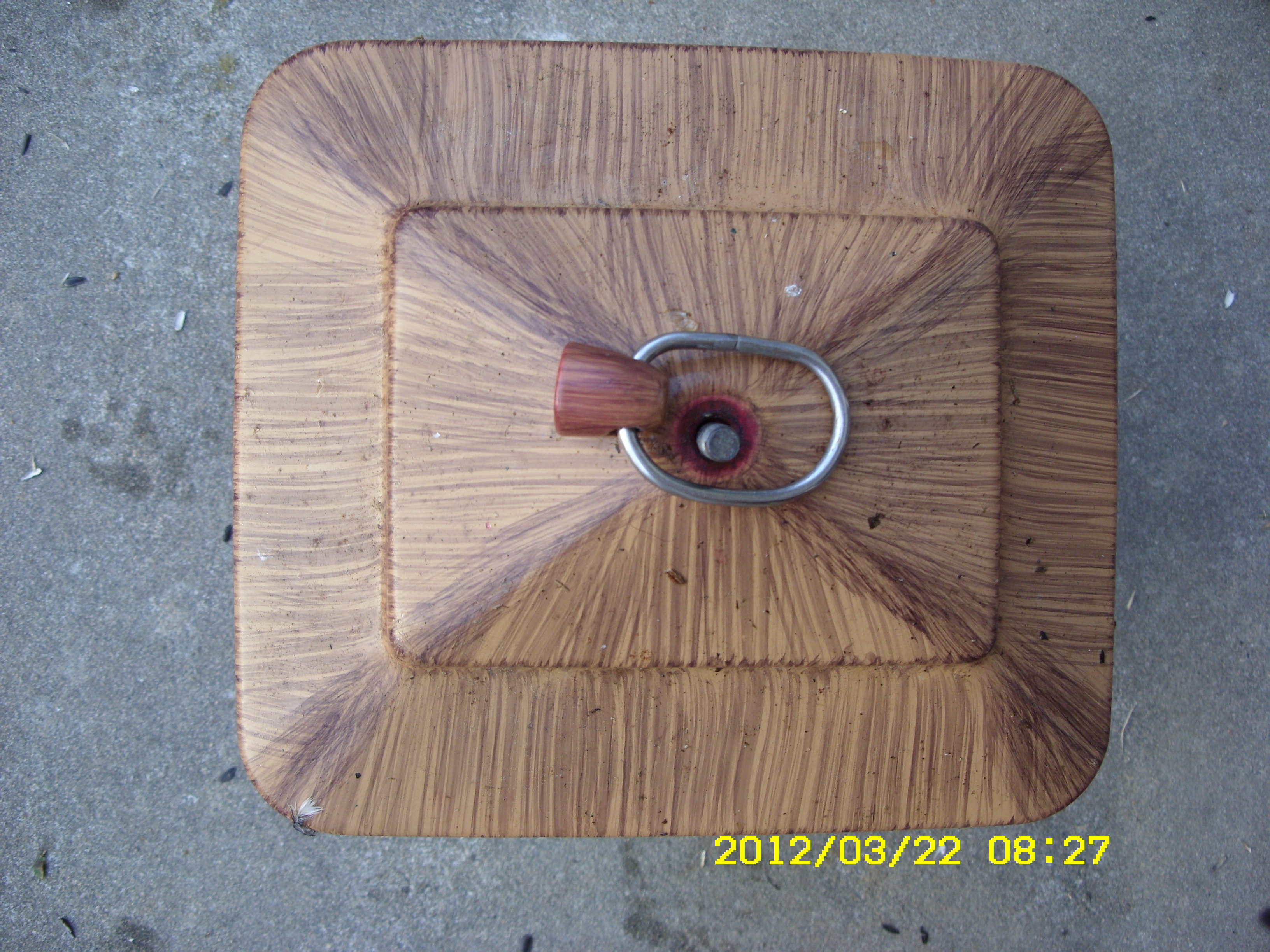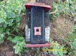 I never dreamed I’d have major problems when I decided to operate a wild life “bed and breakfast.” Below, in pictures, you can see some of my recent frustrations. Two days ago, I awakened to see the Bluebird house leaning precariously. How could this happen after all my hard work (and the application of a Bungee cord)?? Oops, I forgot to take a picture. ~~ Now the Bluebird house is situated between my apartment and the neighbor’s apartment. I removed two sections of pipe so the house is closer to the ground and less likely to topple over. Note the extra weights at the bottom. To add “insult to injury” (ha) some other species of bird adopted the Bluebird house. For several days, I brushed away the nesting material that accumulated. He/she was not intimidated!! In one day’s time he/she put more nesting material in than the several previous days combined. I didn’t have the heart to evict them again!!