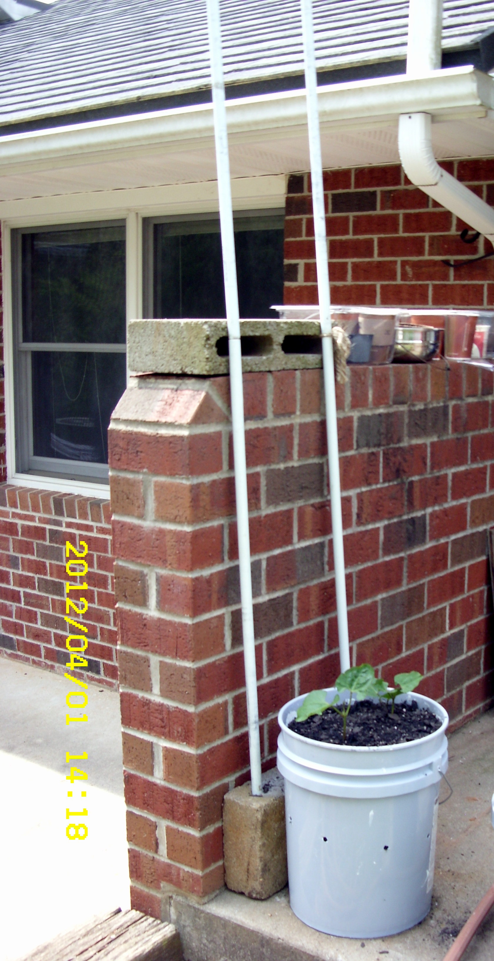A week ago, yesterday, I was mixing cement to also create this trellis. It is at the far-end of my patio (out of sight). Scarlet Runner Bean is growing in the “free” 5-gallon paint pail and will, hopefully, climb the trellis (and attract Hummingbirds). It has my permission (ha) to trail all over the brick wall, too!! ~~ On the brick wall (temporarily) are Thunbergia Climbers seeds in peat pots.