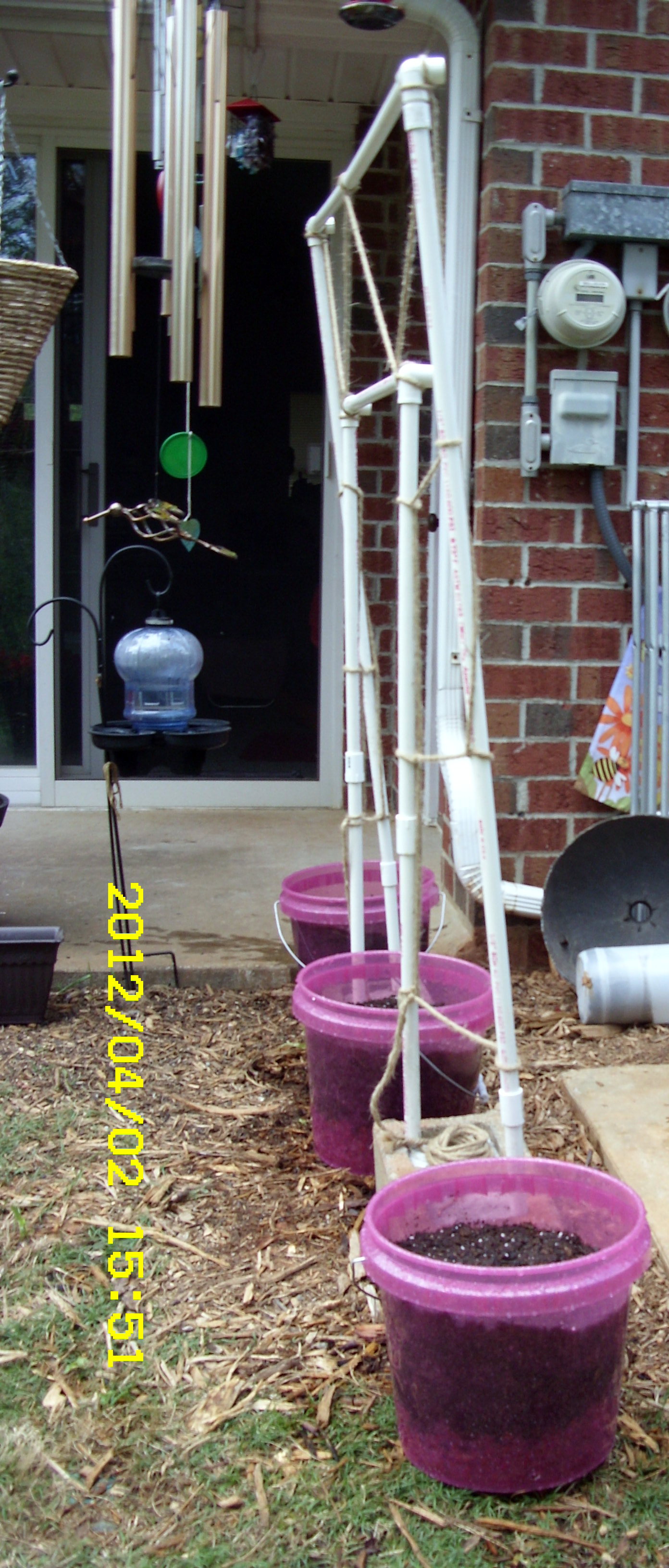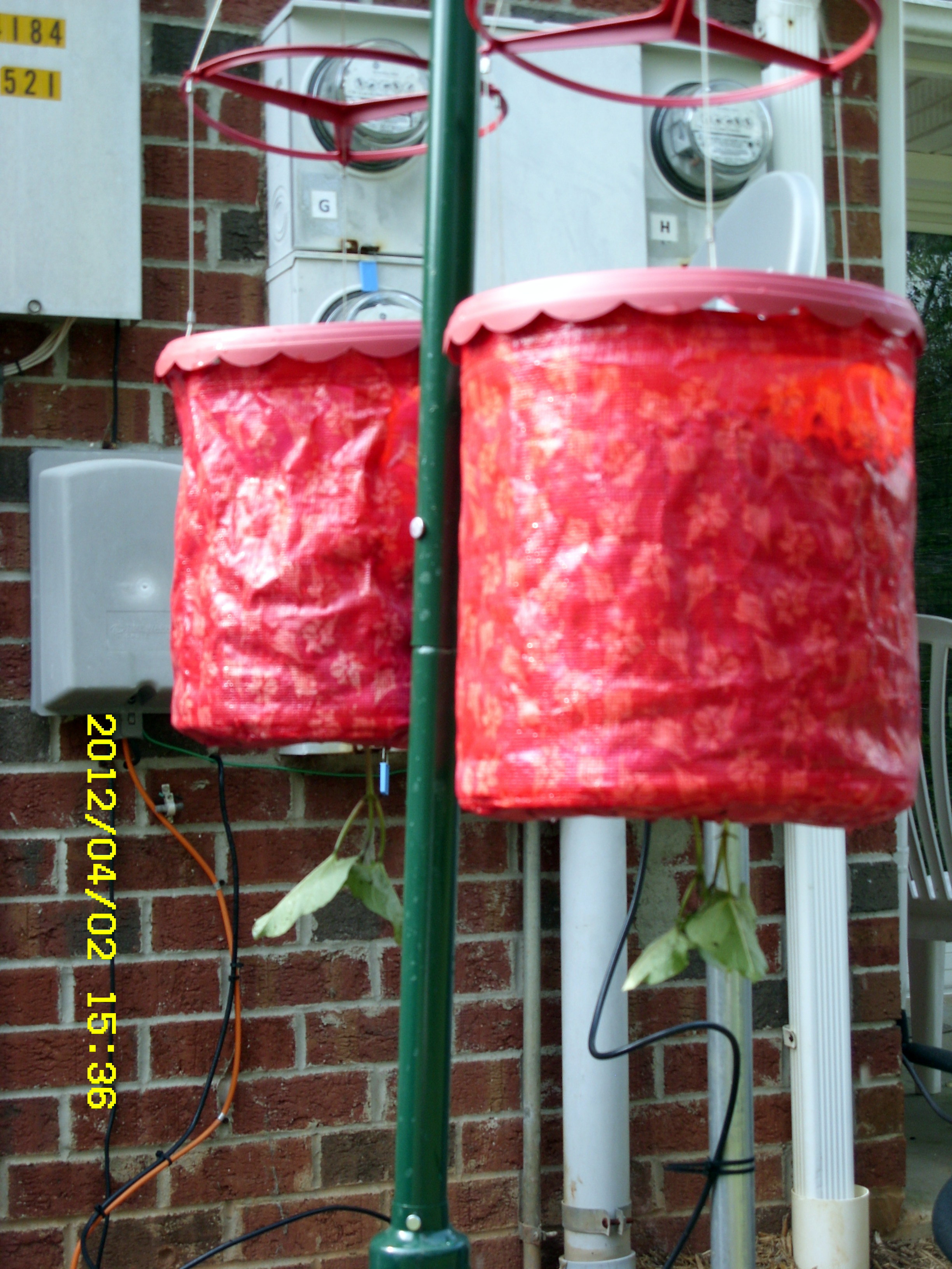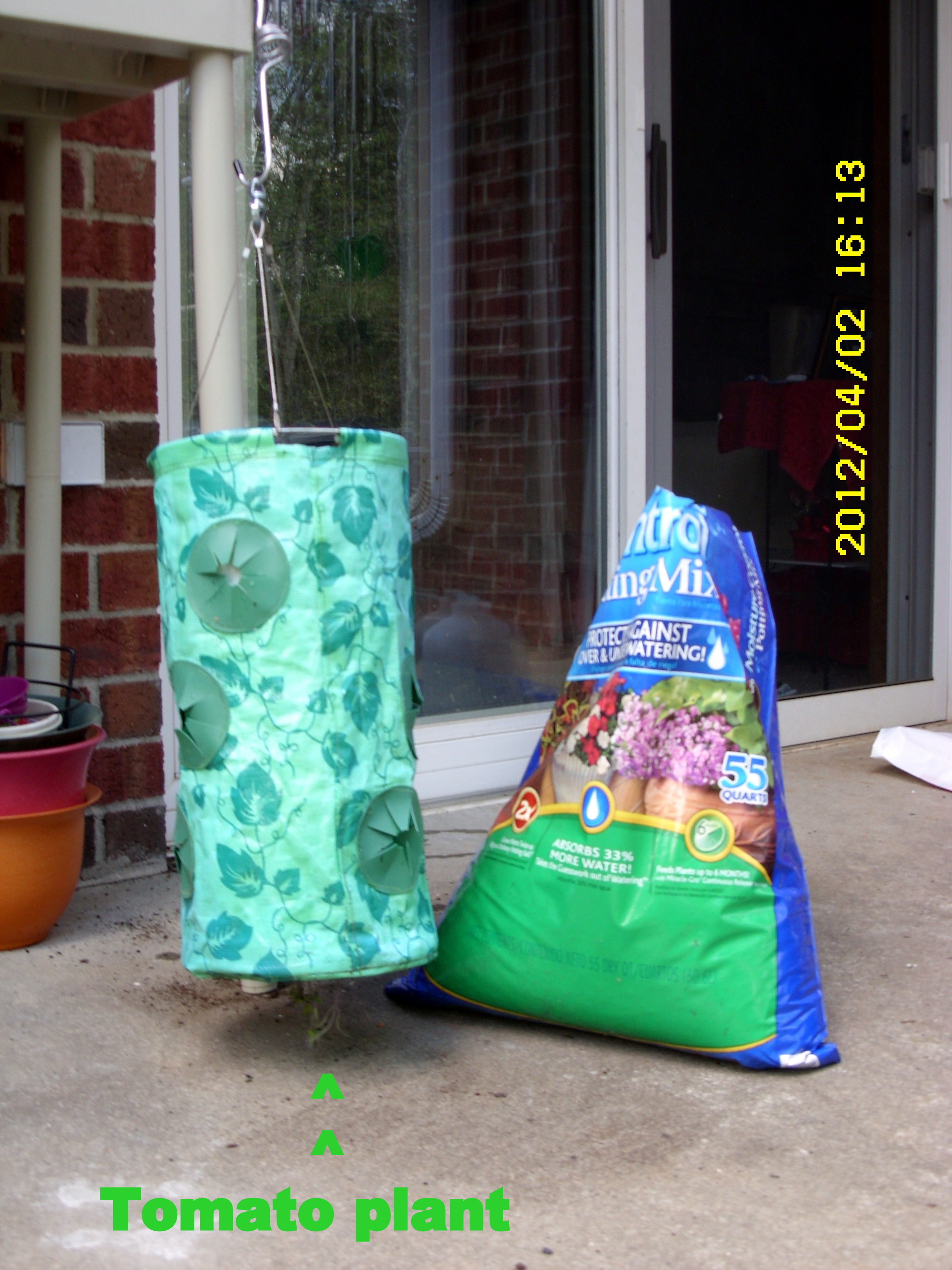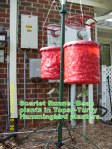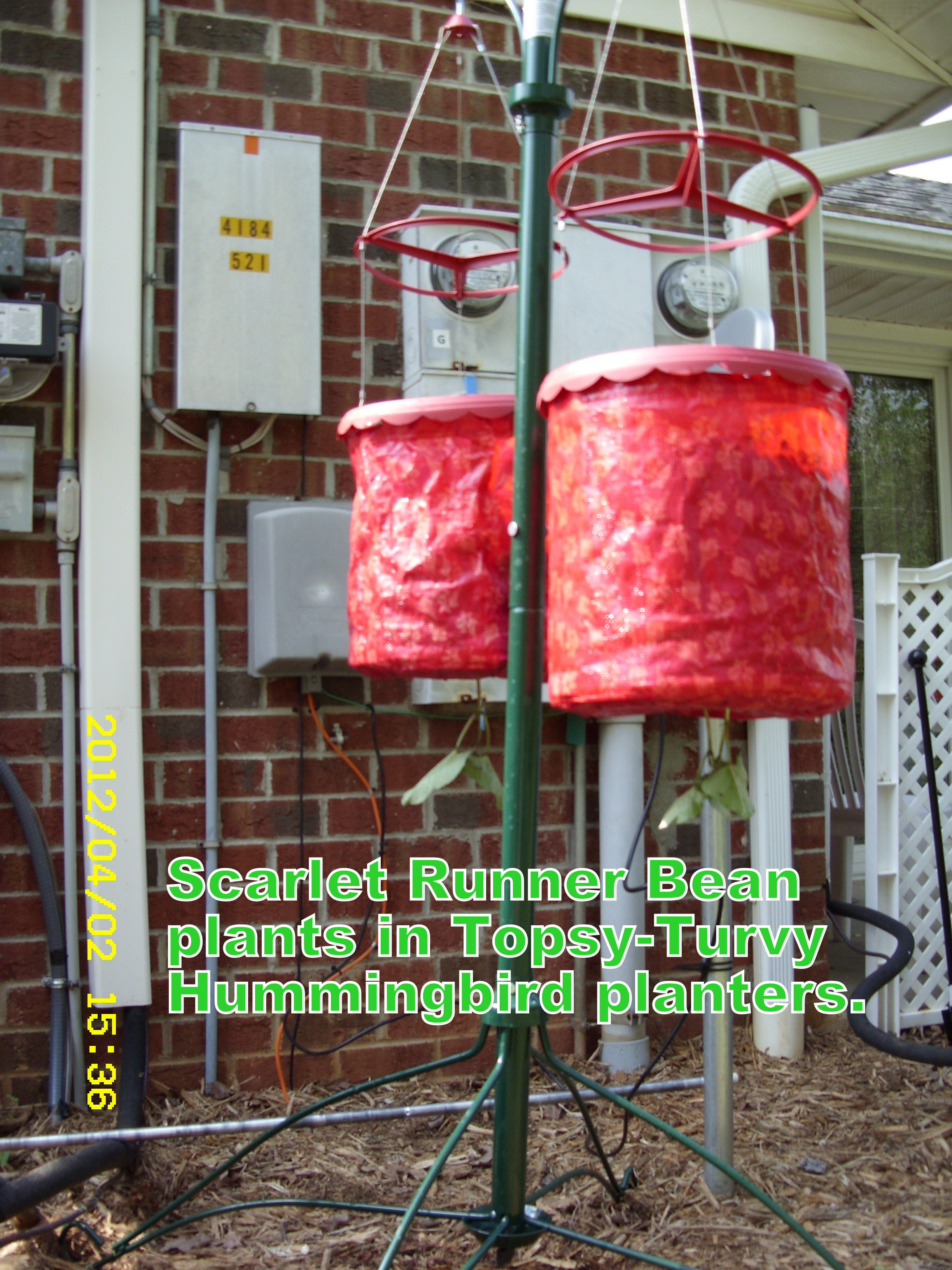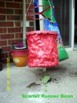 En route home from the chiropractor appointment, I bought two bags of planter soil and two bags of clay chips. (Clay chips for drainage in the pink pails.) I’ve been preparing for this day for many weeks!! Scarlet Runner Bean plants are in the two red Topsy-Turvy upside-down Hummingbird planters. Scarlet Runner Bean plants are in the three pink “paint” pails. A tomato plant is in the green Topsy-Turvy upside-down “pepper” planter. I lined the inside of the planter with heavy plastic so the extra holes are covered. A tomato plant is in the Topsy-Turvy upside-down “strawberry” planter. I lined the inside of the planter with heavy plastic so the extra holes are covered. No hole in the bottom so the tomato plant is peeking from a hole near the bottom. (FYI: The pepper planter was free; the strawberry planter was 99 cents.) I had just finished planting, and watering, when it began to rain. Finally, a few minutes to rest and survey the completed projects. ~~ More seeds have sprouted and will be ready to plant soon. I have two other variety of vines, with red flowers, so eventually I should have lots of color to attract Hummingbirds.