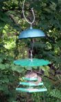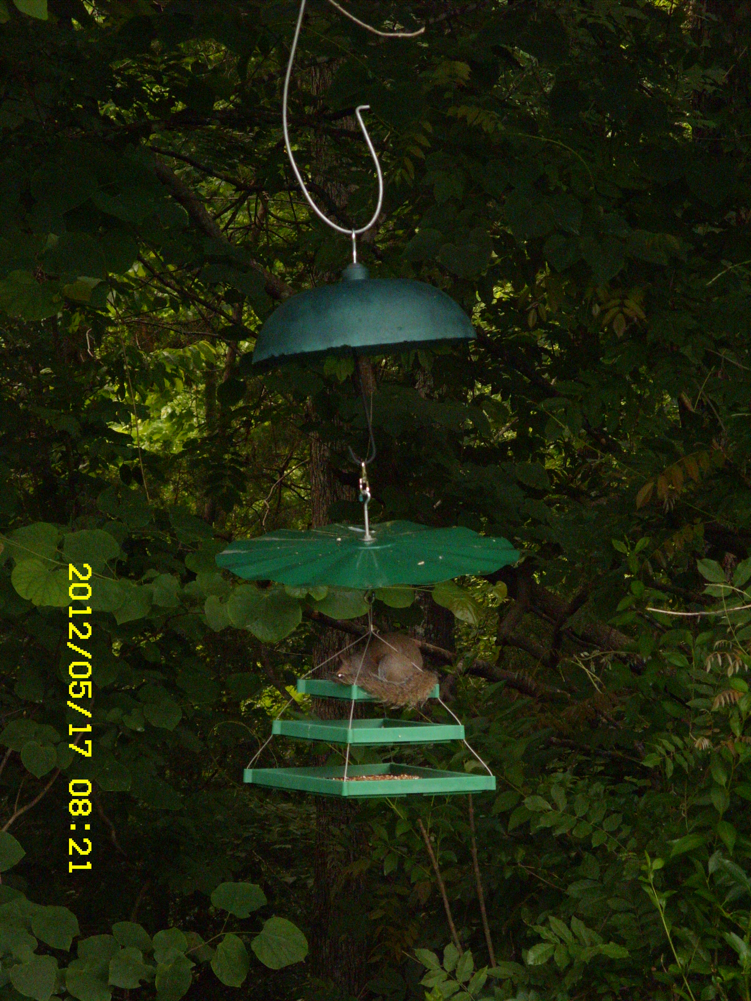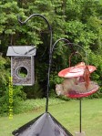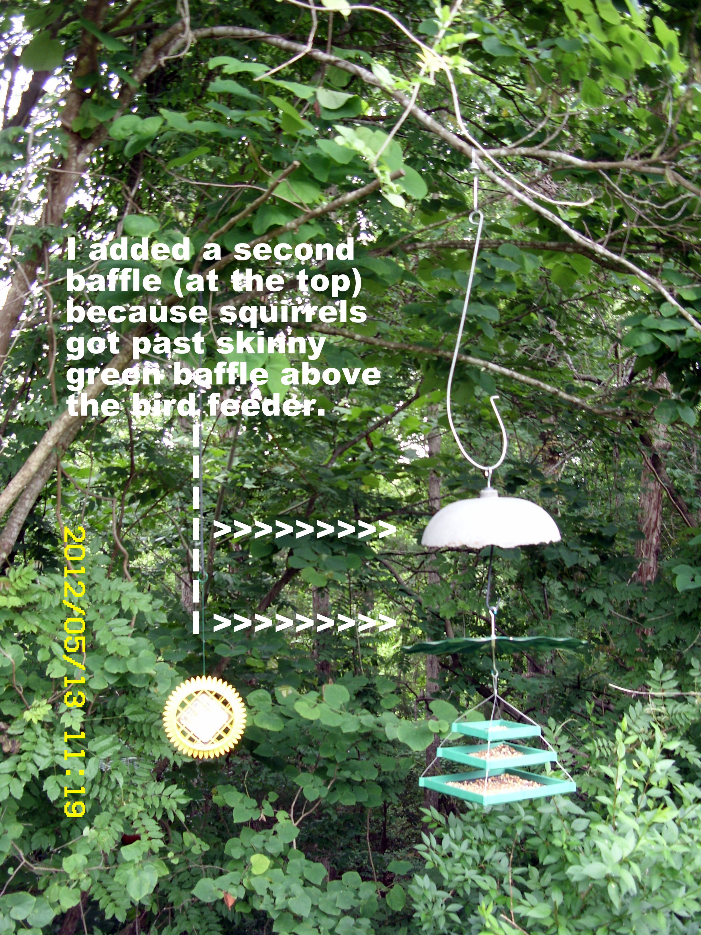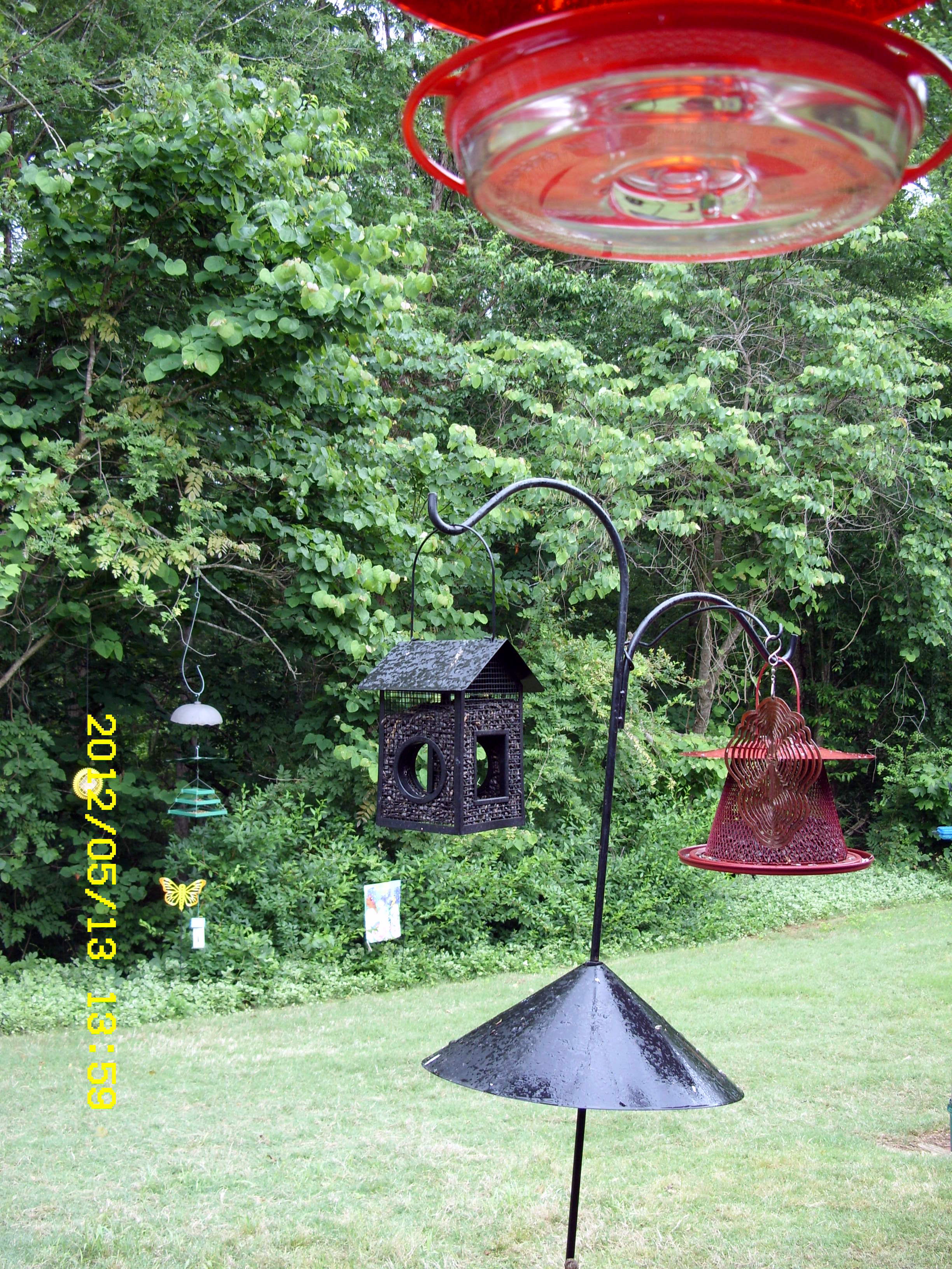 Postscript, Monday, May 14th, 7:00 PM: I added a “Two piece Hanging Basket Spinner” in an effort to keep the squirrels off the birdseed feeder. The information on the package says “Keeps Hanging Baskets from Tangling in the Wind. Great for Plants, Wind Chimes, Bird Feeders, and Other Decorations.” ~~ “Spinners” also added above the red, and black, sunflower seed feeders.