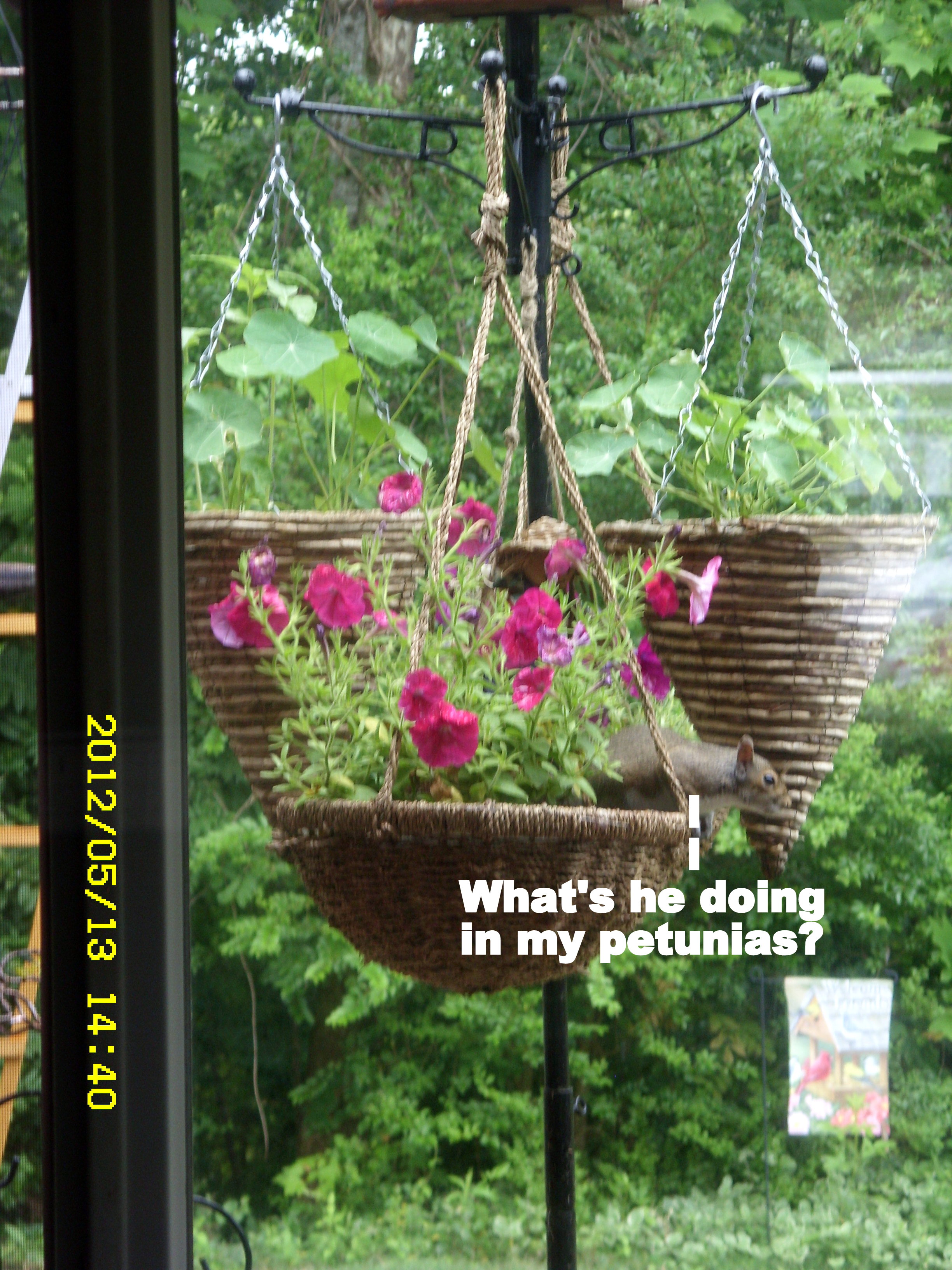 Postscript, 3:00 PM: I always have my camera handy!! I looked out the window (it’s still raining) and observed a squirrel in one of my planters. “Hey, what are you doing in my Petunias?” His answer: “It’s my launching pad to the sunflower seeds!!”