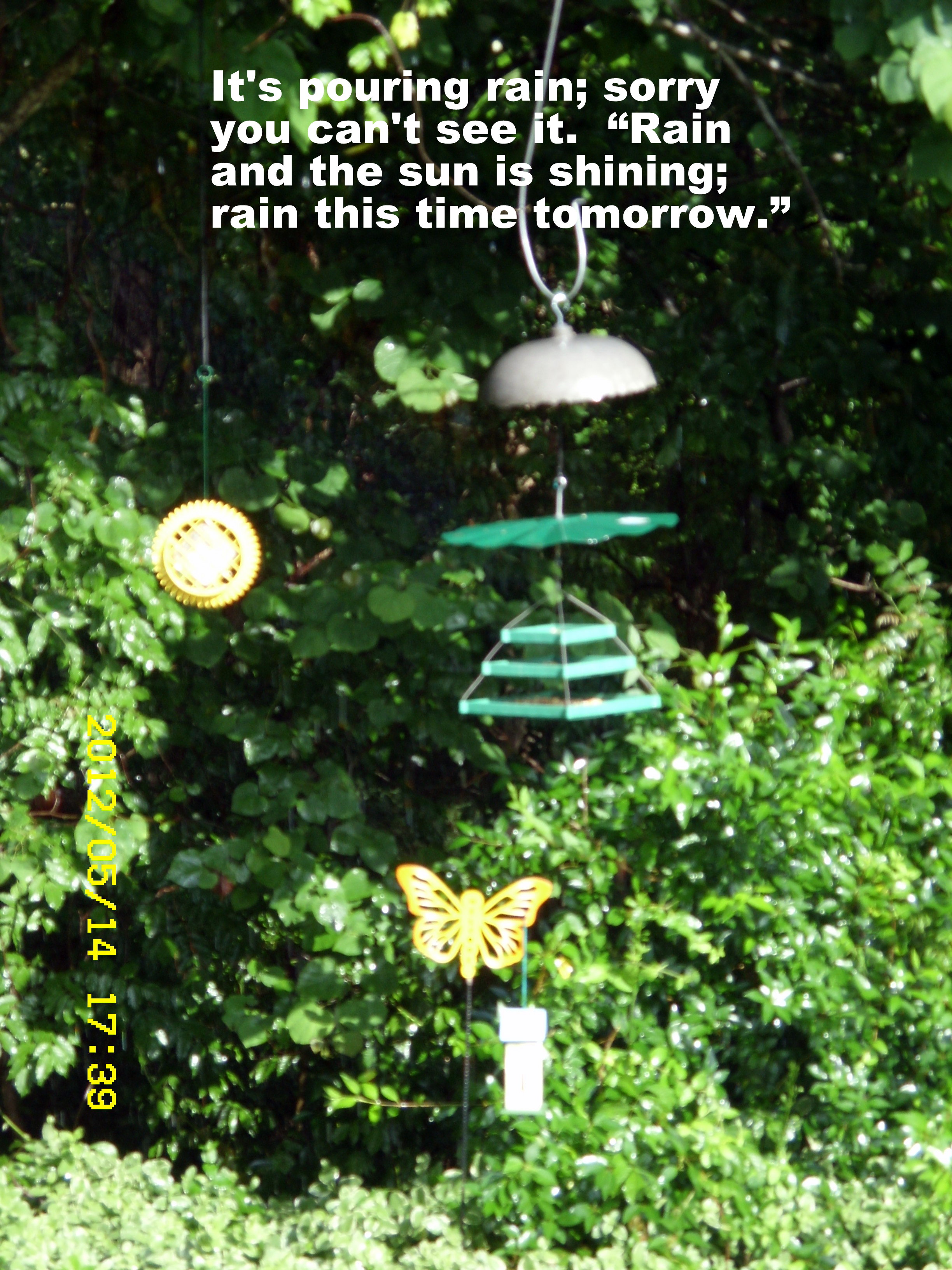 Postscript, 2:00 PM: Moments ago, while I was eating my salad lunch on the patio (before it started raining), a male Ruby-throated Hummingbird enjoyed some nectar from the Hummingbird feeder. Oh joy; a Hummingbird less than four feet from me!! I love my backyard!!