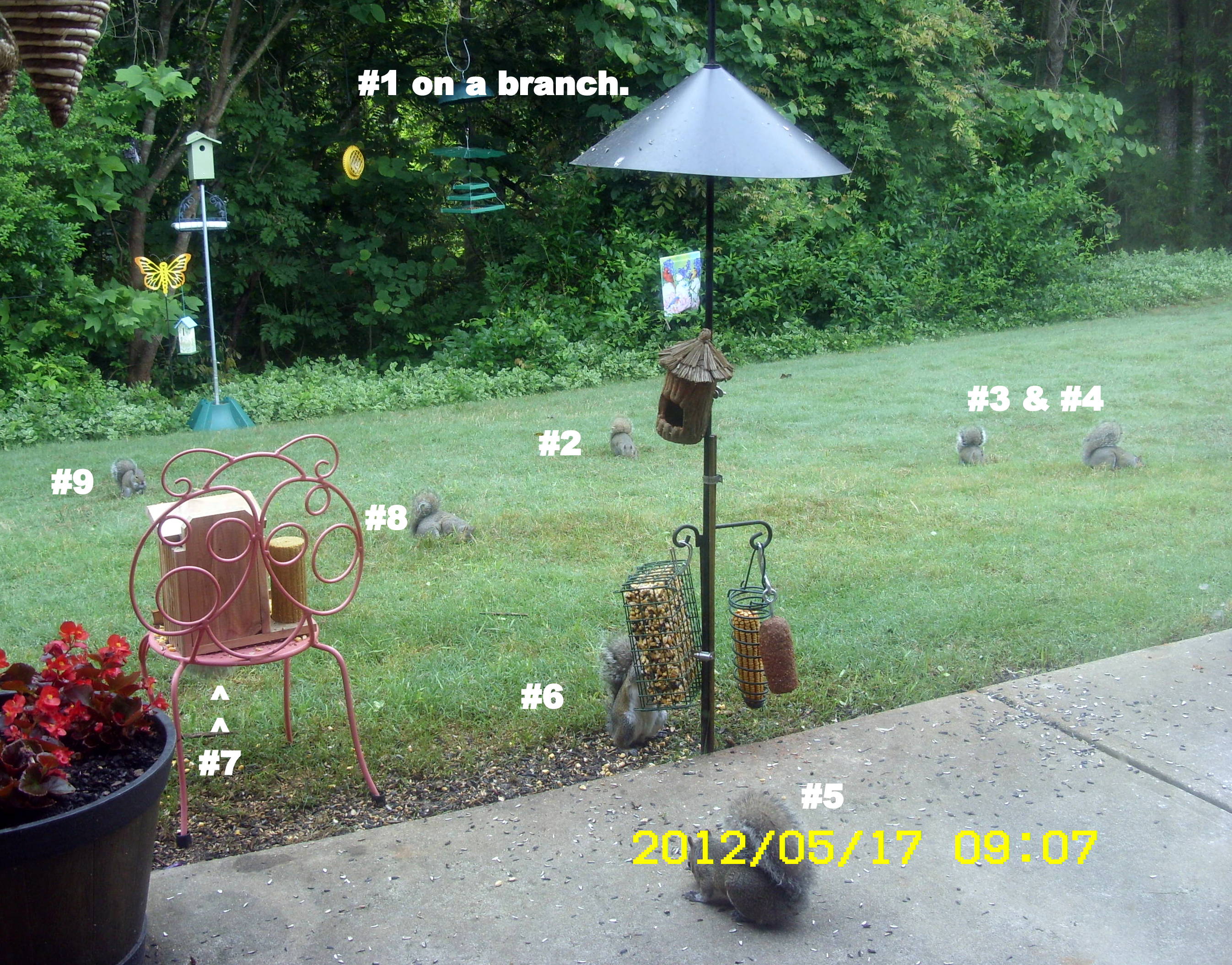 Nine (9) squirrels in my yard this morning!! (I couldn’t get all… in one picture.) It was a circus of acrobatics and high-wire acts. Yes, one squirrel walked down the hook supporting two baffles–and feasted on bird seed. ~~ What’s the solution?? ~~ It is a cloudy, cool morning so I’ve seen more activity than usual. ~~ I’ve squandered the morning watching “the circus,” taking pictures and developing this blog. Yes, I have better things to do with my time!! ~~ (Did you notice? I spray-painted the old baffle green, between the blog titled “Never-ending battle with the squirrels!!” and “What’s the solution??”)
