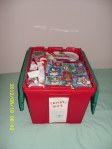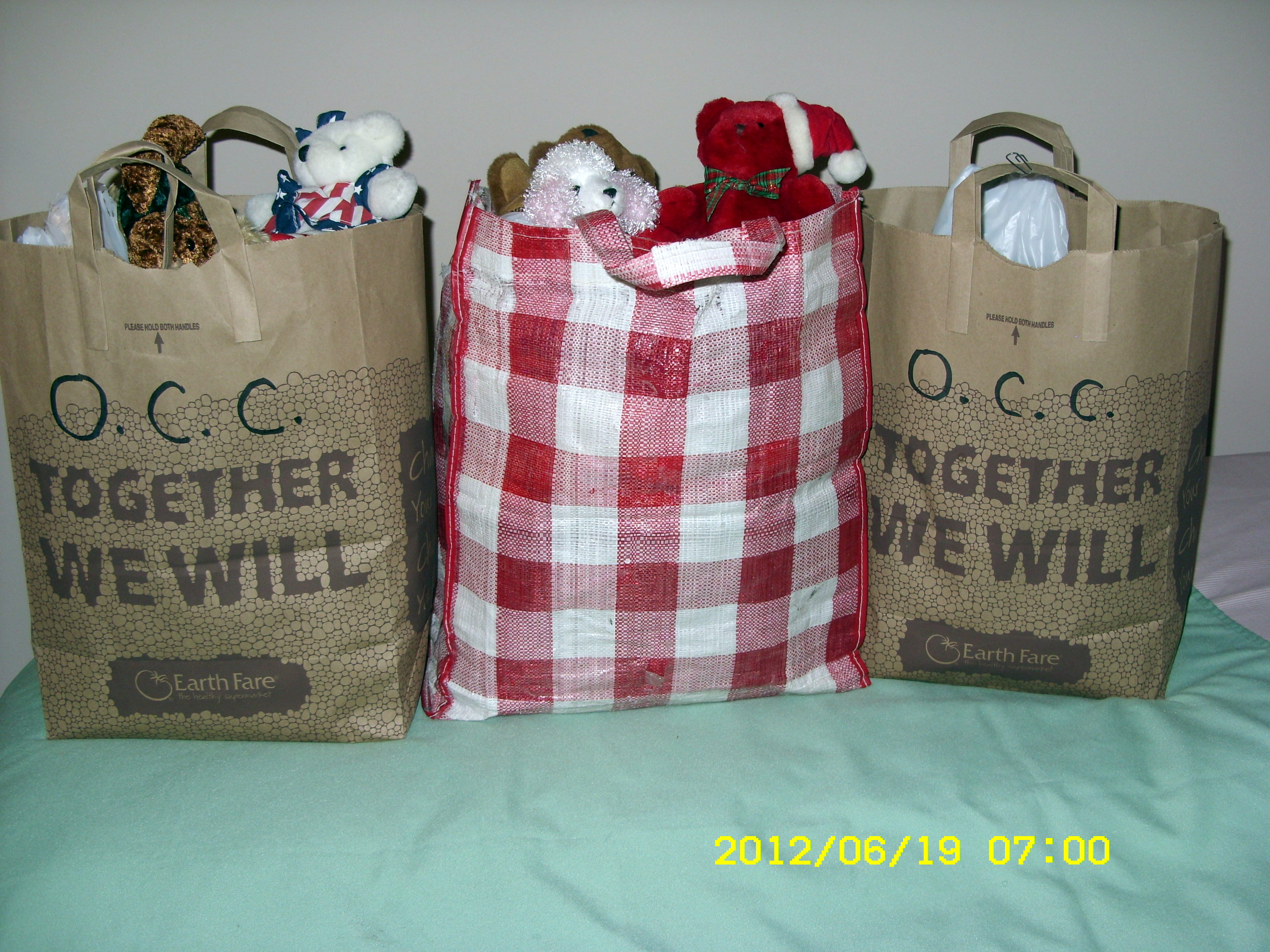 Shopping bags full of “filler” items for Operation Christmas Child shoeboxes. Those are “keepers” until next November.