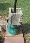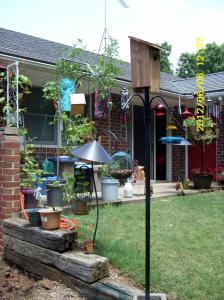 My ritual each evening, when I arrive home from work, is to check my backyard garden. I’ll repeat what I’ve said (here) several times: “I love my backyard garden!!” But this time my heart stopped beating!! I was astonished to see that my Bluebird house was gone!! Not just the house; the wrought-iron post in the “luggable” pail of cement, securing all, had disappeared!! ~~ The gardener had been doing some work in the adjoining yard–where I had positioned the ensemble several weeks ago–and moved my pride and joy up next to my Topsy-Turvy upside-down tomato planters. Quite unexpectedly (quite rare!), the maintenance supervisor appeared in our backyard and I sobbed, and stammered “My poor babies,” and “Mama Blue and Papa Blue must be traumatized, too.” The supervisor moved the ensemble back to its original location. I sat discretely inside my living room next to the patio doors; I watched but did not see the Bluebird couple return to the bird house. This morning I watched but no Bluebird couple. I put out fresh mealworms in hopes they might be lured back. This evening, twenty-four or twenty-five hours later, I witnessed the Bluebird couple taking food into the bird house. I was thrilled to see them!!