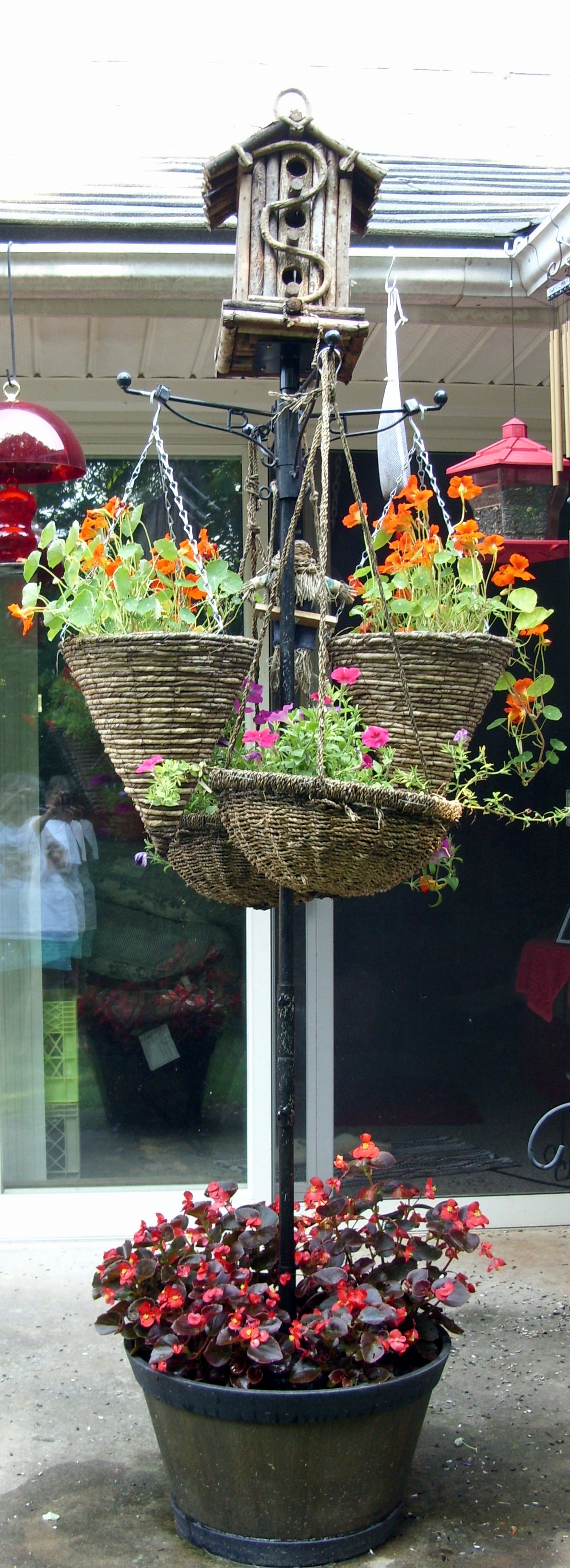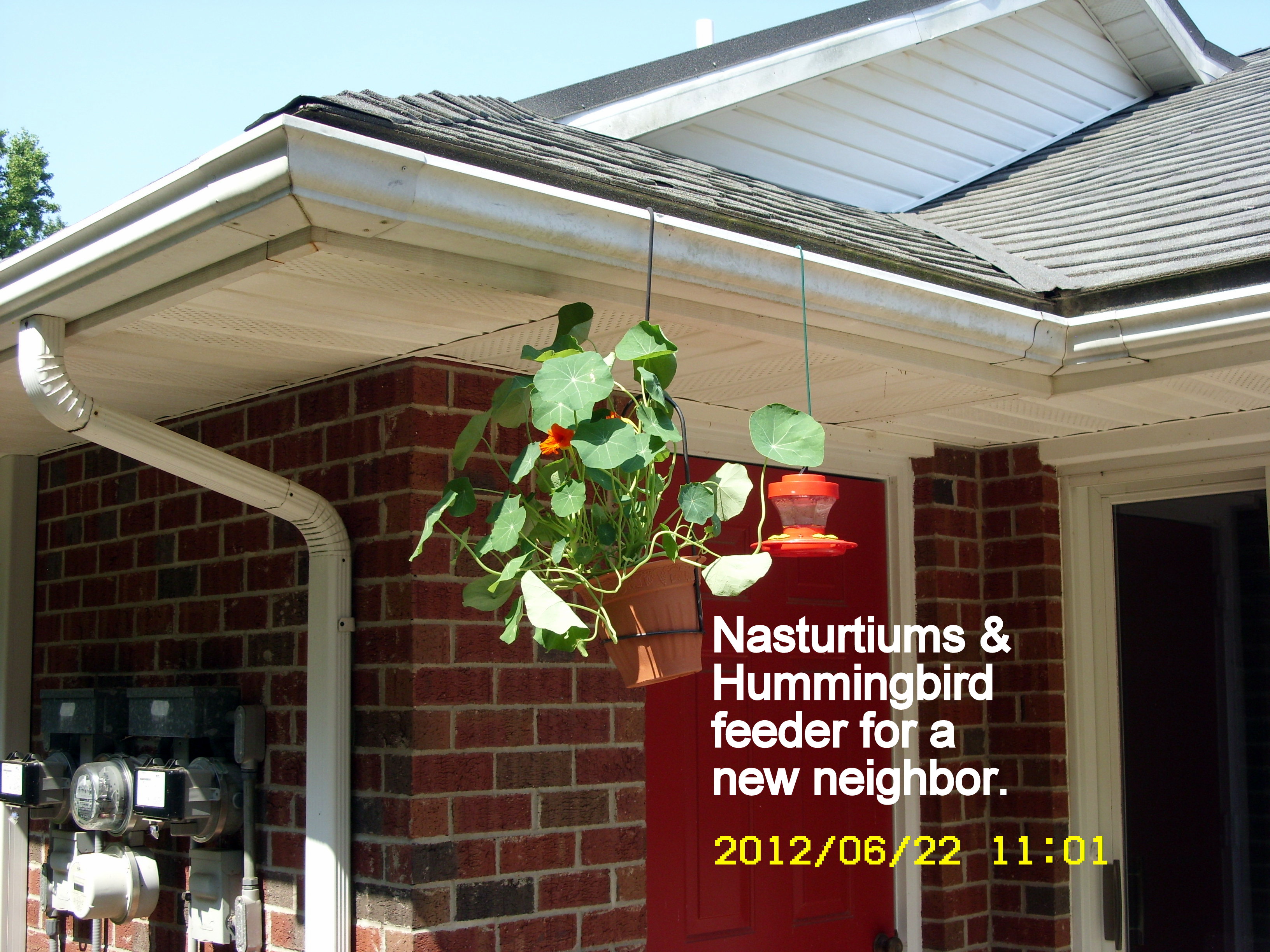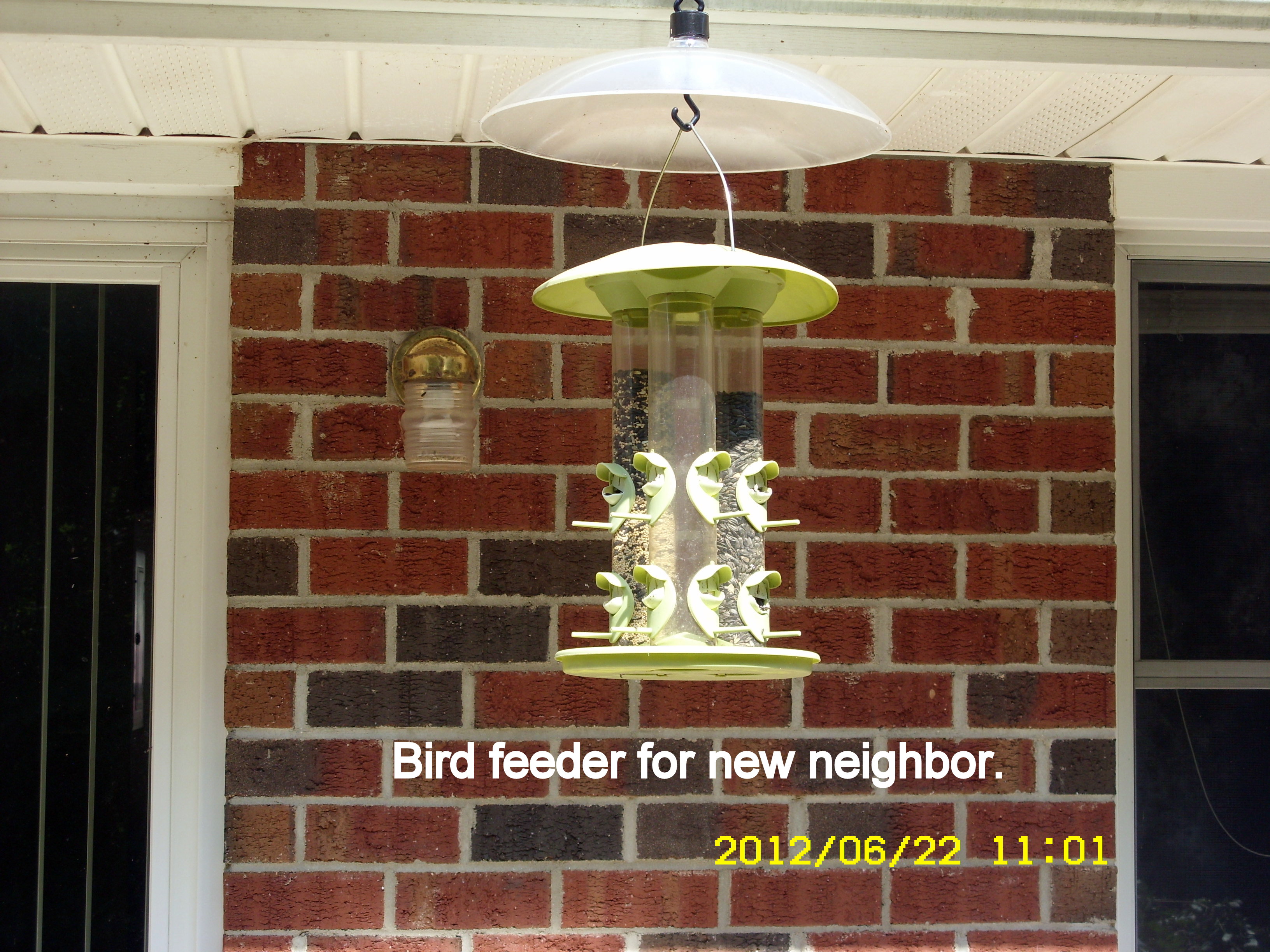 My ritual each evening, when I arrive home from work, is to check my backyard garden. I’ll repeat what I’ve said (here) several times: “I love my backyard garden!!” But this time my heart stopped beating!! I was astonished to see that my Bluebird house was gone!! Not just the house; the wrought-iron post in the “luggable” pail of cement, securing all, had disappeared!! ~~ The gardener had been doing some work in the adjoining yard–where I had positioned the ensemble several weeks ago–and moved my pride and joy up next to my Topsy-Turvy upside-down tomato planters. Quite unexpectedly (quite rare!), the maintenance supervisor appeared in our backyard and I sobbed, and stammered “My poor babies,” and “Mama Blue and Papa Blue must be traumatized, too.” The supervisor moved the ensemble back to its original location. I sat discretely inside my living room next to the patio doors; I watched but did not see the Bluebird couple return to the bird house. This morning I watched but no Bluebird couple. I put out fresh mealworms in hopes they might be lured back. This evening, twenty-four or twenty-five hours later, I witnessed the Bluebird couple taking food into the bird house. I was thrilled to see them!!