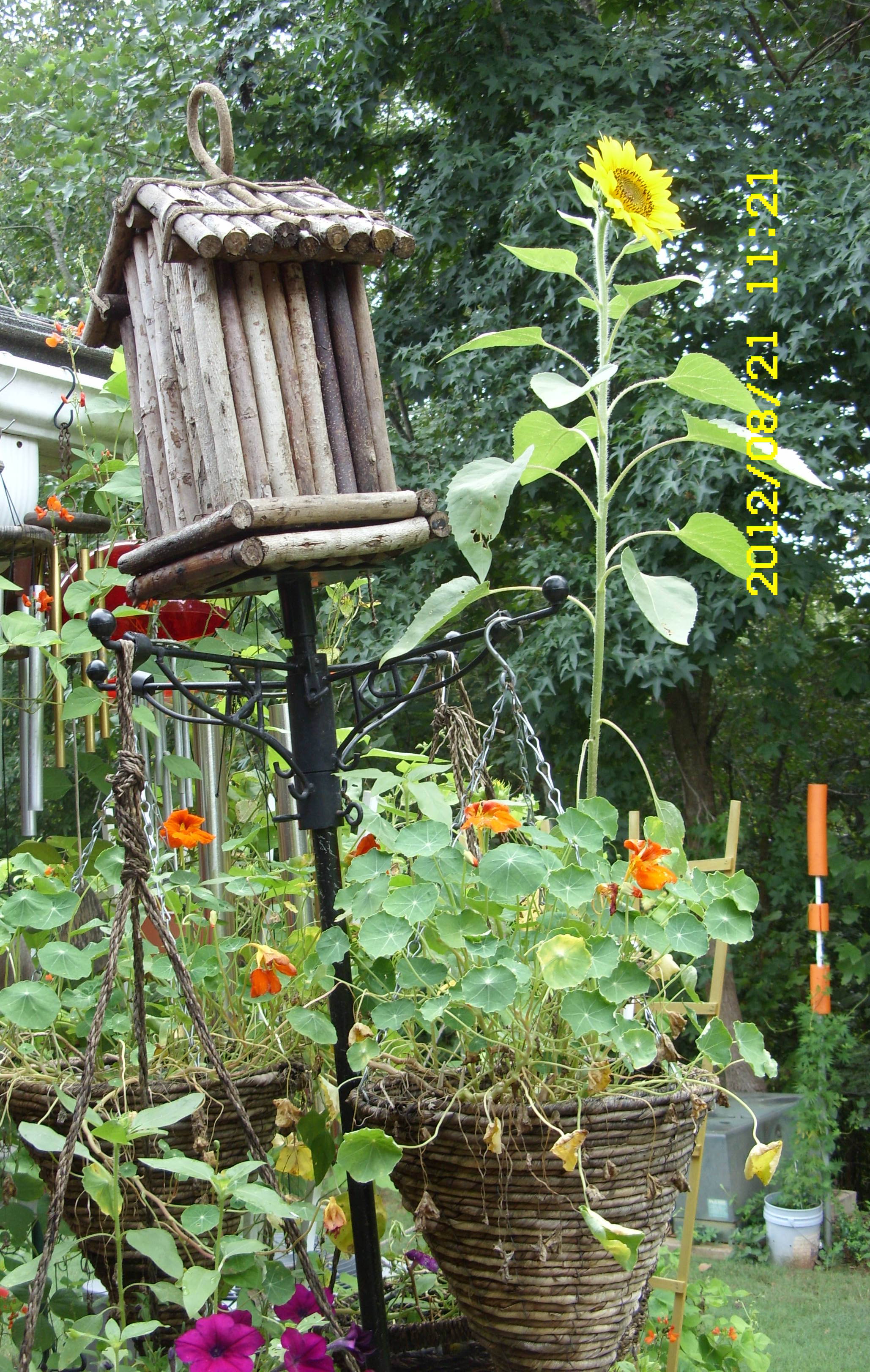 Because I have a Sunflower growing with the Petunias, I was reminded of the amusing little story about a Lonely Little Petunia in an Onion Patch. Well, specifically, this (lonely little) Sunflower is in a planter with Nasturtiums but Petunias are in adjacent hanging basket planters. Earlier in the season, I removed foreign plants, and weeds, when they made an appearance. This plant grew surprisingly fast and has very limited space for its roots. I admire its perseverance!!
