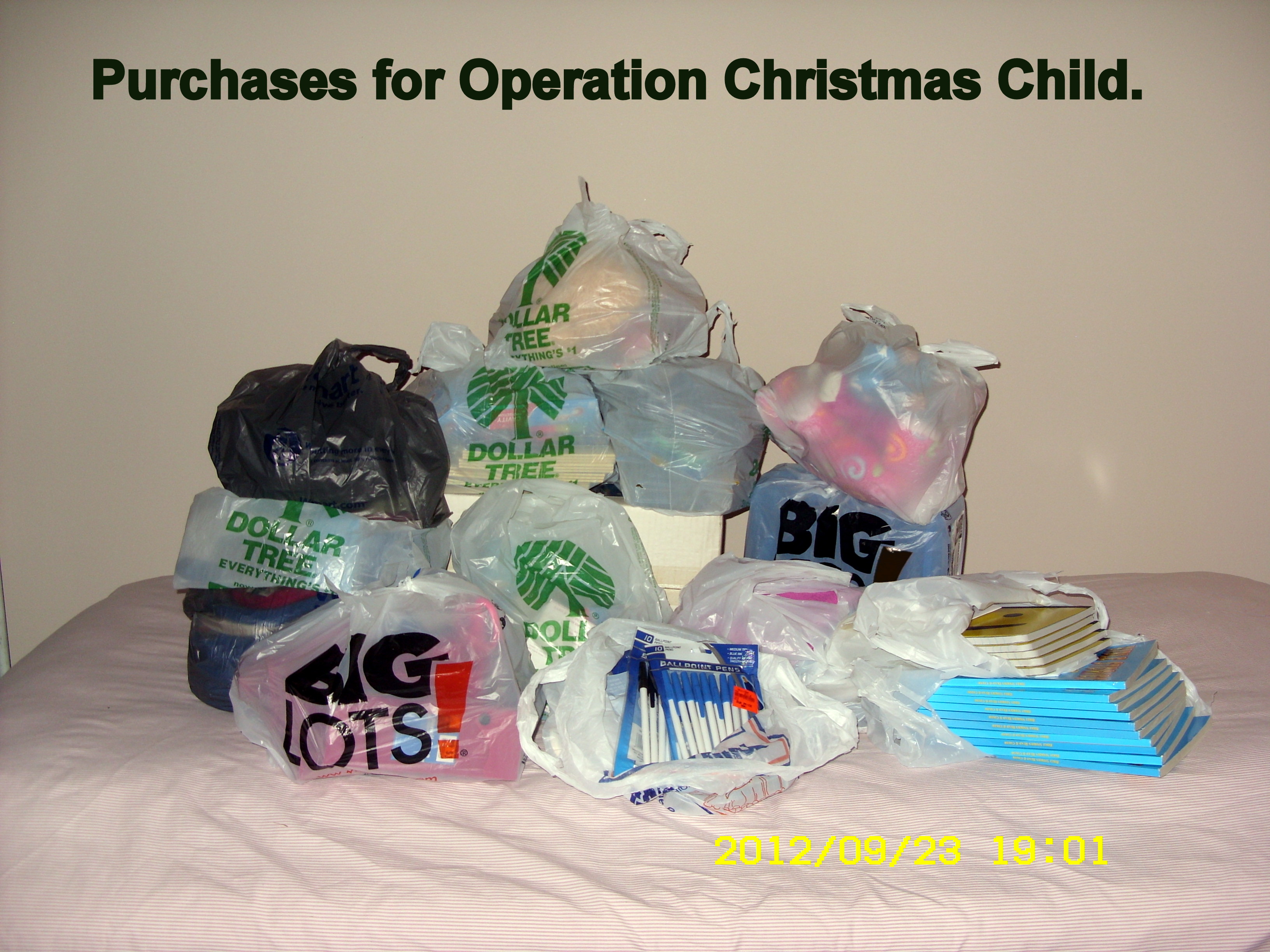 Because I haven’t documented details of my mini-vacation, and I haven’t published pictures from the trip, you haven’t read about my visit to Samaritan’s Purse and Operation Christmas Child International Headquarters in Boone, North Carolina. It was inspirational to enjoy a tour of the facilities. ~~ On that trip, I browsed Dollar Tree, Ollie’s, Walmart, etc., etc., and bought an enormous number of items for shoeboxes for Operation Christmas Child. (Fourteen bags of merchandise transferred from the car to my apartment!! Seriously!! They were added to the bags, and boxes, of items purchased earlier this year.) ~~ Here is a gentle reminder that we all have to participate if we want to help Samaritan’s Purse reach their goal.