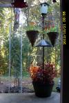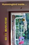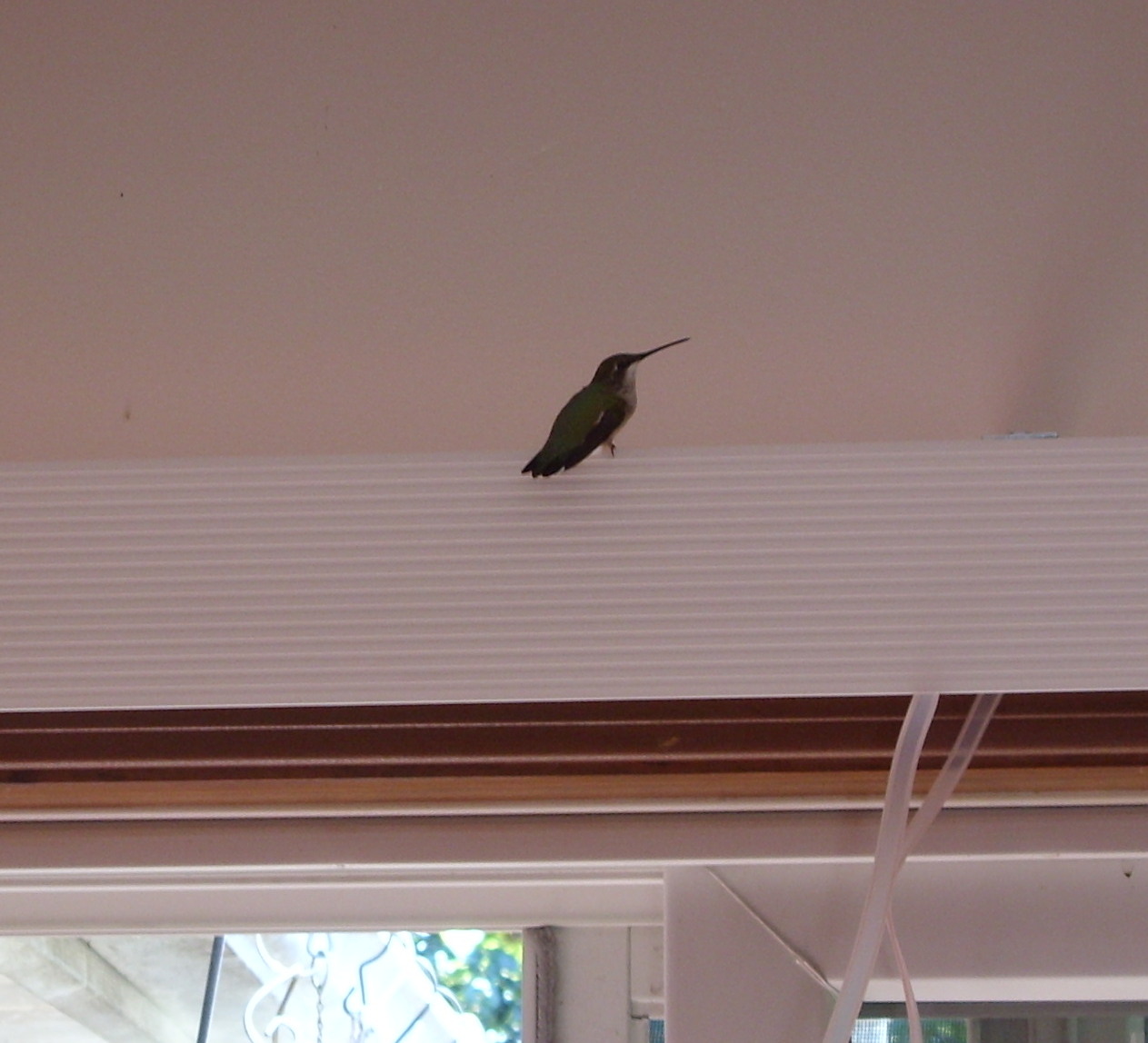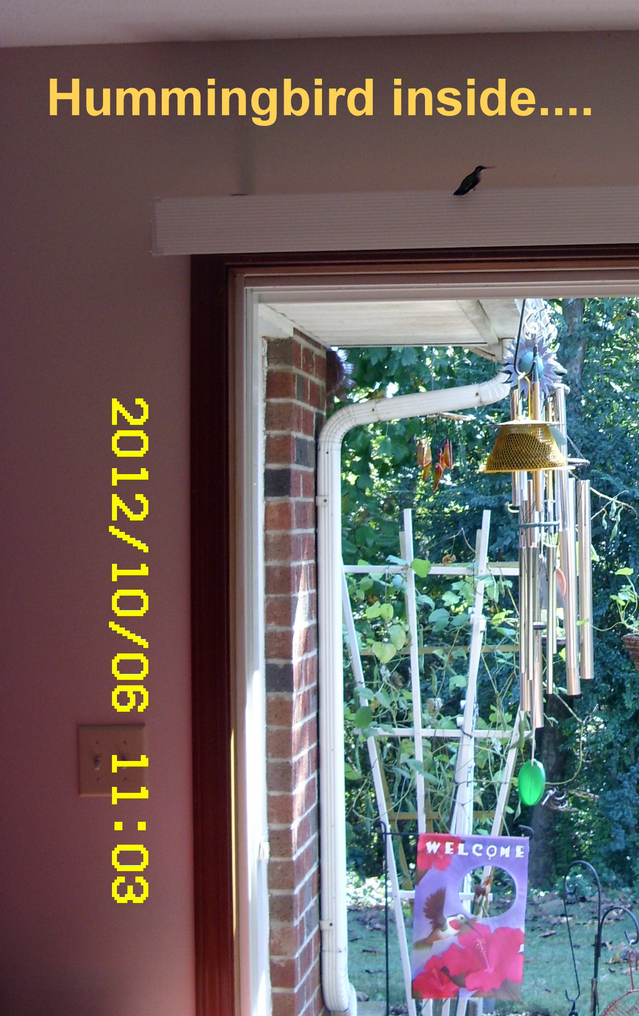 Over the months, I have “recycled” things I hauled from California to North Carolina. Galvanized pipe for Topsy-Turvy upside-down tomato planters, and trellis created from PVC pipe. This trellis (moved from an earlier location) has metal pipe frame and metal loops and bows decorations. Backyard enhancements created at nominal expense (“loops and bows” from Goodwill). Some of my plants were purchased from the “mark downs” at the back of Lowe’s garden center. This Honeysuckle bush was rescued from discards here at the apartment complex. It had been out of the ground for several weeks so I’m giving it a lot of “tender loving care.” I hope it flourishes and provides lots of blossoms, next Spring & Summer, for Hummingbirds. ~~ Speaking of Hummingbirds: One was inside my apartment briefly. With the front and back doors open, it found its way out. ~~ Visit this earlier blog message.