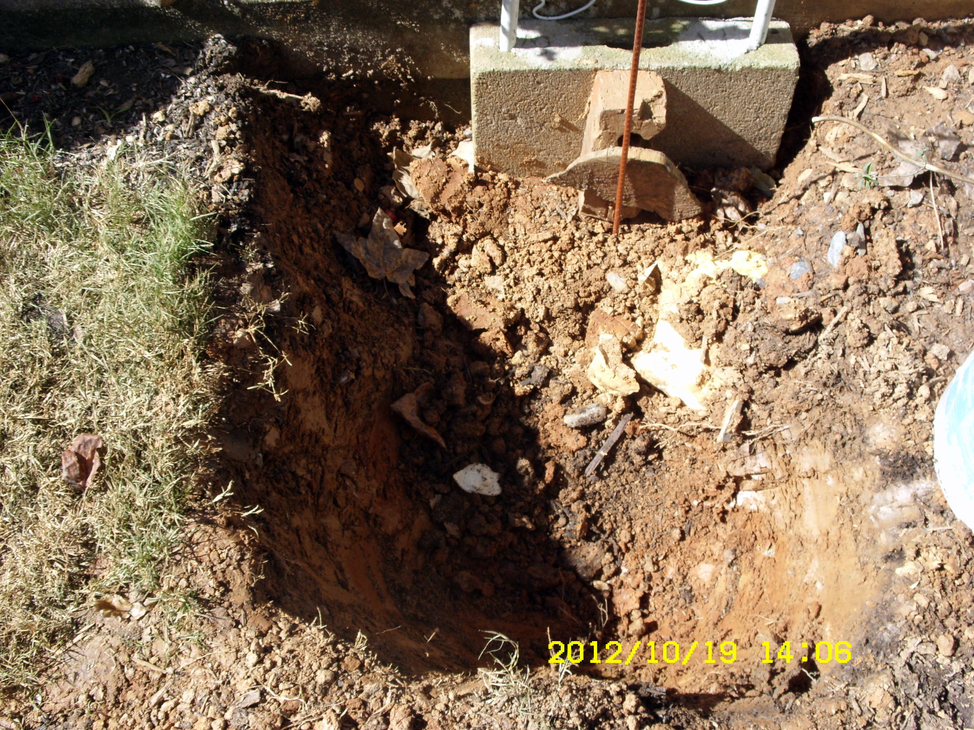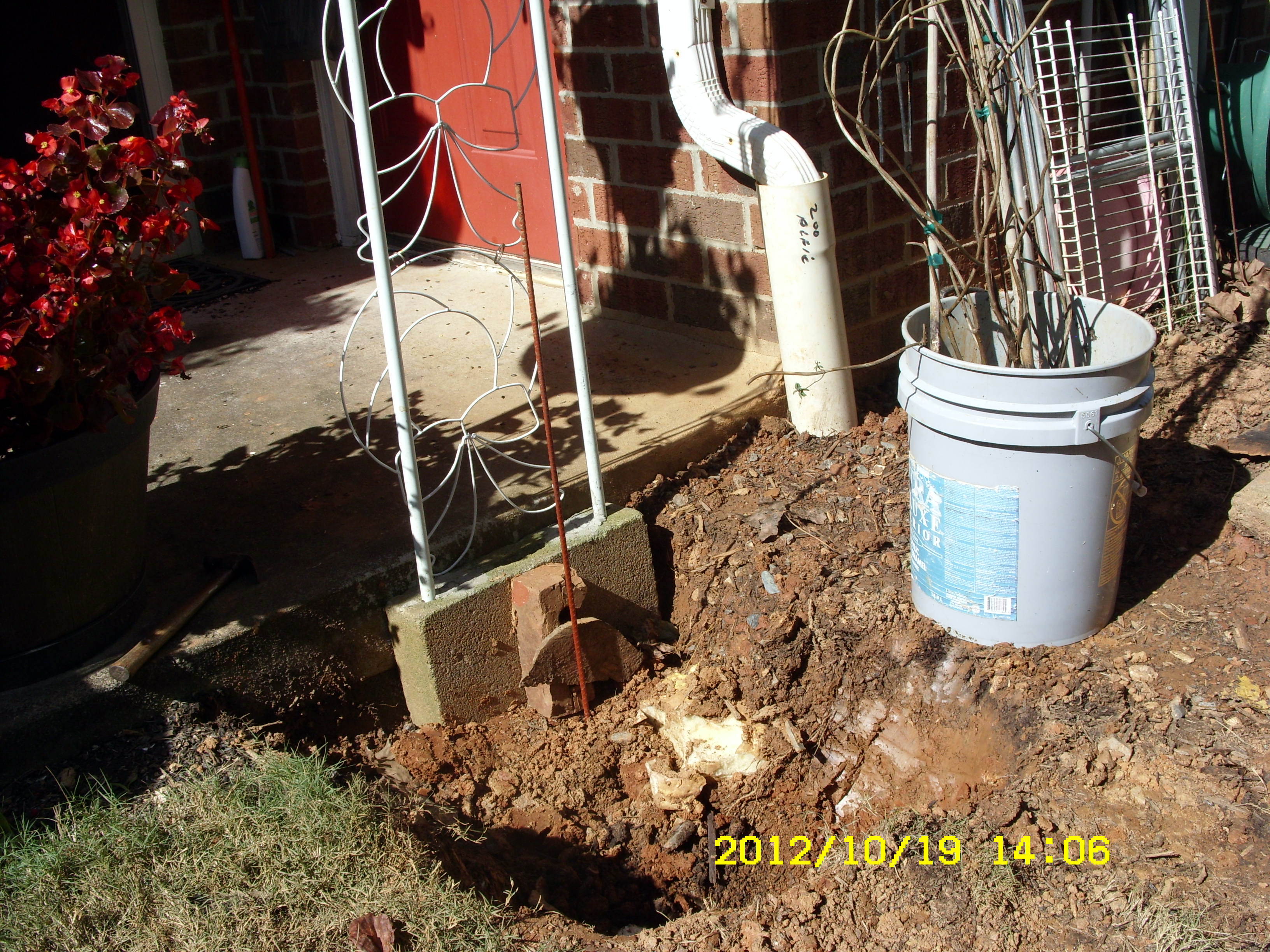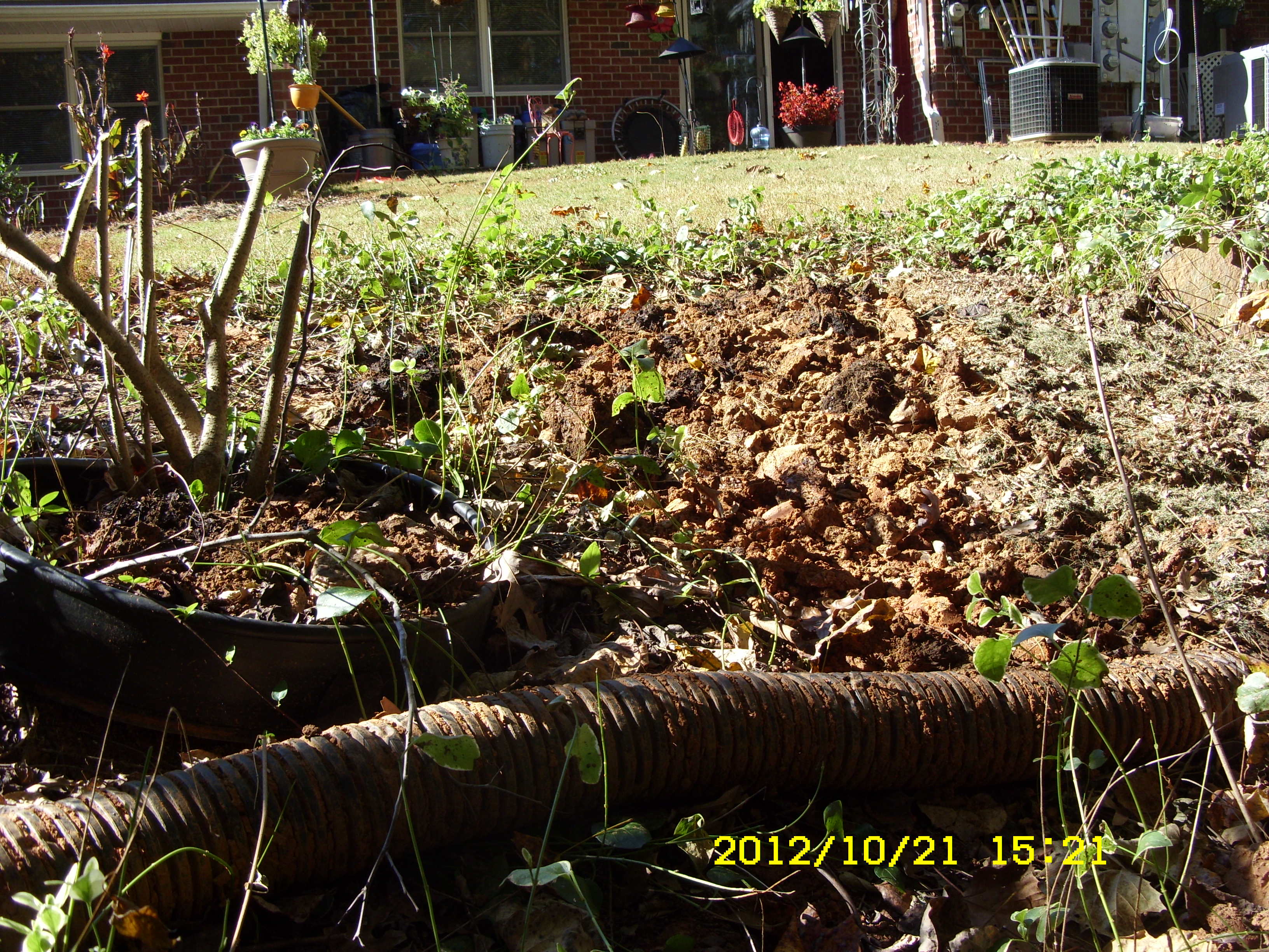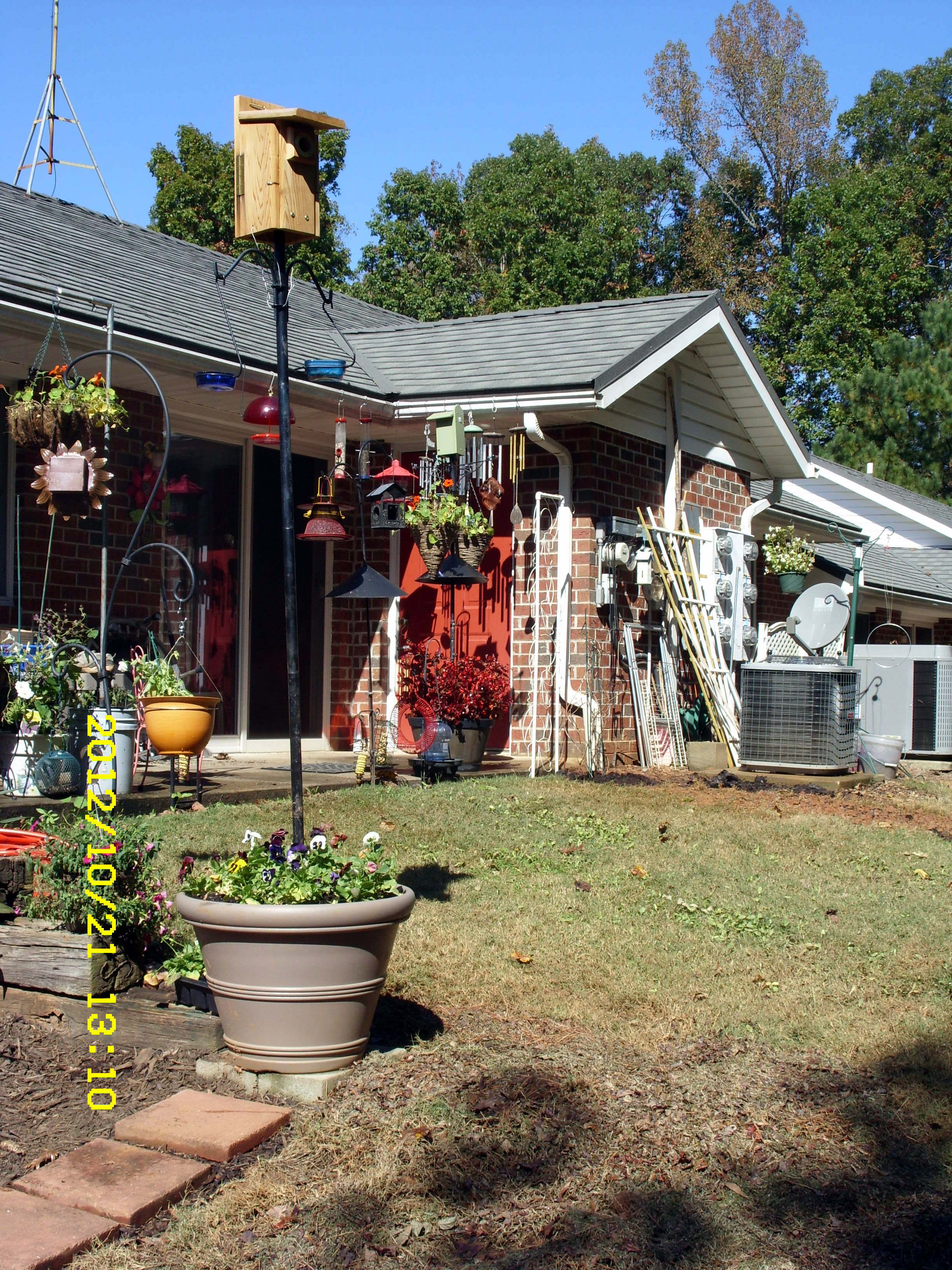 This old lady has to pace herself!! The digging of heavy red clay is tiring!! I have carried each shovelful to the edge of the woods. ~~ It is a BEAUTIFUL day and I forced myself away from the previous blog message so I could dig dirt from edge of cement slab footing for the air-conditioner. I want to add another trellis there and plant Morning Glories next Spring. I added mulch/compost there and more around the Honeysuckle bush. ~~ “Maintenance” has had a BIG project in the adjacent backyard and until a few days ago I had to look at piles of red clay in my yard, and the neighbor’s yard. (The drain pipes were full of roots and the gutters could not carry away the rain water.) So-o-o-o-o, there have been shovels, rakes, pitchforks, etc., available to “this old lady.” Furthermore, in an effort to repair the destroyed lawn, trailer loads of mulch, and compost are positioned nearby. Hear ye, hear ye, it has been imperative that I take advantage of the tools, mulch and compost while it is available!! “Maintenance” is overjoyed to share with me because many (many, many) residents call them to plant a rose-bush, or dig out a Honeysuckle bush (etc., etc.). “Overjoyed!!” ~~ Compare the pictures of my back yard two weeks ago with today. Trellis’ have been removed or repositioned. The pink pails, and Topsy-Turvy baskets (with dying plants), have been removed and their soil added to the hole dug for the Honeysuckle bush. The Bluebird house–weighted into the recently acquired planter–has a new foundation and recently planted Pansies. ~~ “Yes,” I have spent a lot of time (and energy) in my yard the last couple of weeks!! (Click each picture to enlarge for more details.)