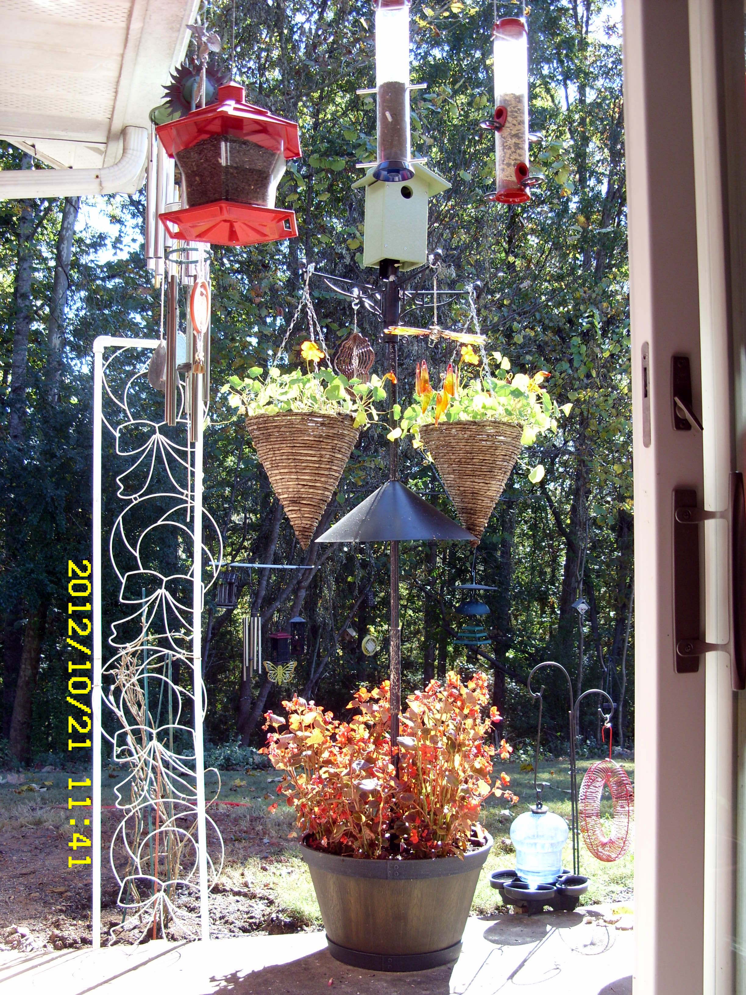 Perhaps you can sympathize with me and appreciate why I choose to spend so much time in my backyard garden?!?! I really need to “downsize” but not a week goes by that I am not buying something for the yard. This past week, I shopped two Goodwill stores and bought planters and plant stands. (How could I pass up a large planter for $2.00??) Recently I got an exceptionally good buy, at Tuesday Morning, on attractive large planters. I had looked at them–for months–priced at $26.00 each. On my recent trip, I found them at the Mooresville store, marked down plus another 70% off. I bought the four available planters for less than one at the original price!! Hallelujah!! This week (at Tuesday Morning) I bought more garden items with “70% off ticketed price.” ~~ Because I wanted to shop the second Goodwill store, I drove to Lancaster, South Carolina (something I rarely do). I discovered the K-Mart is closing (“going out of business”) so stopped and headed for the garden department. I bought four bags of organic planter soil, and several bags of bird seed. I’m already so anxious for Spring so I can arrange planters, fill with soil, and plant flowers and Topsy-Turvy upside-down tomato plants!! ~~ After reading ideas in a book about “container gardens,” I’m eager to do something “unique” with the planters and plant stands. ~~ Chide me about this acquisition: At Goodwill, next to their dumpster, I saw a disassembled, broken baby crib. I instantly recognized the rectangular metal springs would make a perfect trellis. In my mind’s-eye, I see Scarlet Runner Bean vines twining around links (and far more attractive than the macrame rope used for a trellis earlier this year). ~~ Yes, I’m anxious for Spring!!