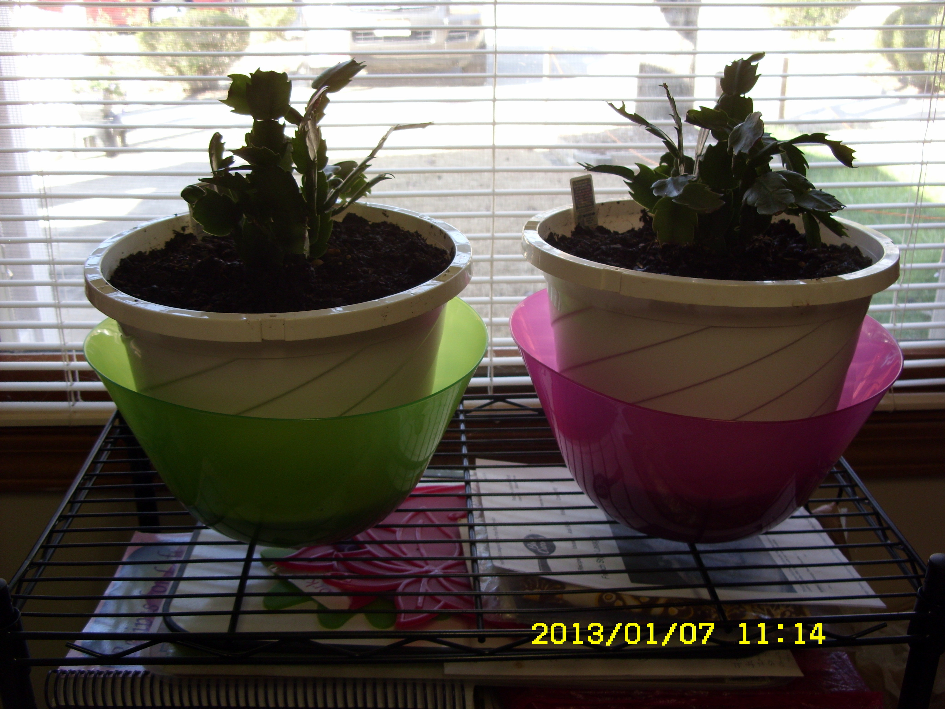 For all my good intentions, I goofed!! I bought two Christmas Cactus from the mark downs (at Lowe’s) for $1.00 each.  They were in tiny little planters, bone dry, and looking neglected.  Within hours, I transplanted them into pots from my huge collection, in planter soil I already possessed.  I soaked the soil; I soaked the roots of the Christmas Cactus.  I put them outside on my patio.  Then–and only then–I decided to go to the Internet and research Christmas Cactus.  I had done everything wrong!!  The planter soil should have been mixed with sand; there should have been far less water!!  Definitely no direct sunlight!!  See the pink, and green, bowl??  The base of each is full of small rocks so moisture, and humidity, from below the cactus.  (Eventually I may obtain shallow dishes for a base [as suggested on the Internet] but I already had these [from Goodwill, for another garden project] so used them.) Now my newest garden acquisitions are at the kitchen window and I will protect them from direct sunlight.  They may not survive but I’ll give them tender loving care in hopes they reward me with flowers next November and December.