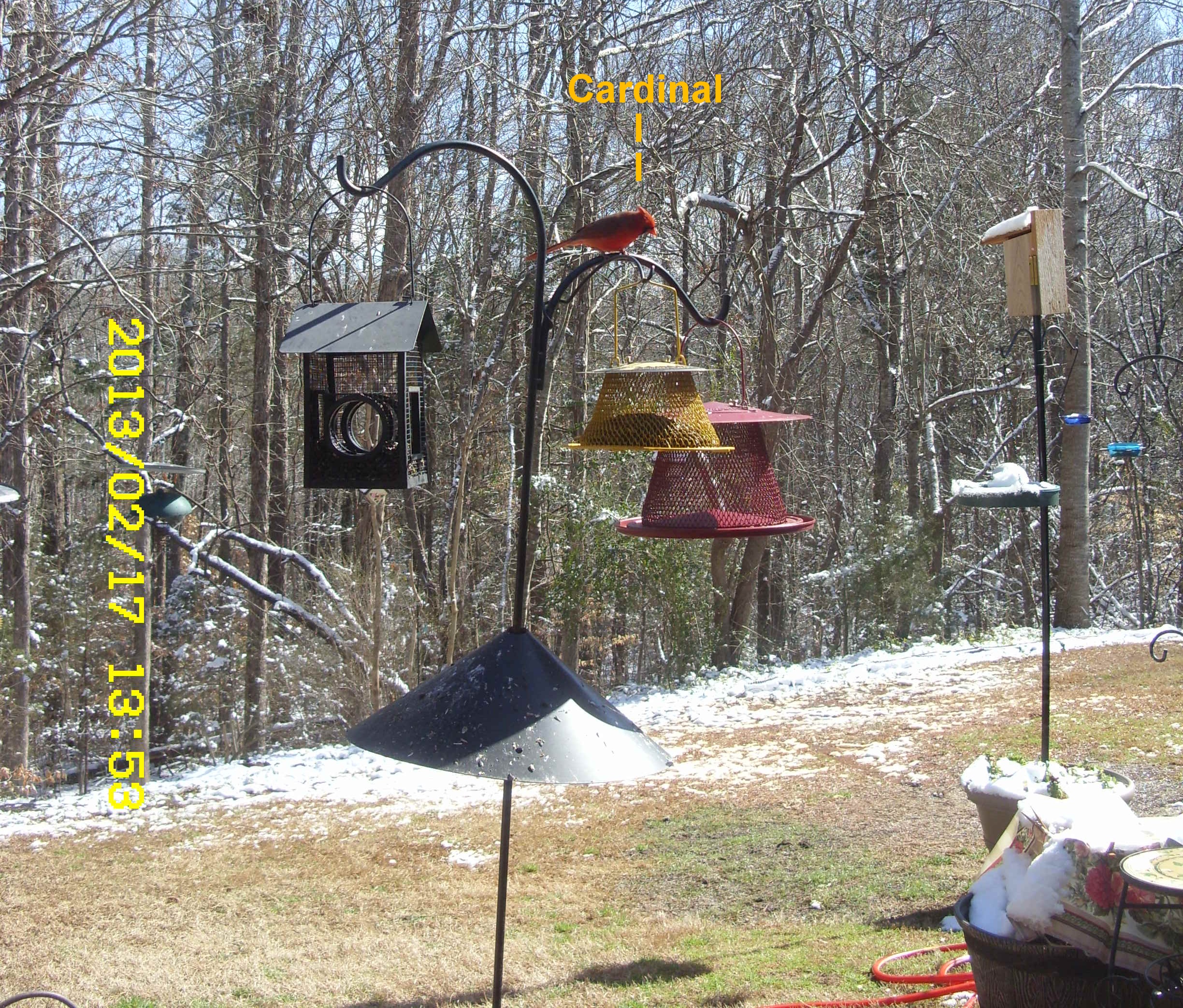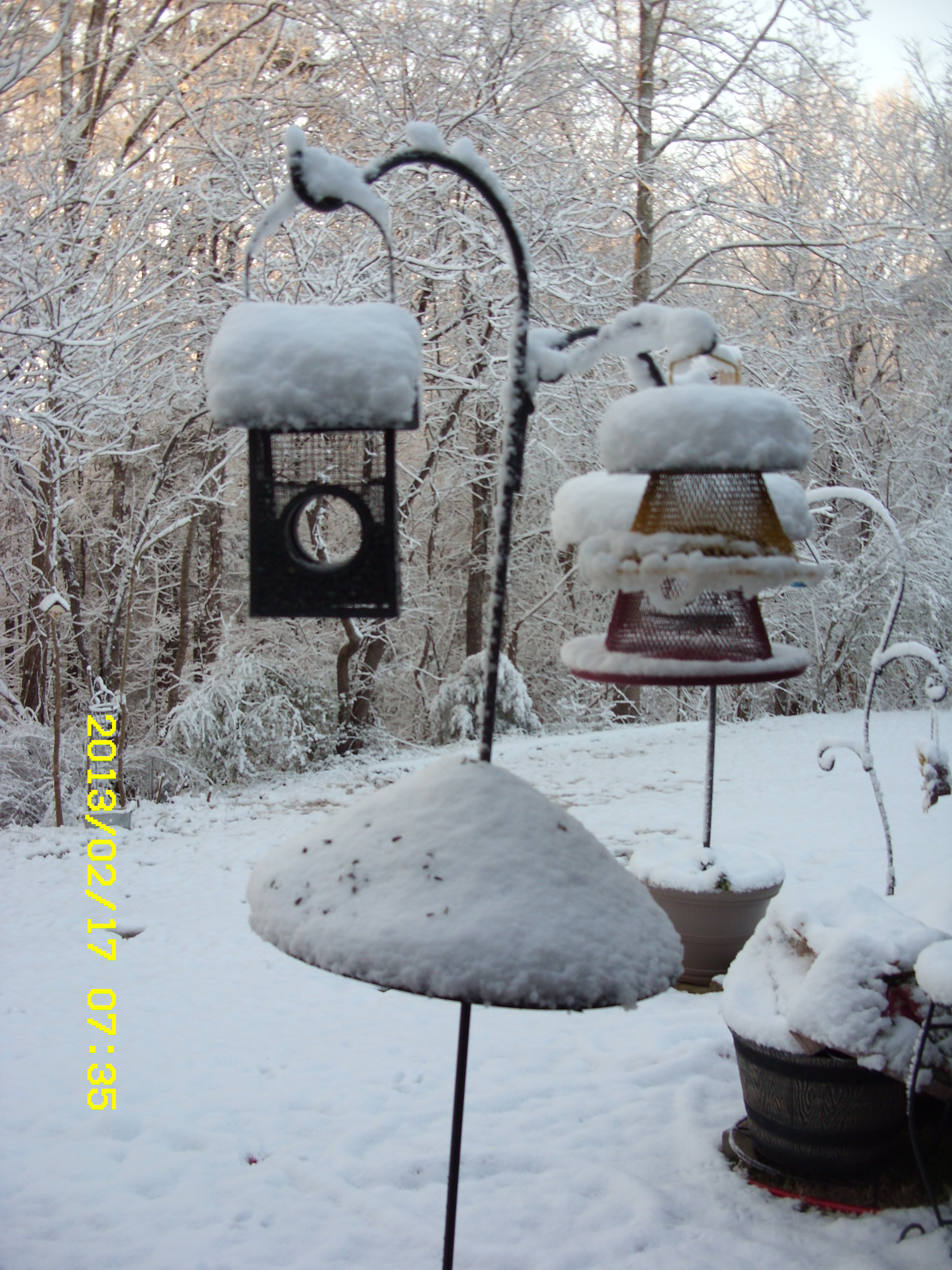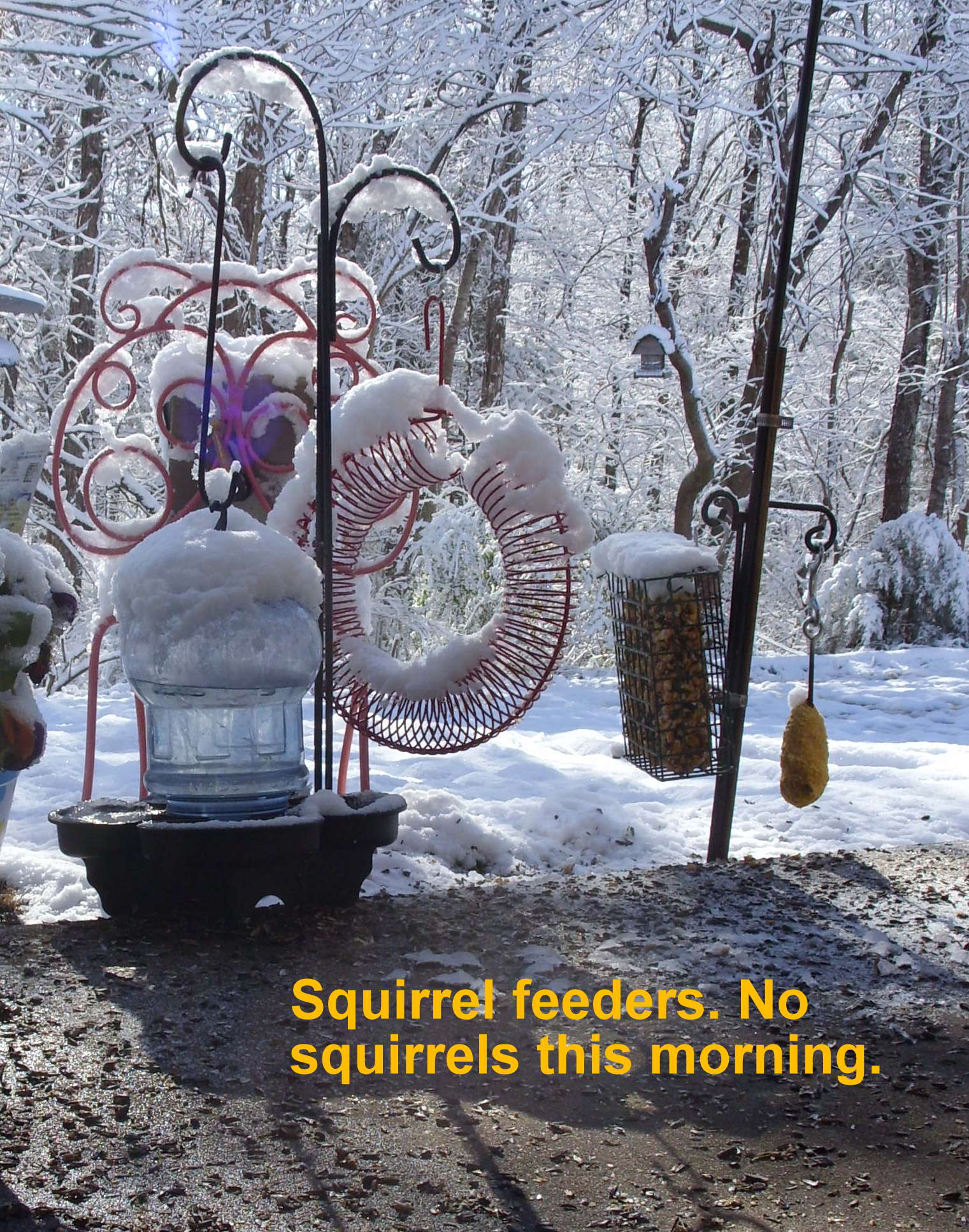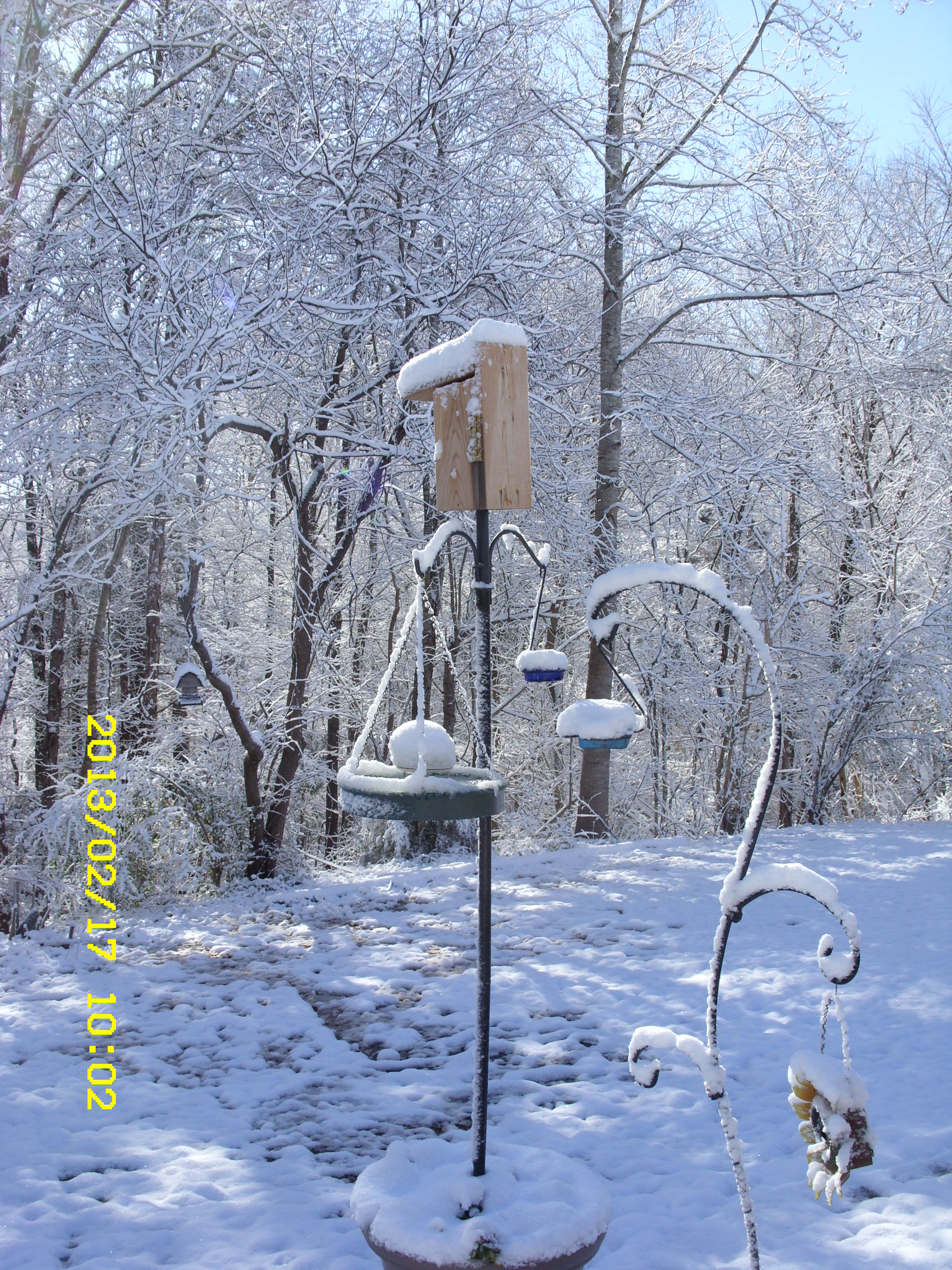 Sunday, Feb. 17, 2013. I must confess that I am partial to “my” Bluebirds. I look forward to Spring and Summer when they make a nest and lay eggs in the Bluebird house. I’m always amused by the antics of the squirrels. One squirrel feeder is obscured behind the water container, in the snow picture.