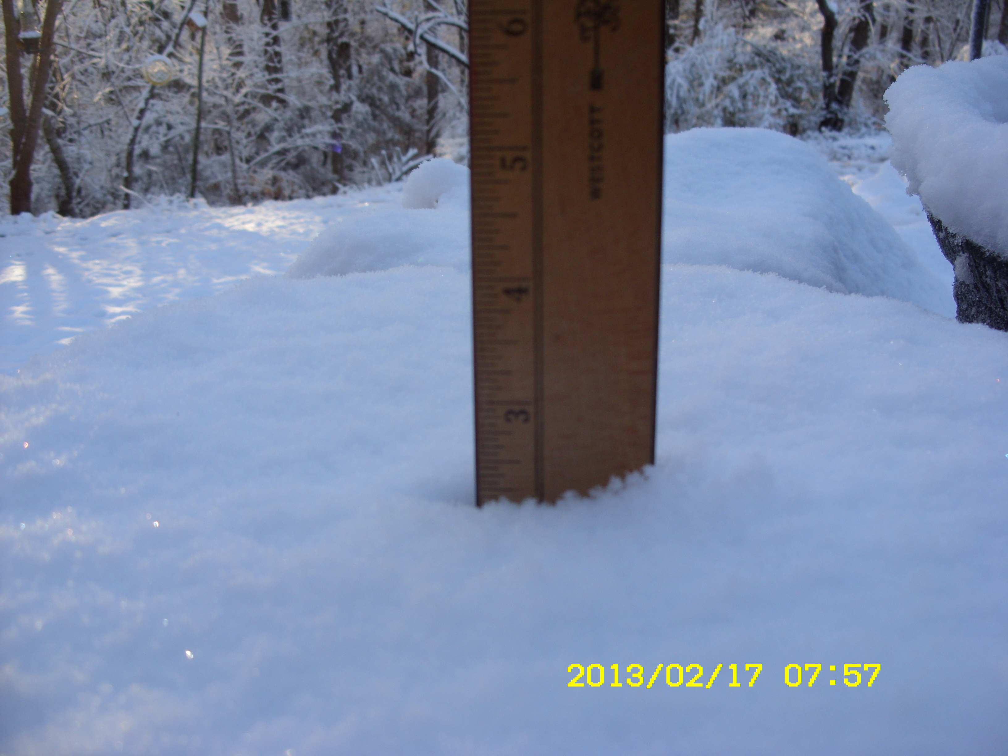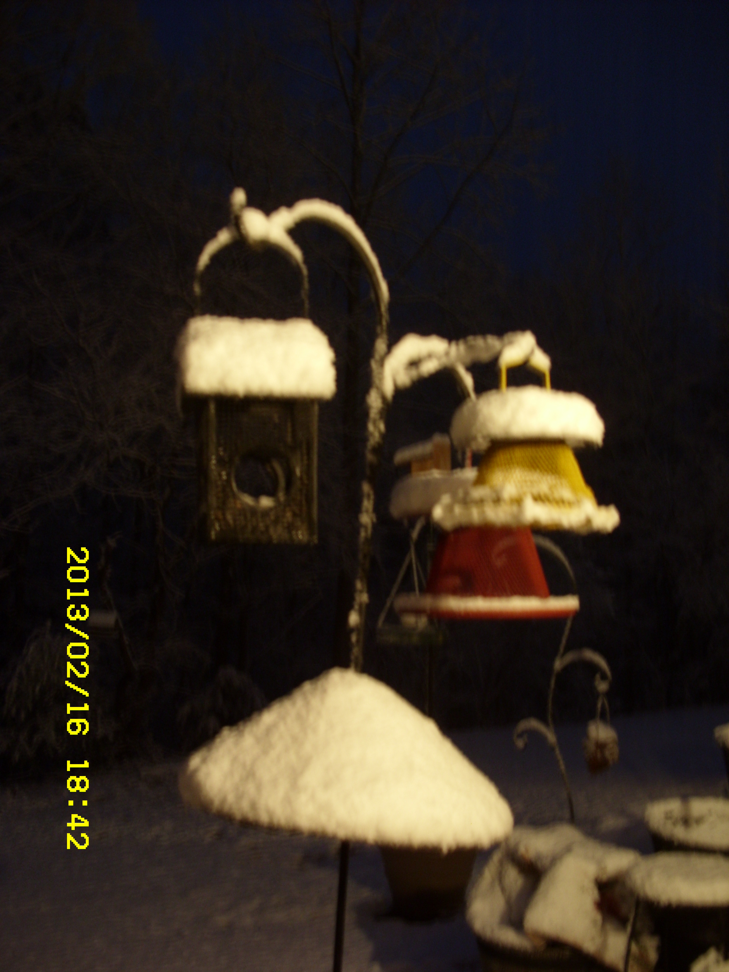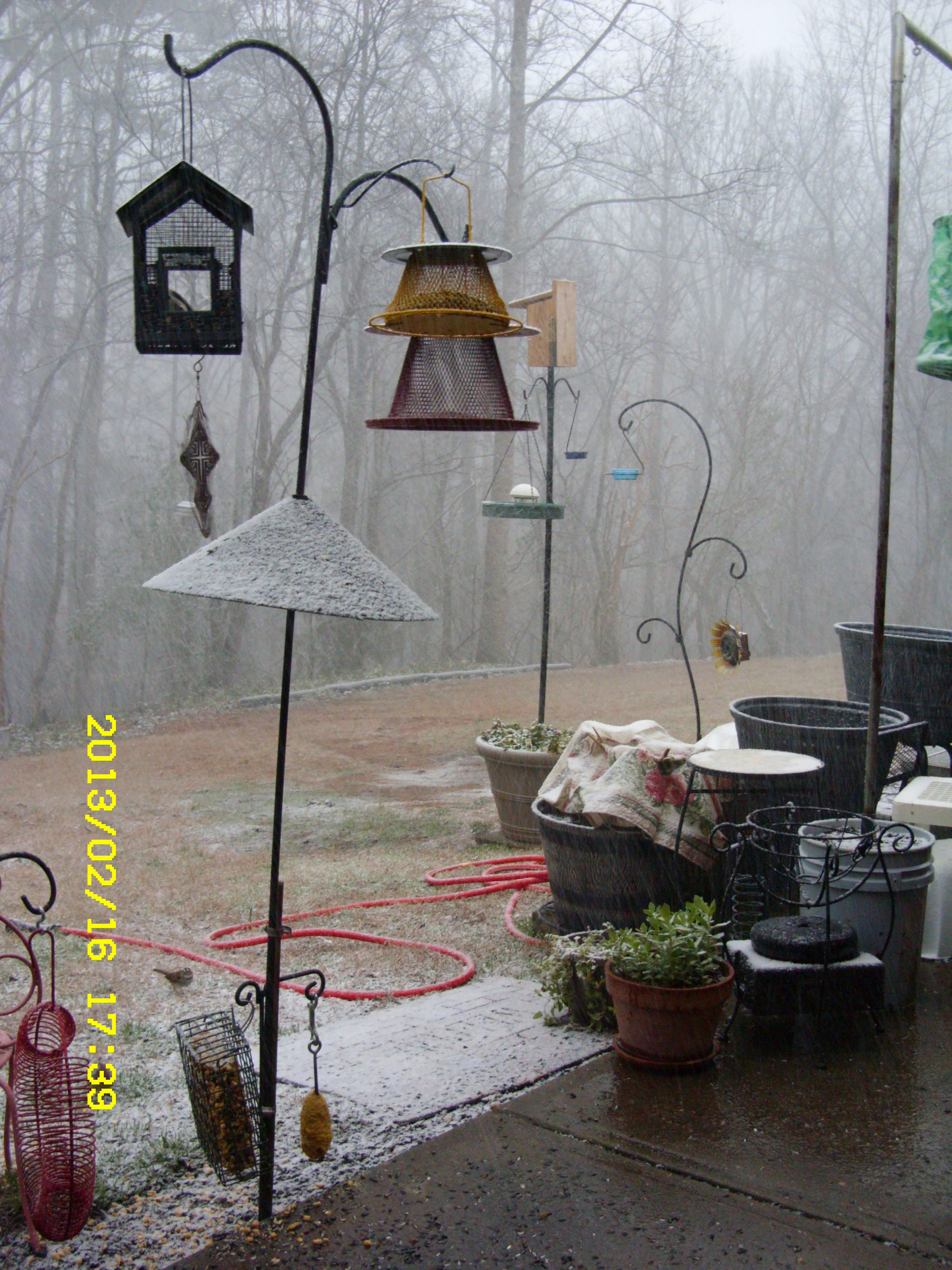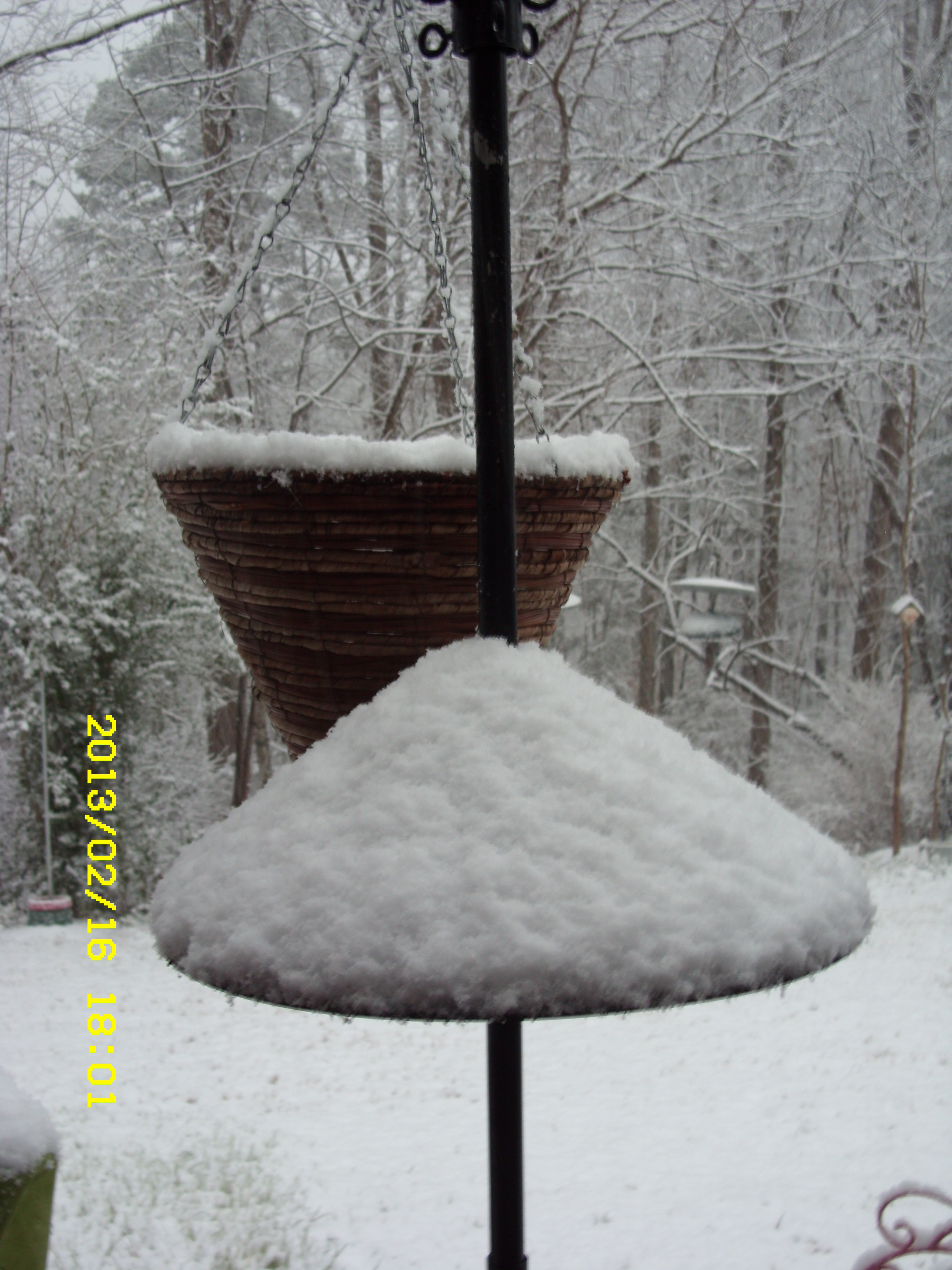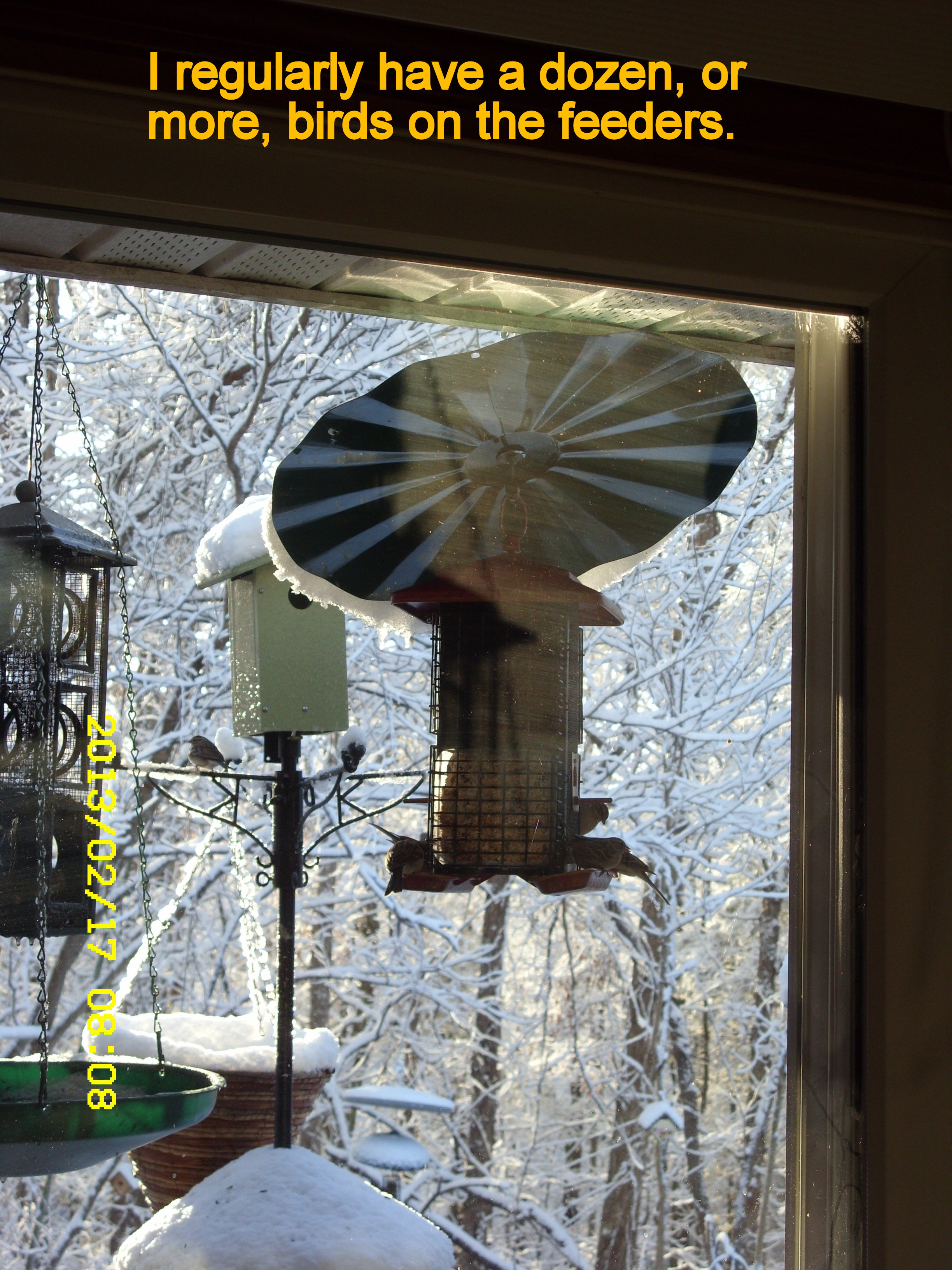 Sunday, Feb. 17, 2013. I must confess that I am partial to “my” Bluebirds. I look forward to Spring and Summer when they make a nest and lay eggs in the Bluebird house. I’m always amused by the antics of the squirrels. One squirrel feeder is obscured behind the water container, in the snow picture.