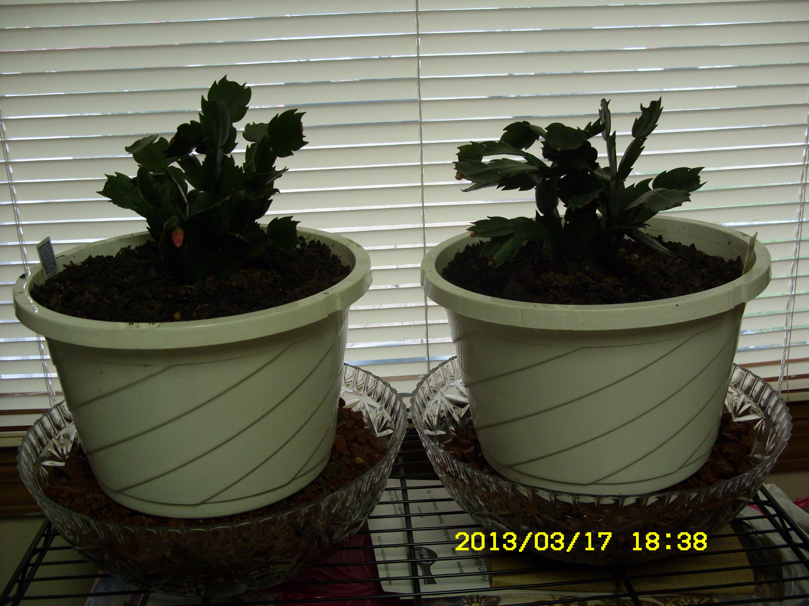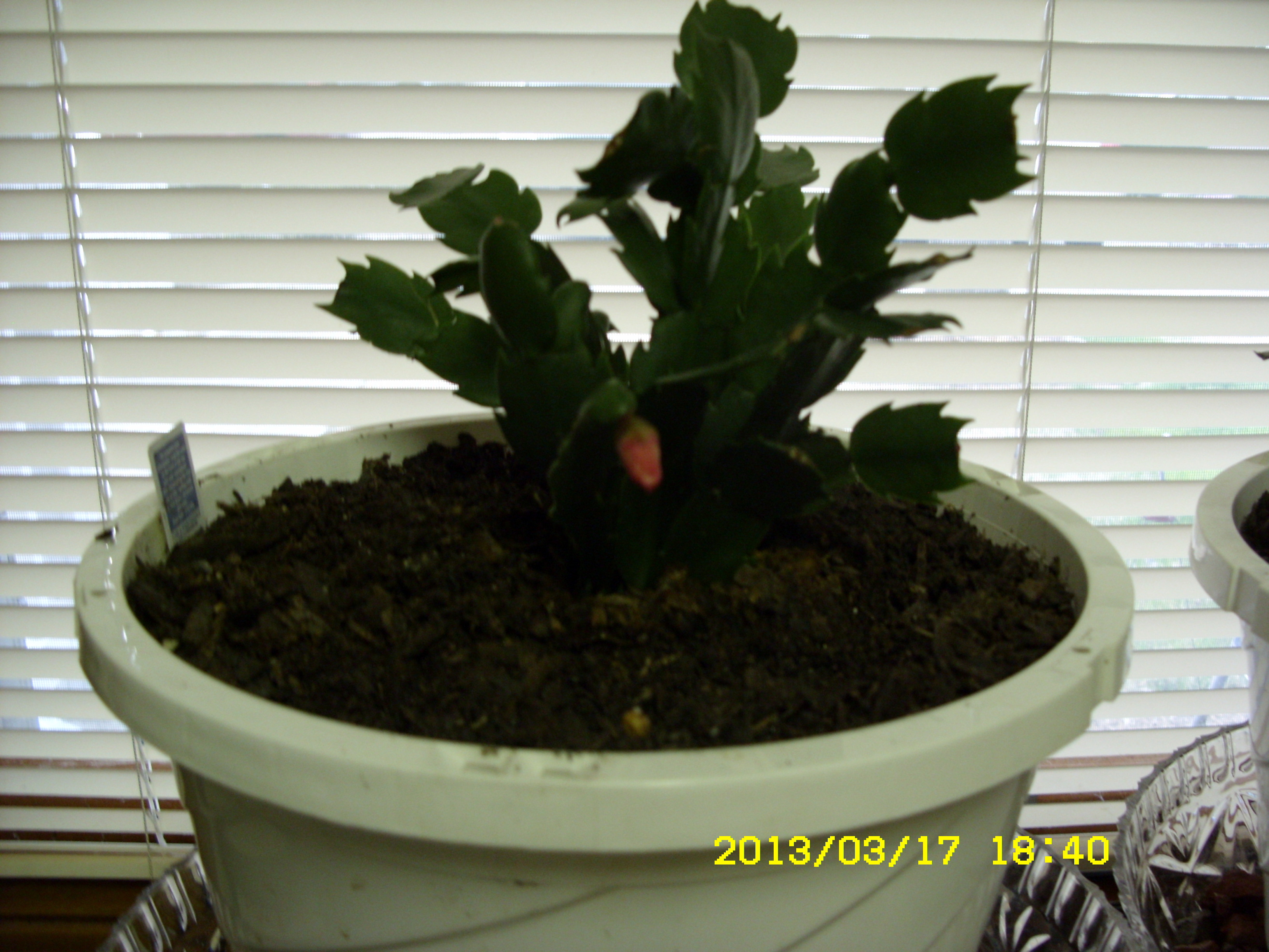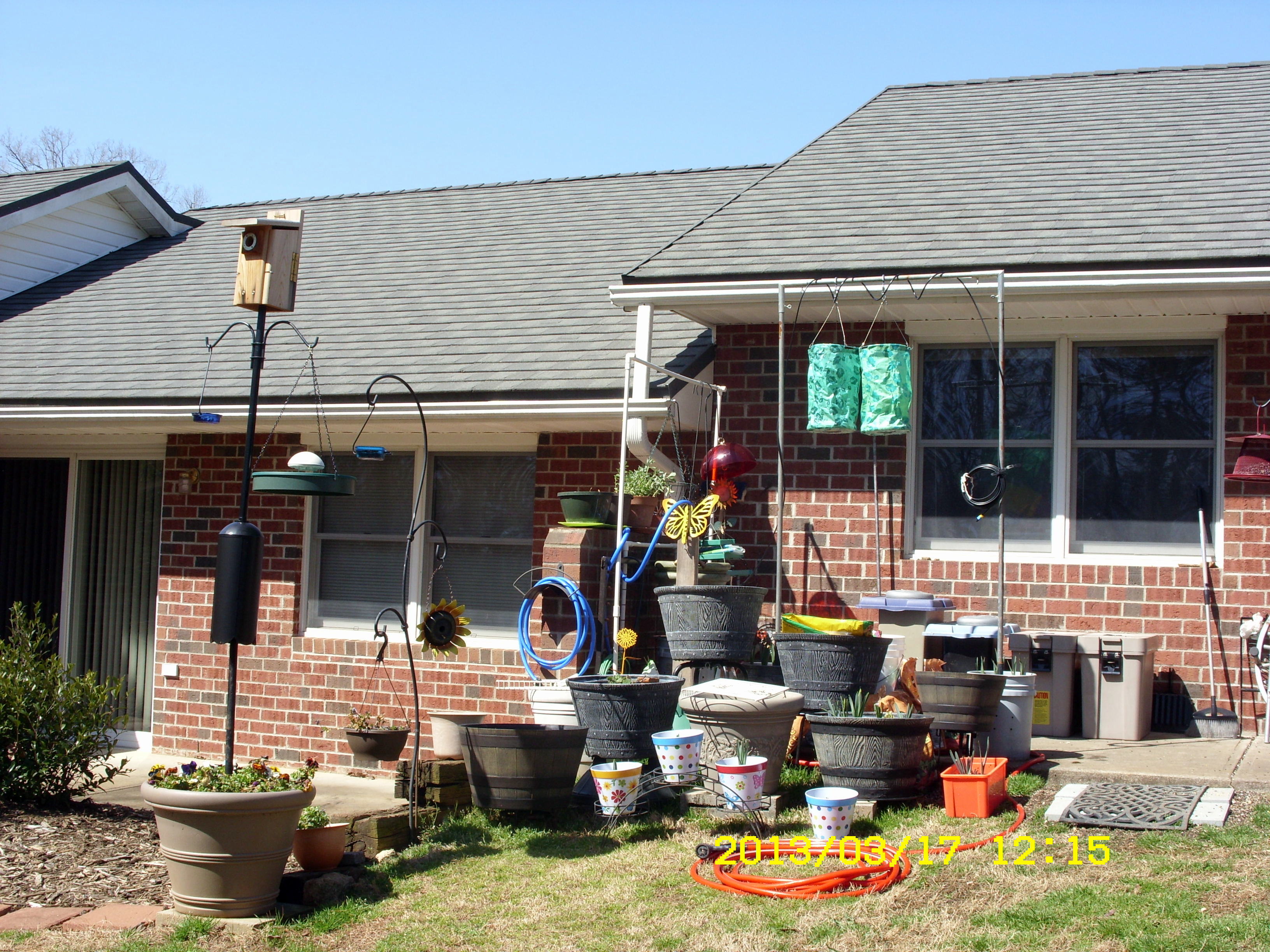 I’m still sick!! (Extremely bad cold, I think.) However, I spent hours in the sunshine–in my backyard–and accomplished a lot!! Pictures: #1, Tomato seeds planted and under a Grow Light; #2 & 3, $5. “Squirrel Buster” Bird feeder from Goodwill (#4, $35. at Lowes); #5 & 6, Creating air bottom(s)” for planters (make my own for $1 or less. Why pay $8. or more?)  #7, Ready to install squirrel baffle below Bluebird house; #8, Baffle.  #9, Surprise!! The Bluebirds have started a nest!!  #10, I love my Bluebirds!!  #11, Fresh water for the critters; #12, Transplanted Calibrachoa from a smaller planter; #13, Refilled the bird feeders; #14 & 15, Near the end of a busy weekend!!  #16 & 17, Surprise, surprise, the Christmas Cactus has a lot of tiny buds and one bloom!!  #18 & 19, Daffodils have tiny buds after our delightfully warm weekend!!  ~~  No pictures, but I also planted Nasturtium seeds outdoors–and small pots indoors.  ~~  I did two loads of laundry, washed dishes, and prepared a healthy salad.  ~~  It’s 8:45 and I am exhausted!!  I’ll be in bed early (won’t stay up to watch “The Good Wife”).  ~~  Sick!!–but very happy with nesting Bluebirds, Christmas Cactus (in March), and late Daffodils!!  Oh yes, the Honeysuckle vine is sending out new growth (that discarded–looked dead–plant that I adopted last Fall).