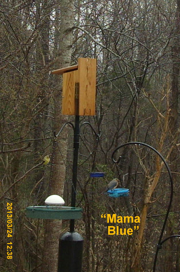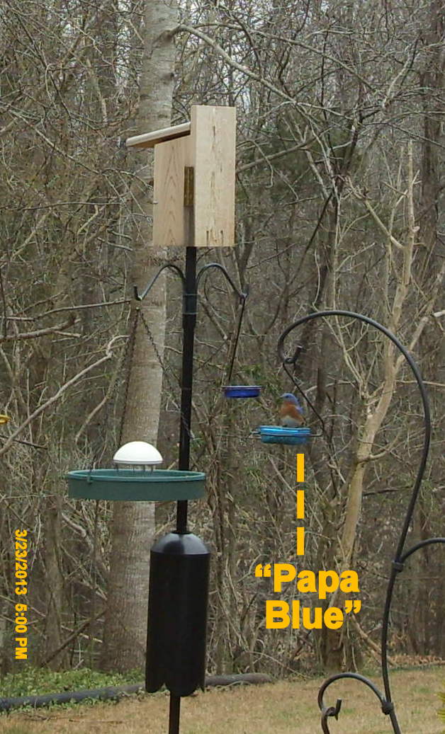 Postscript, same date, 1:00: I think the Bluebirds are sitting in the nearby trees waiting and watching for their next feast. Or they may recognize the “tap, tap, tap, tap” sound of the plastic dish (from the house) against the glass mealworm dish. Note that “Mama Blue” doesn’t have the beautiful color of “Papa Blue.” (The last picture from last Summer–before the upgrade to the Ultimate Bluebird House.)