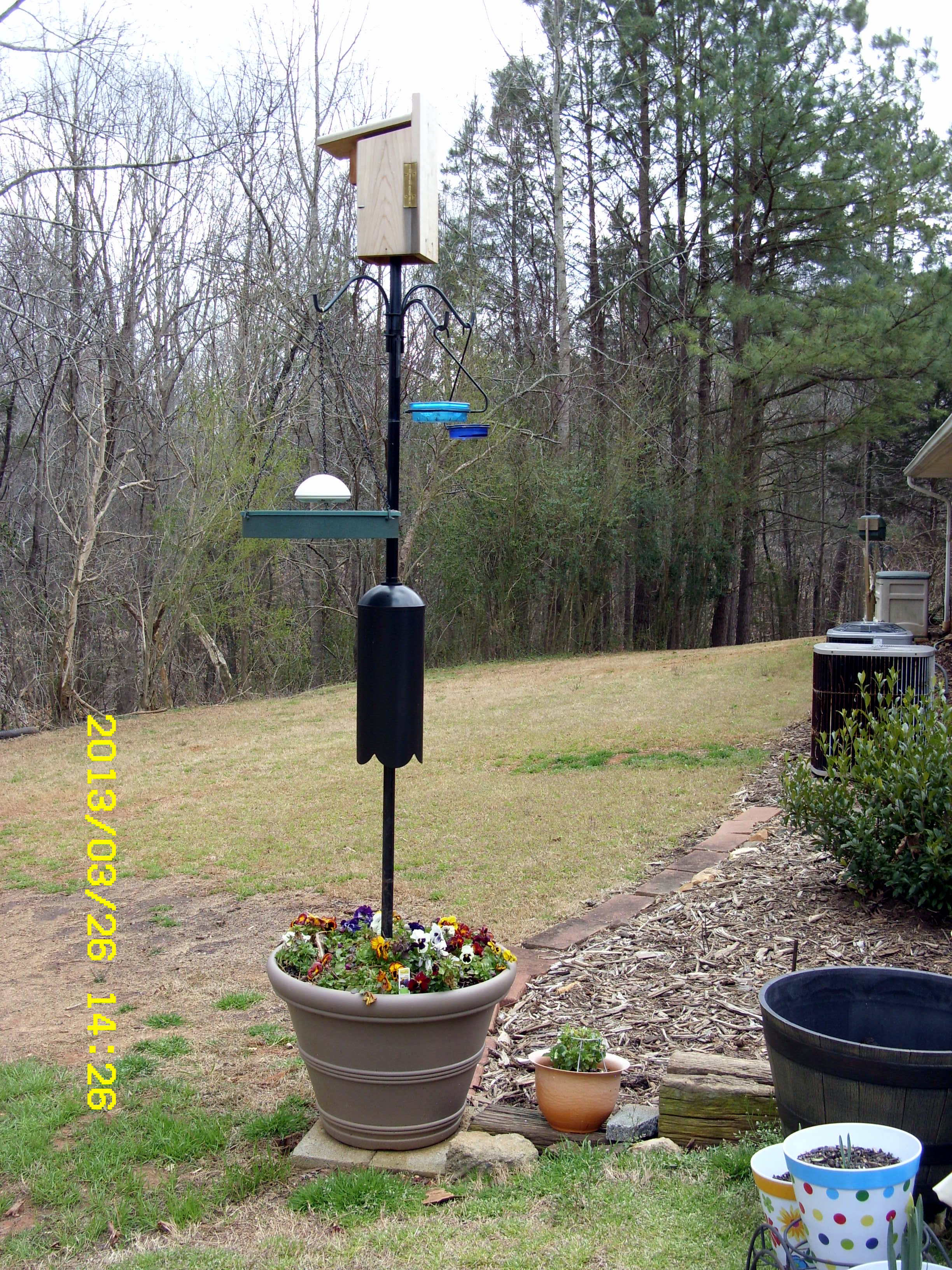 Actually 3:00 PM as I prepare this blog to follow that earlier blog. Sick–or not–I love to work on “my projects.” Yesterday (after the appointment with the chiropractor), I stopped at Goodwill. I bought the extra sturdy Christmas tree stand ($2.), another item for an eventual “air bottom,” and the red plastic box for another bright planter. Recently, from Goodwill (for $2.), I bought the wrought-iron wall decoration designed to hold glass containers and voitive-type candles. I wanted the wrought-iron item for a “trellis.” (“Yes, a ‘trellis’.”) In less than one hour I combined the two with hardware and wood that I already had. When the weather breaks, I’ll plant Morning Glory seeds to climb on it. ~~ Then I moved to an outdoor project: I added another “arm” to the Bluebird house upright wrought-iron pole. With that accomplished, I removed the Shepherd’s Hook. I don’t want a squirrel to make a flying leap from the Shepherd’s Hook–and by-pass the baffle–to steal the Bluebird eggs or babies.