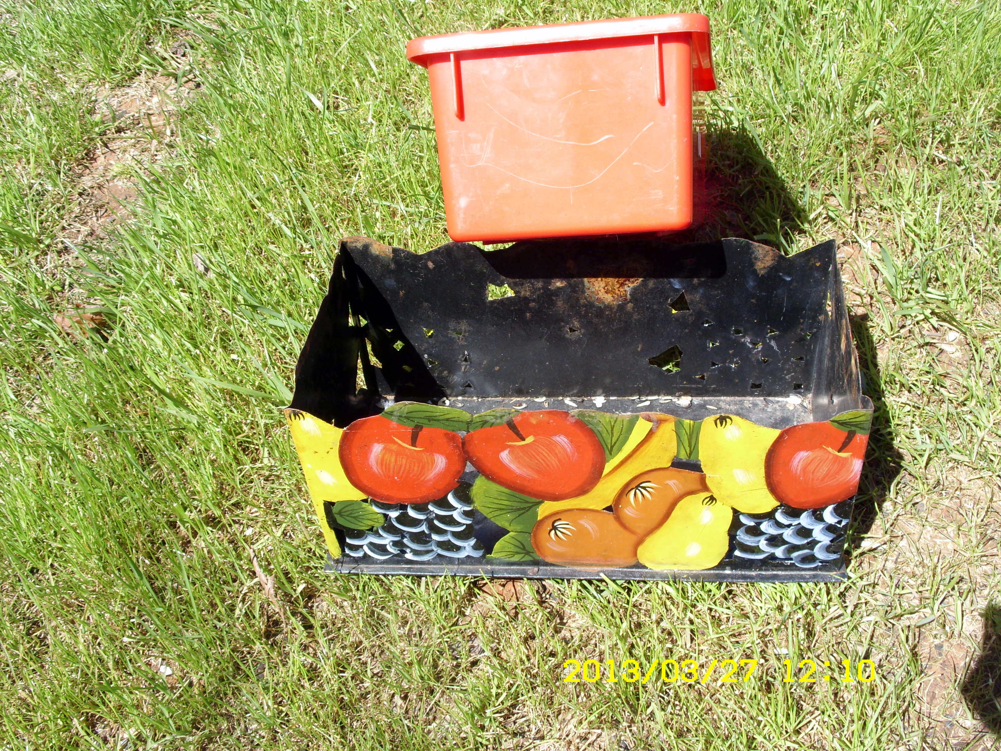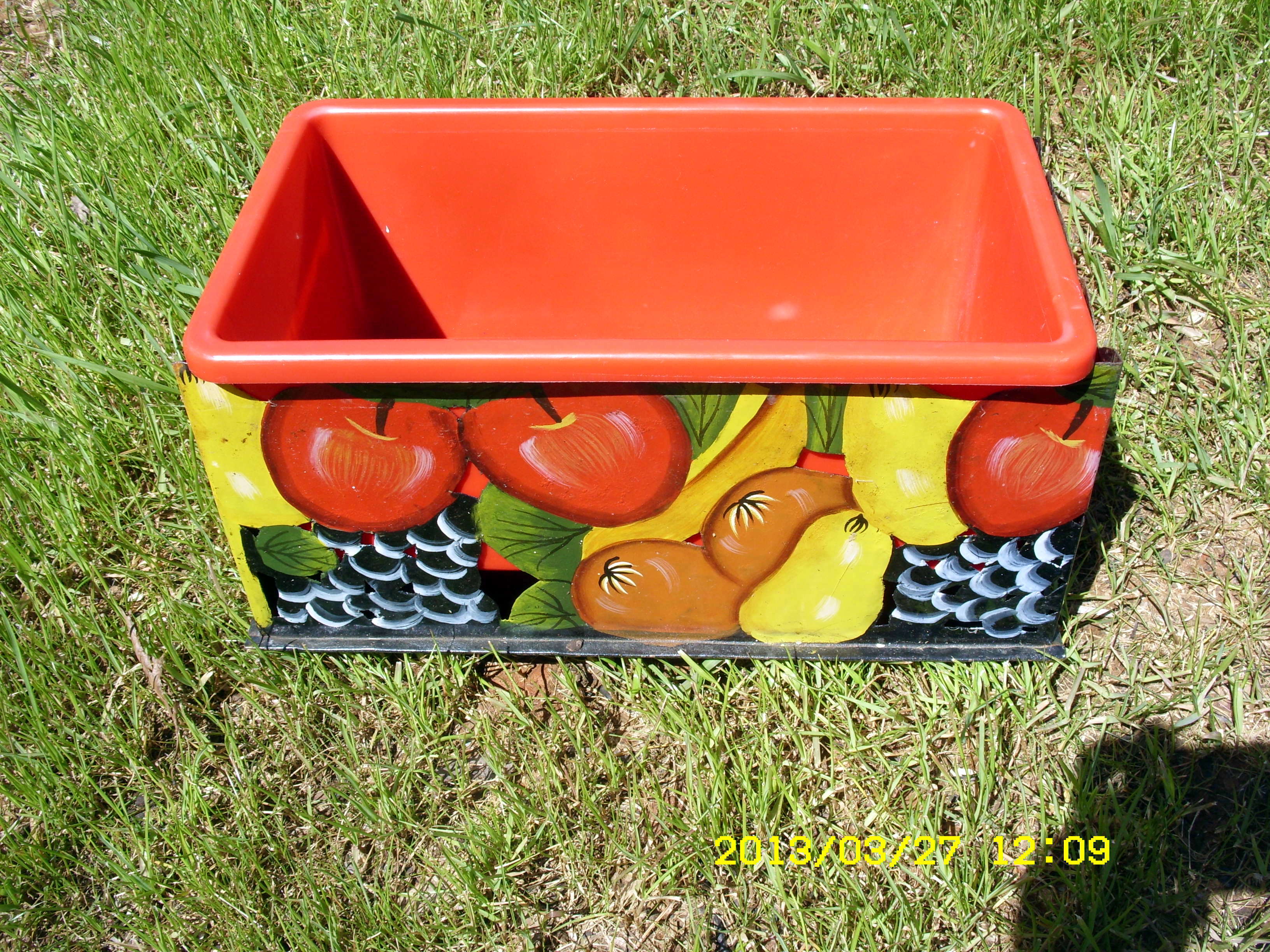 The forty-nine cent red rectangular plastic box is a perfect “liner” for a metal planter!!