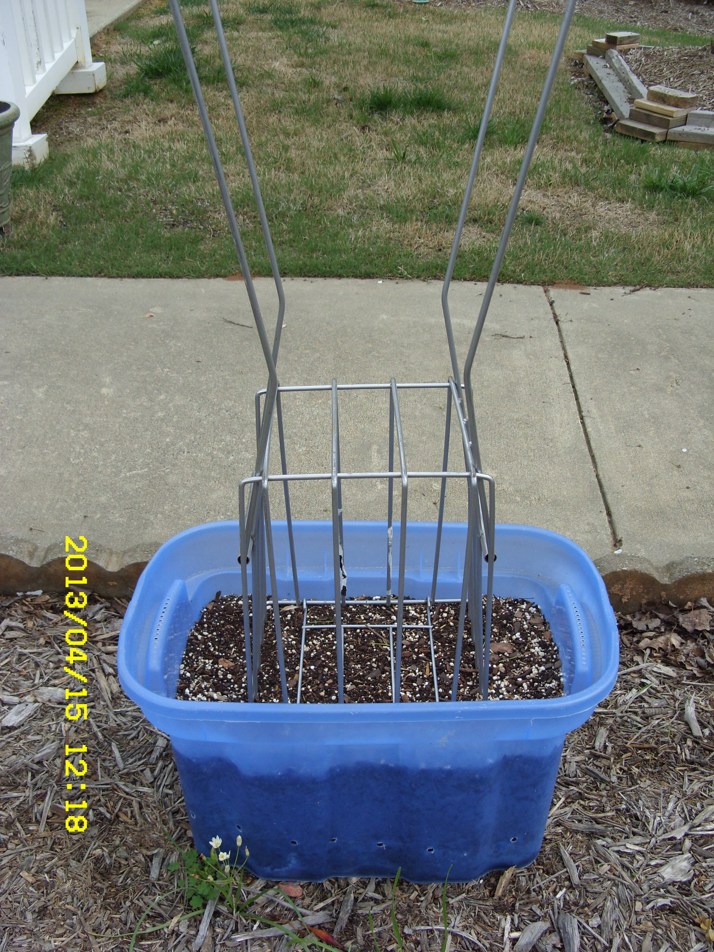 As an experiment, I started a Jerusalem Artichoke. I’ve read that they can be “invasive” so I planted one tuber (about the size of my fist) in this blue plastic container. I want to evaluate the merit of having this flowering plant in the large area adjacent to the parking lot. It would be inconsiderate (of me) to plant in a community garden area and have it “take over.” I found the article, from Mother Earth News, to be very informative. ~~ I purchased the metal “container” (for want of a better description) from Goodwill and thought it a satisfactory support for tender shoots (that require support). Later, if needed, I’ll provide a taller trellis.
