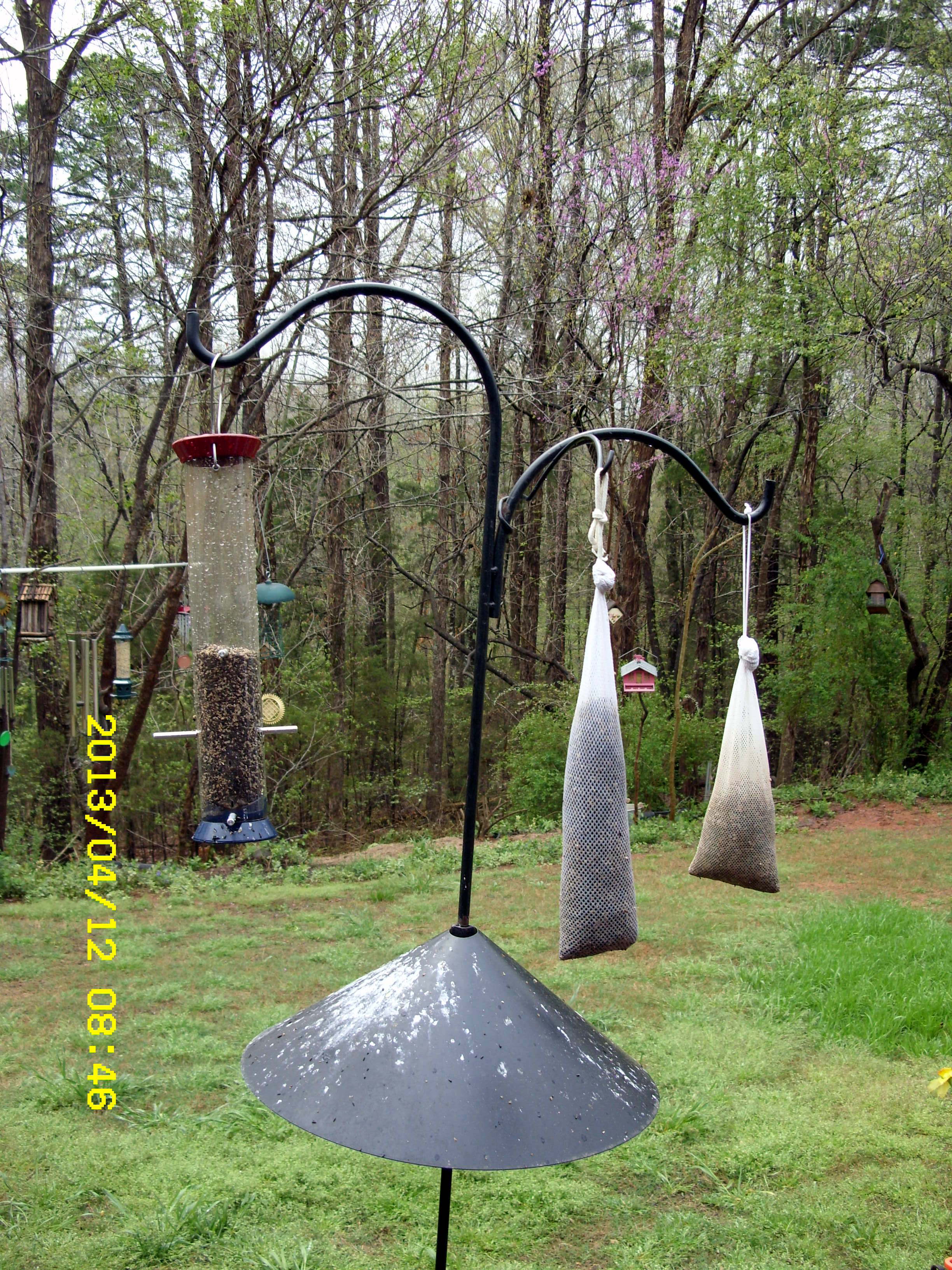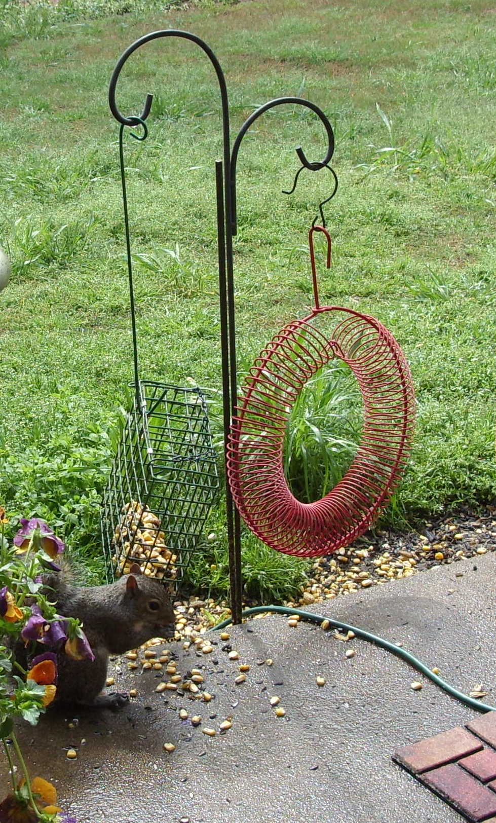 “Nothing could be finer than to be in Carolina in the morning.” A morning after a refreshing rain (1 & 1/4 inches) that cleared the air of pollen. (Everything has been covered with a heavy “blanket” of yellow pollen!!) I sat on my patio and watched the birds come and go. The squirrels were (almost) at my feet to get the whole peanuts. There was a Hummingbird at the red feeder a second earlier but I failed to get it in the picture. ~~ No demands on me this morning: No chiropractor appointment. I do not have to work this afternoon. I can enjoy my Garden of Eden or, as the critters might say, “garden of eat-in.”