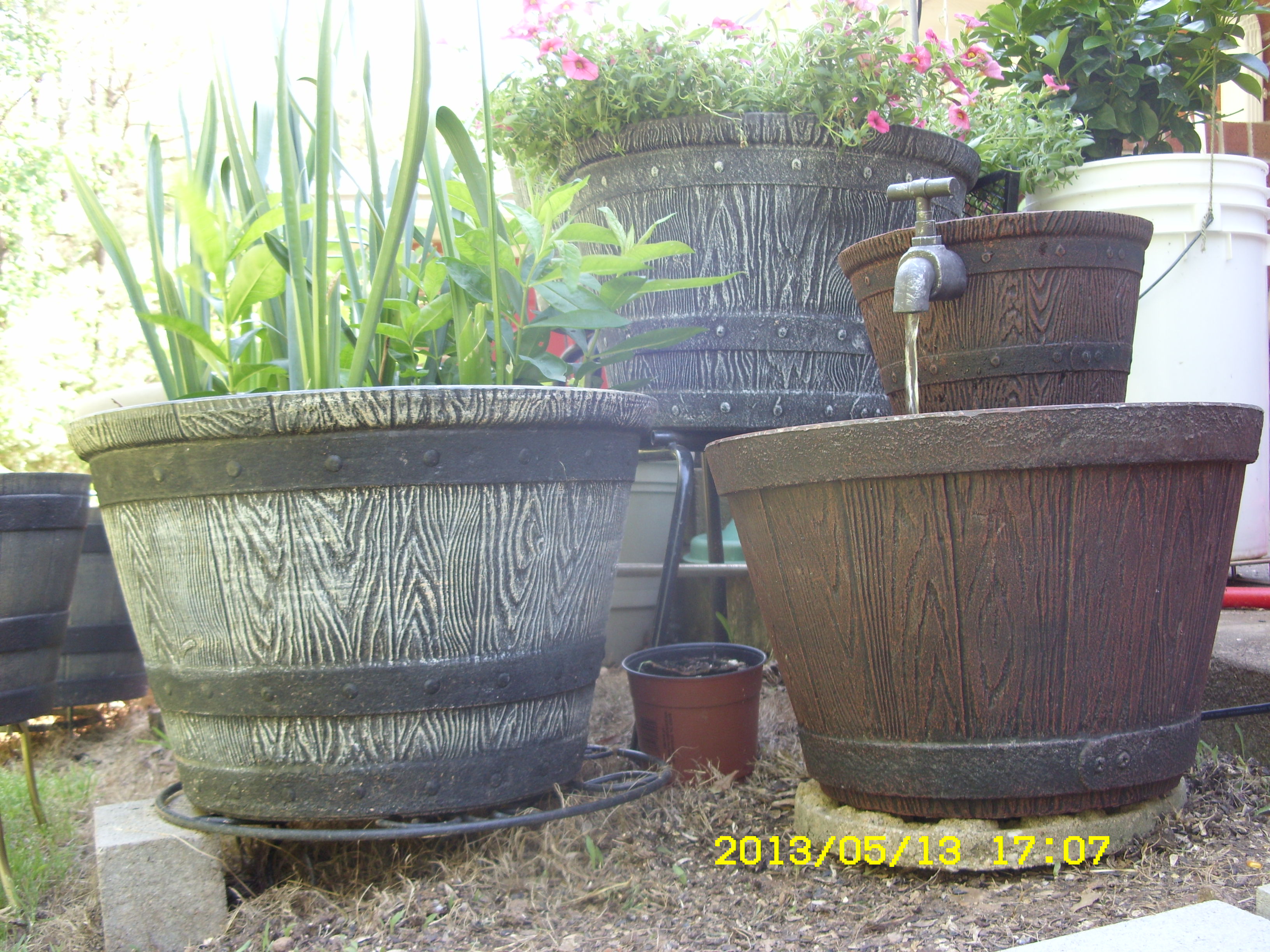 For over a year, I’ve drooled over attractive decorative garden fountains. A few months ago I bought… but it doesn’t follow my theme of simulated wood half-barrel, and black wrought-iron. Today, at Garden Ridge, I succumbed and purchased the barrel fountain.