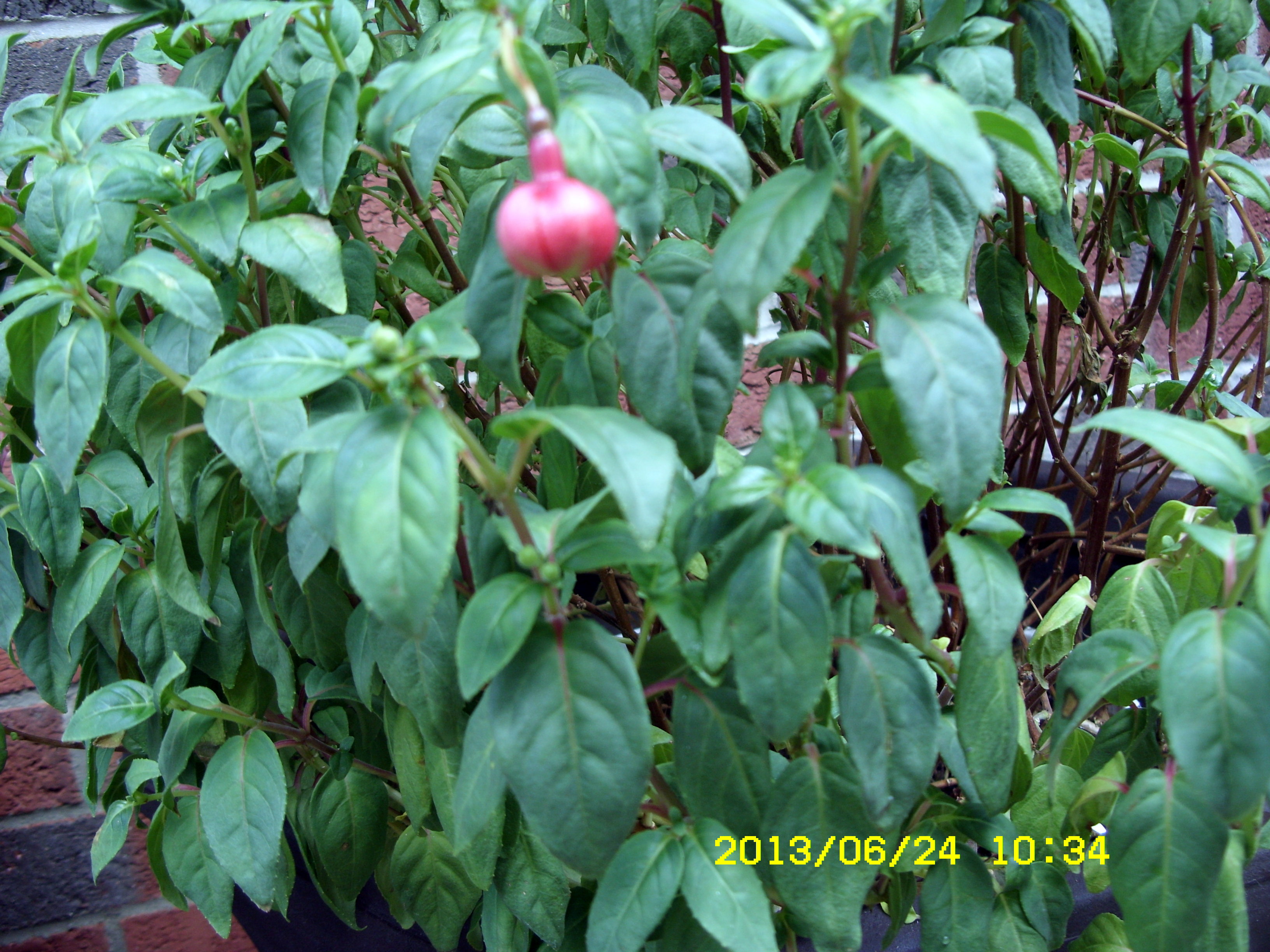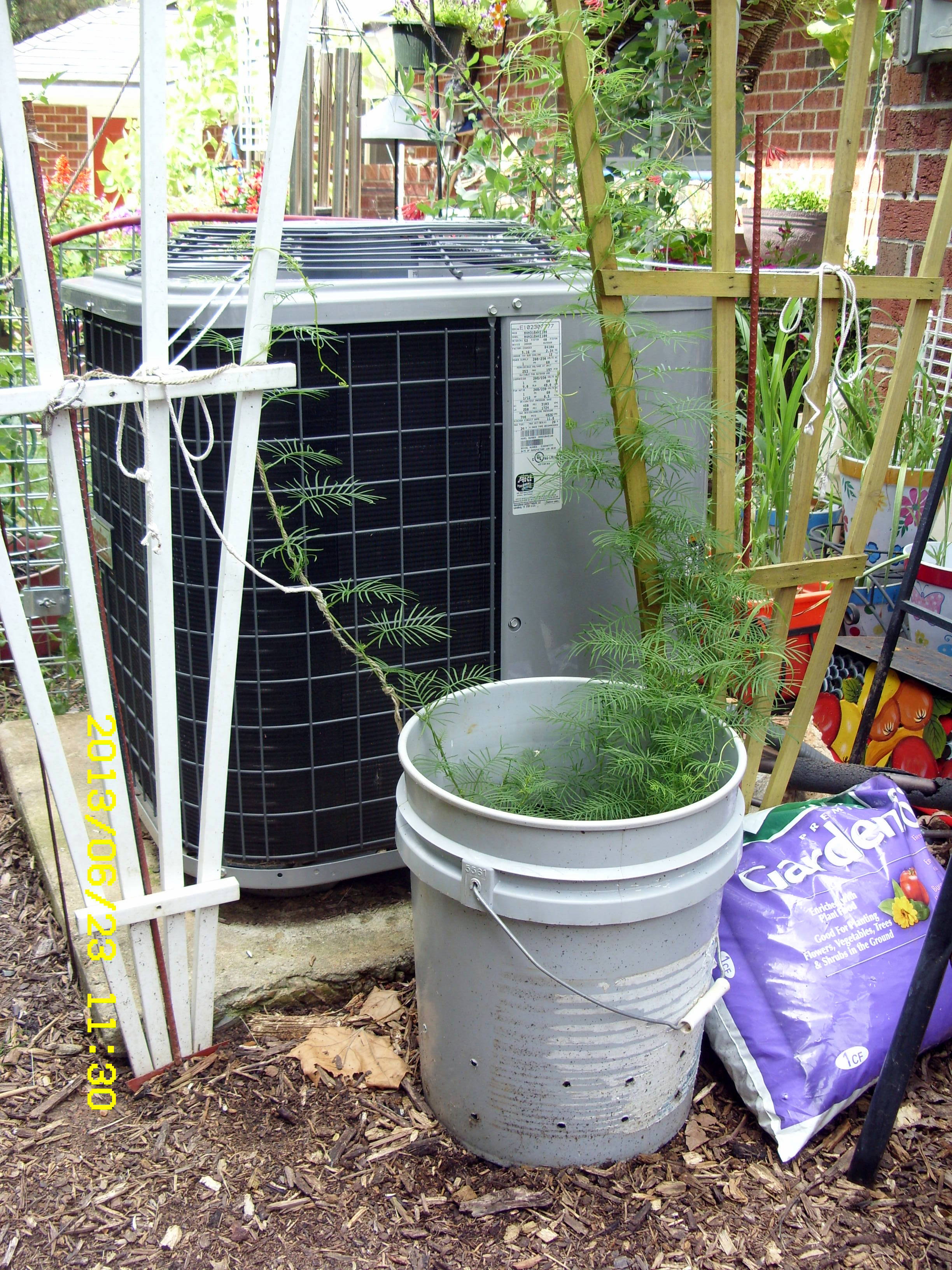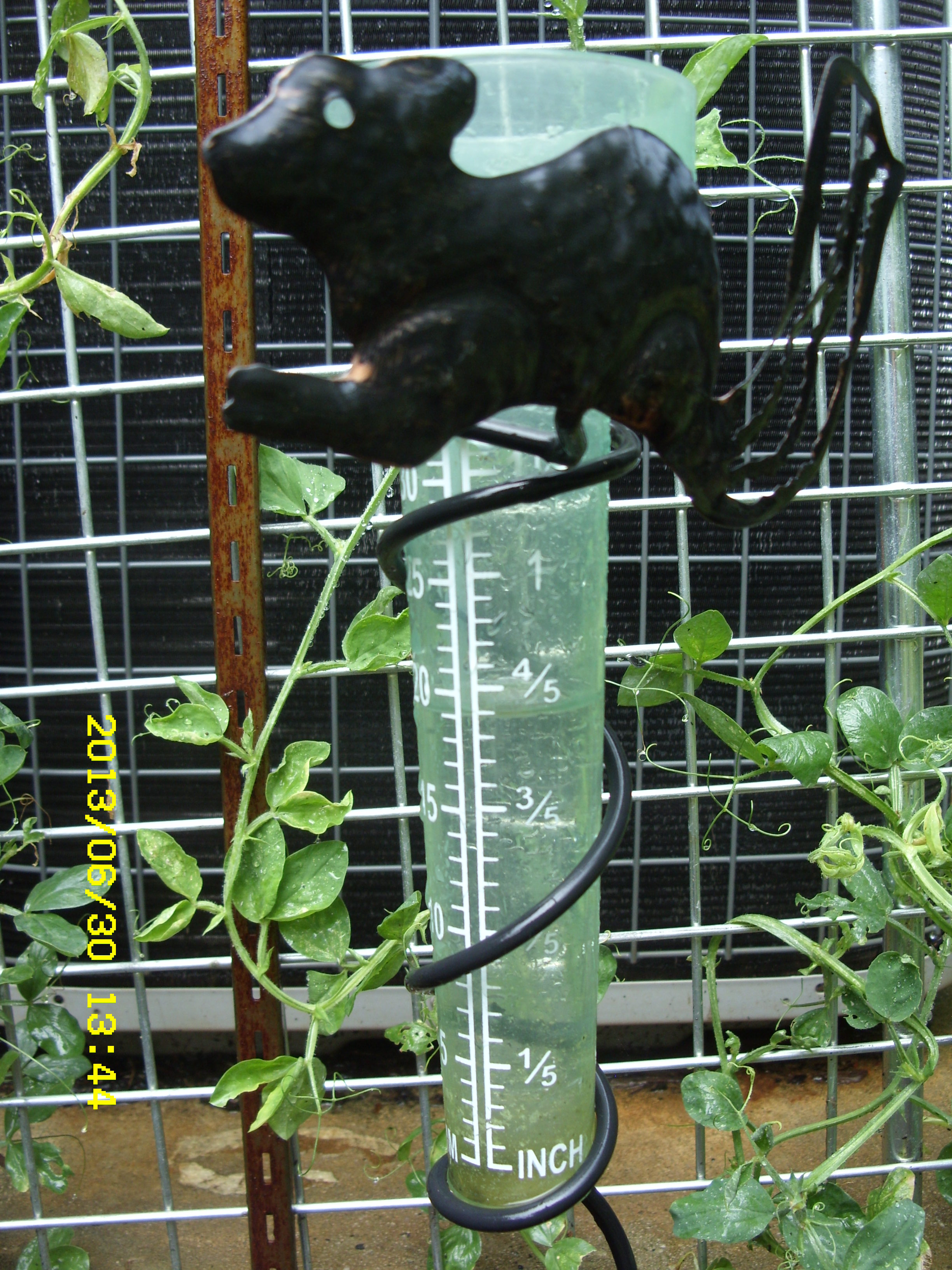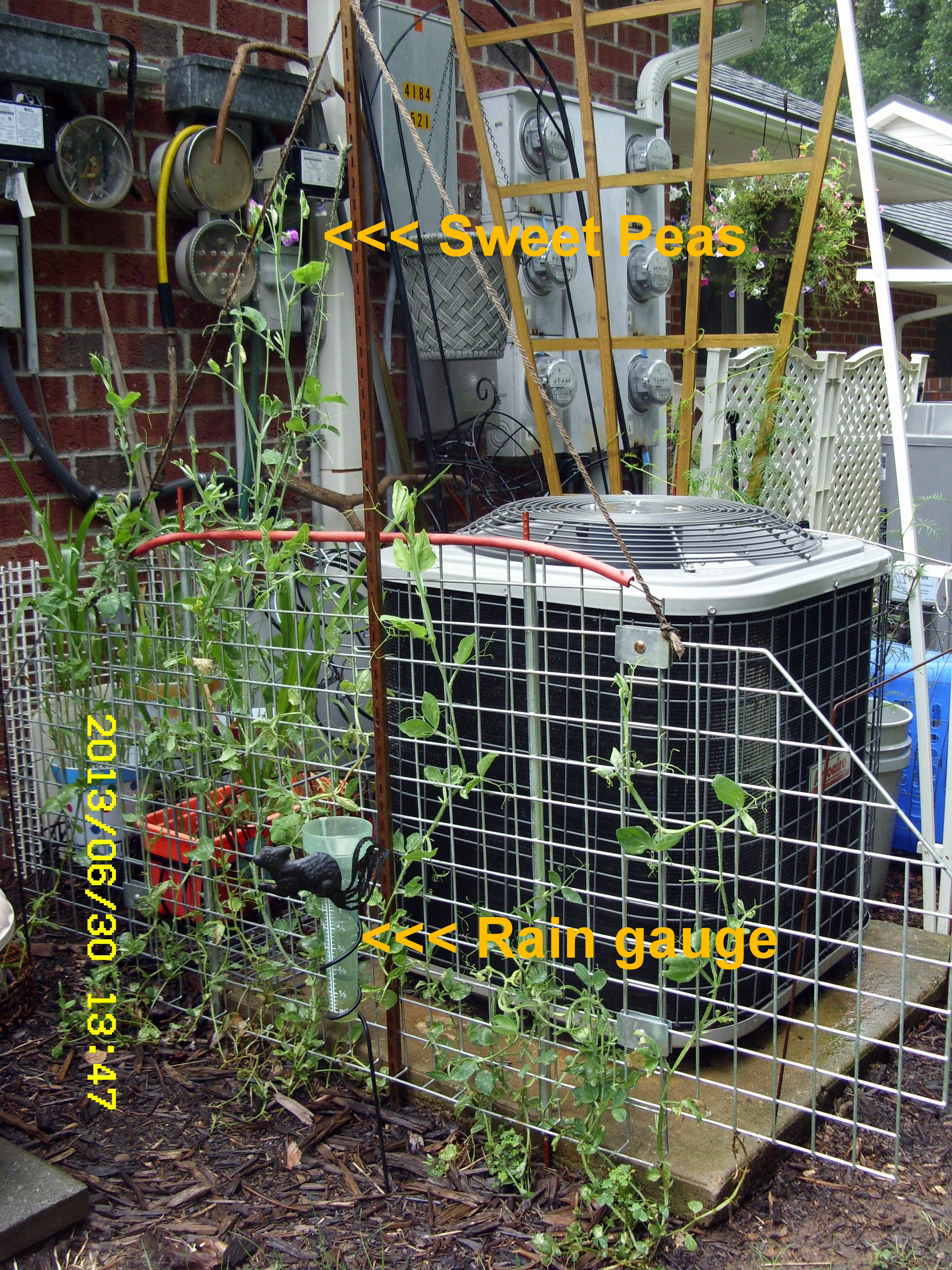 Picture #1: Eighty-five degrees at 3:44 PM. #2 & 3, rain water in the gauge. #4, rain gauge is adjacent to the “dog fence” trellis with Sweet Pea vines. #5, my first Sweet Pea flowers. The Sweet Peas vines were so slow-growing, I wondered if they would ever bloom!!