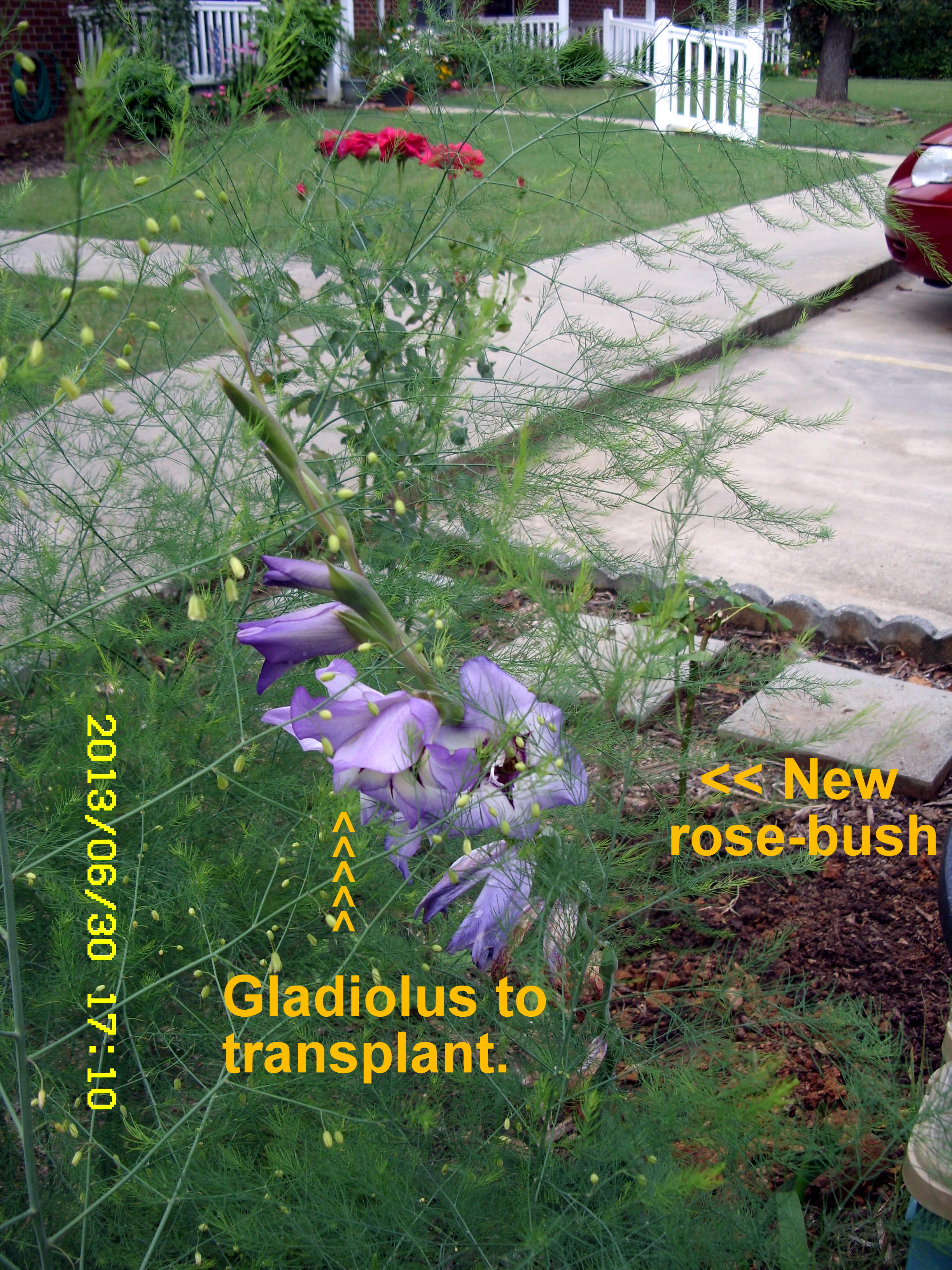 Below, #6 shows the transplanted rose-bush (one-third the size of a few hours earlier). #7, 8, 9 & 10 are Gladiolus that will eventually be gathered into one area. (Why were plants originally deposited hodge-podge in the garden??)