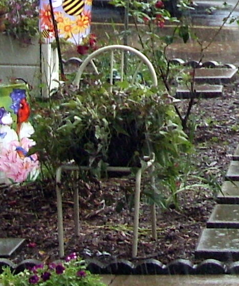 Extremely hard rain drove me indoors for about an hour. During a lull, I inserted a Coco liner in a wrought-metal hanging basket and prepared planter soil. Petunias were still being transplanted (from small nursery containers) when a clap of thunder and a cloud-burst forced me indoors again. “Third times a charm” (so they say) and I finished that task before the now continuing rain (4:45). Honestly, I’m quite wet as I sit here preparing this message. Feels good on a hot humid 80 degree day!! ~~ Gratefully, the fourth Sweet Potato Vine should be my last transplant. It’s a relief to have that project behind me. IMHO, the newly transplanted are blessed to have plenty of fresh soil and a healthy rain!!