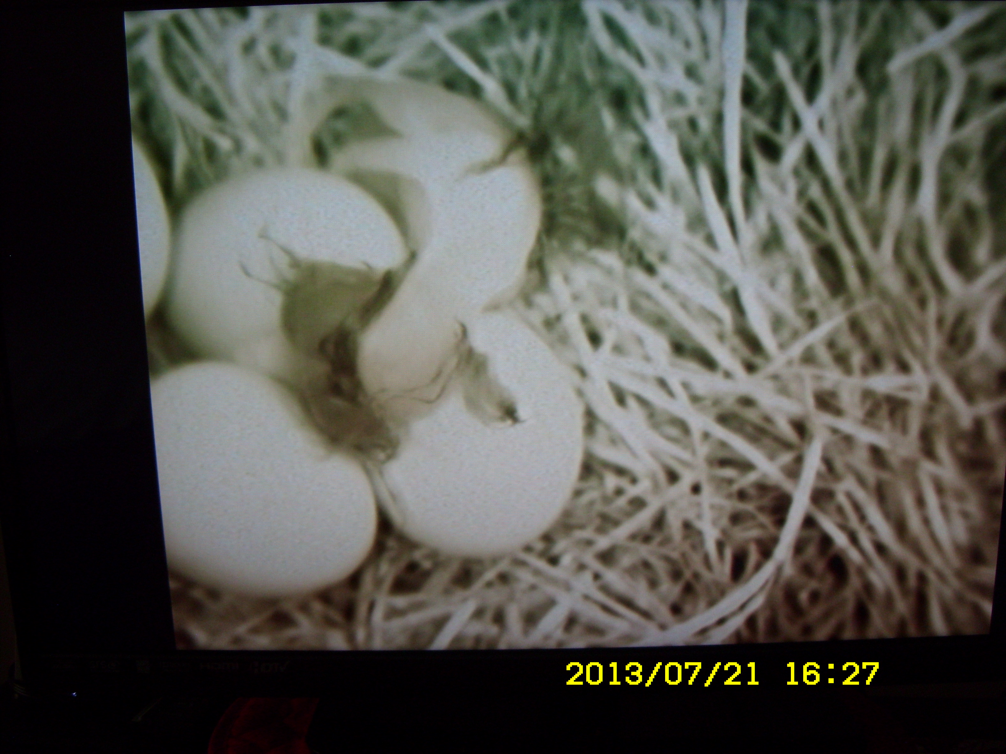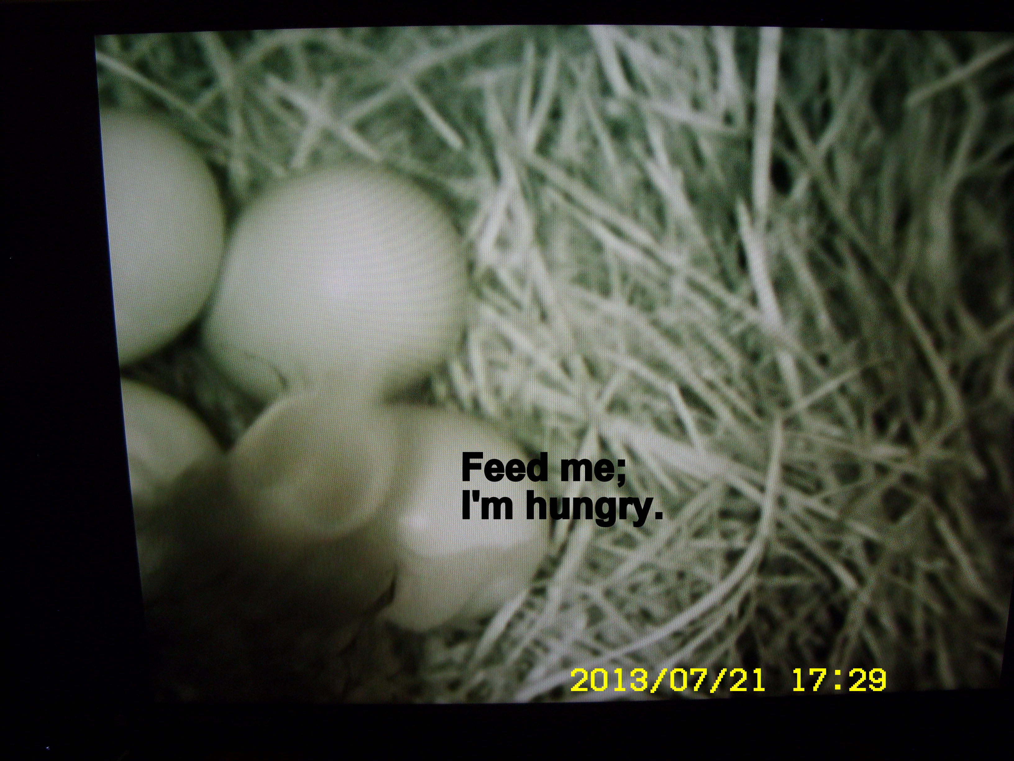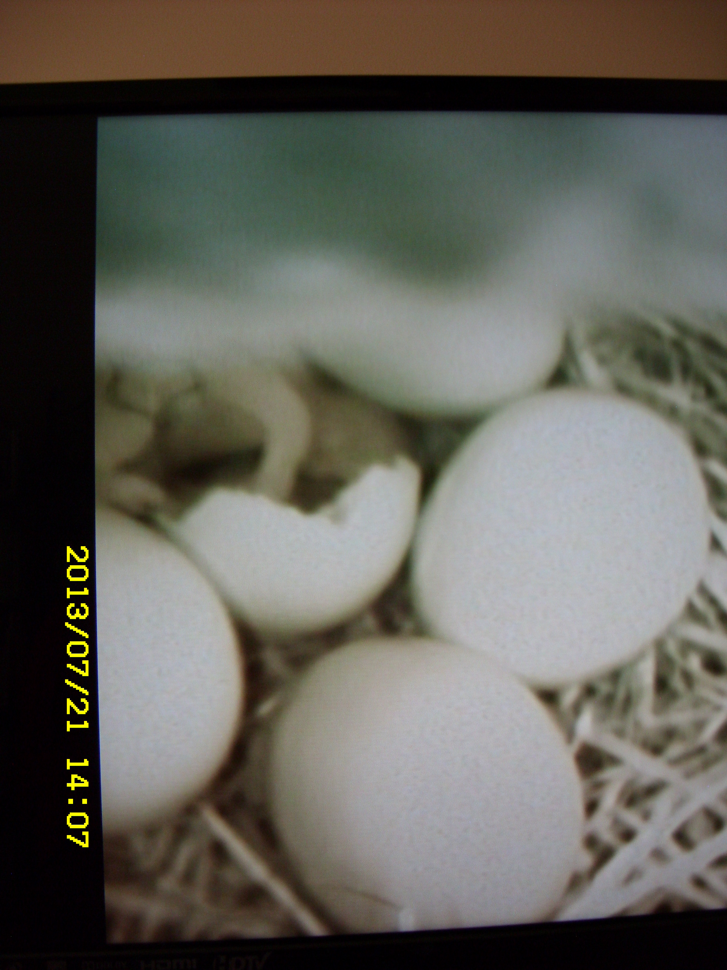 Next time perhaps, I should use a tripod so the pictures have perfect symmetry?! Hey, I’m just excited that I was able to see and photograph the event!! ~~ At one o’clock the nest looked exactly the same as it has for two weeks. 1:45-1:47 and I’m curious because one egg looks slightly different. 1:50 and a crack appears. ~~ I published the first batch of pictures at 3:20 while monitoring the TV and taking more pictures. It’s 4:00 as I publish additional pictures. Stay tuned; more to come. (You think these are repetitious? These are the best of one-hundred-plus shots!!) I’m curious about Mama’s absence from the nest. For days, and weeks, she has been on the nest every time I monitored it. This is extremely interesting to me!! Note the time stamps: All this in less than three hours.
