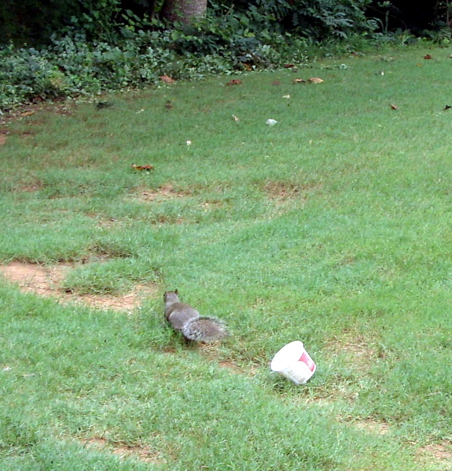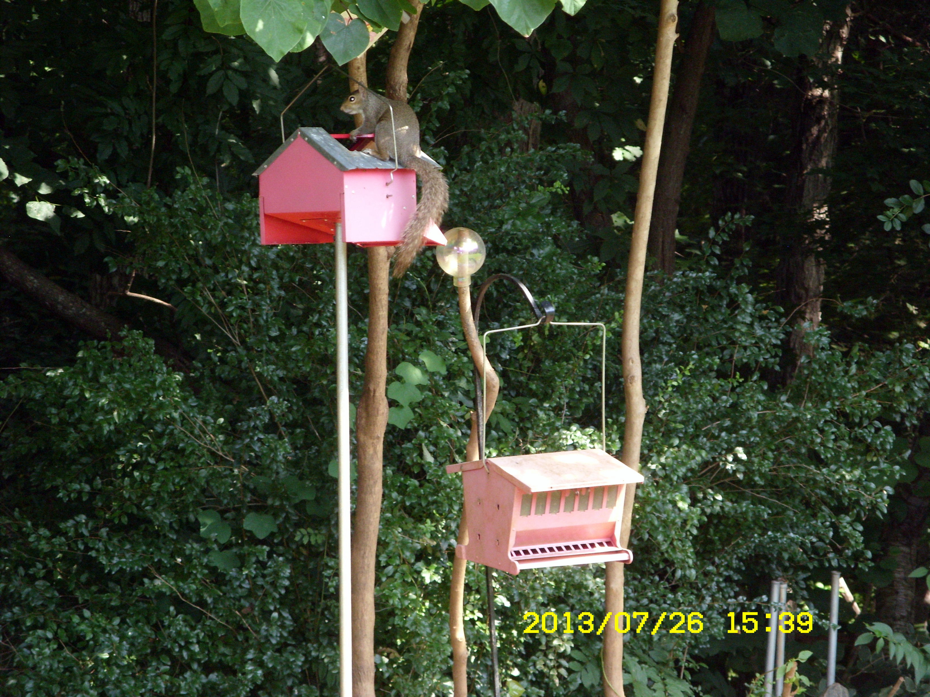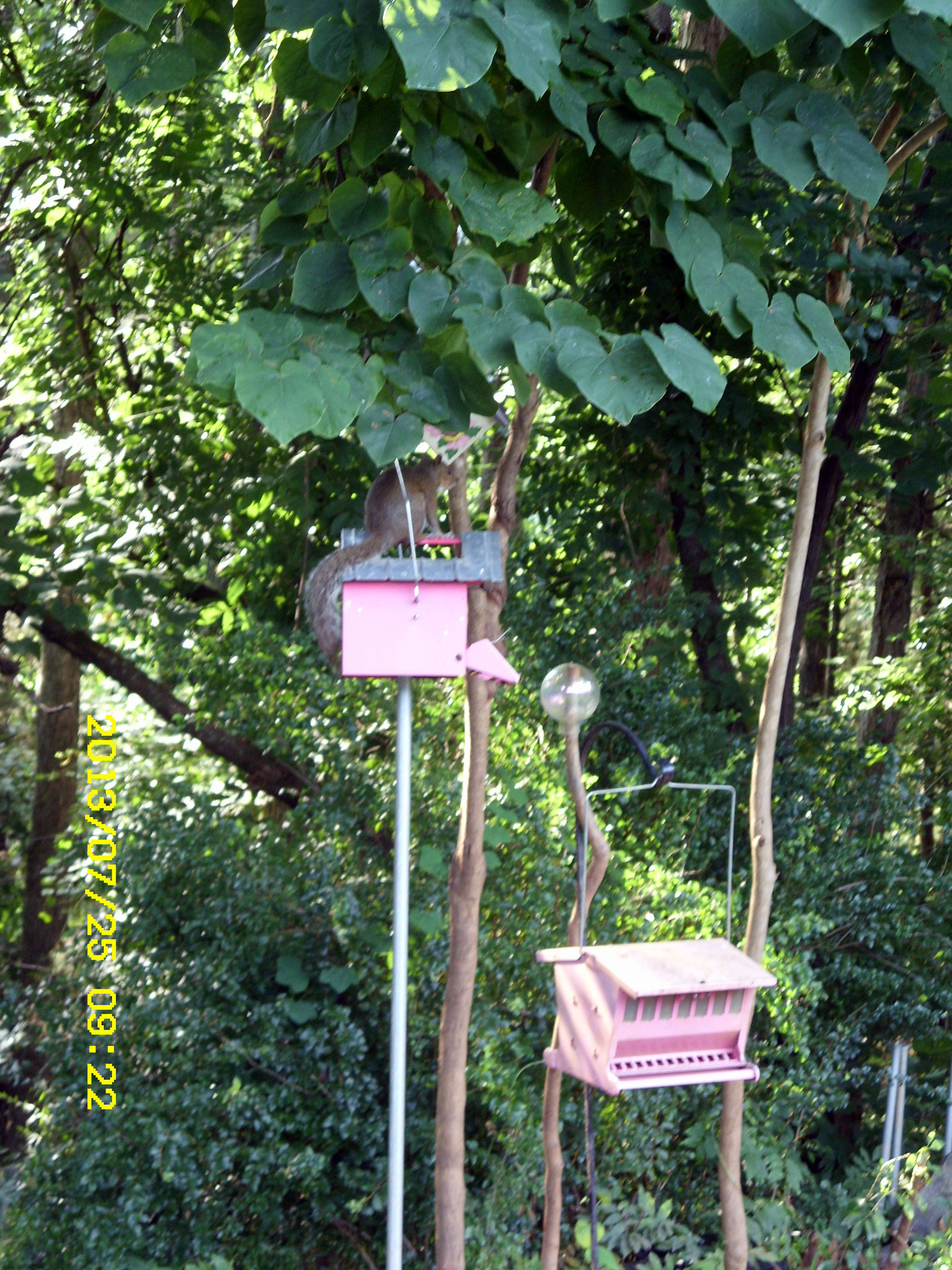 9:20 AM: A casual glance out the window alerted me to another “happening” in my backyard. A squirrel was on top of the “squirrel buster” bird feeder. “How did he get the top off?”