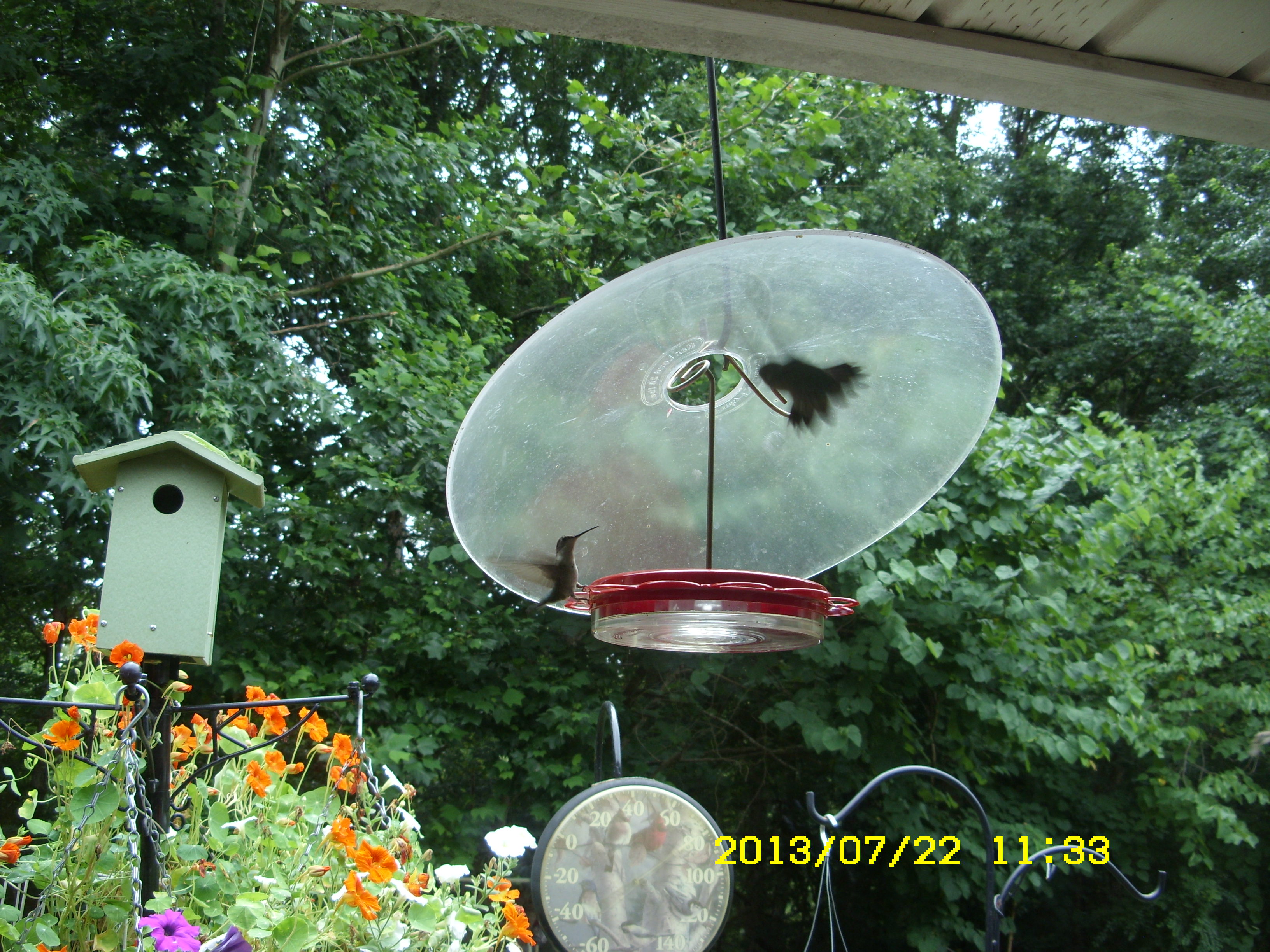 10:45 AM: For the first time, I saw four or five Hummingbirds circling the feeder. A male Ruby-throated Hummer was fiercely defending the area and others were forced away. (But the two on the feeder appear to be females?!)