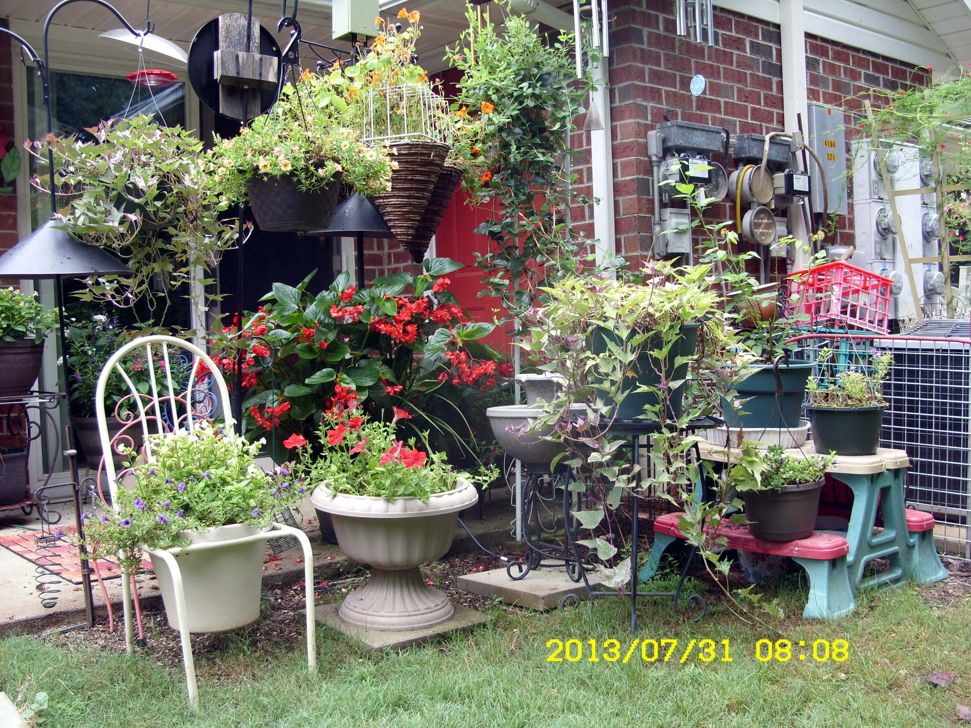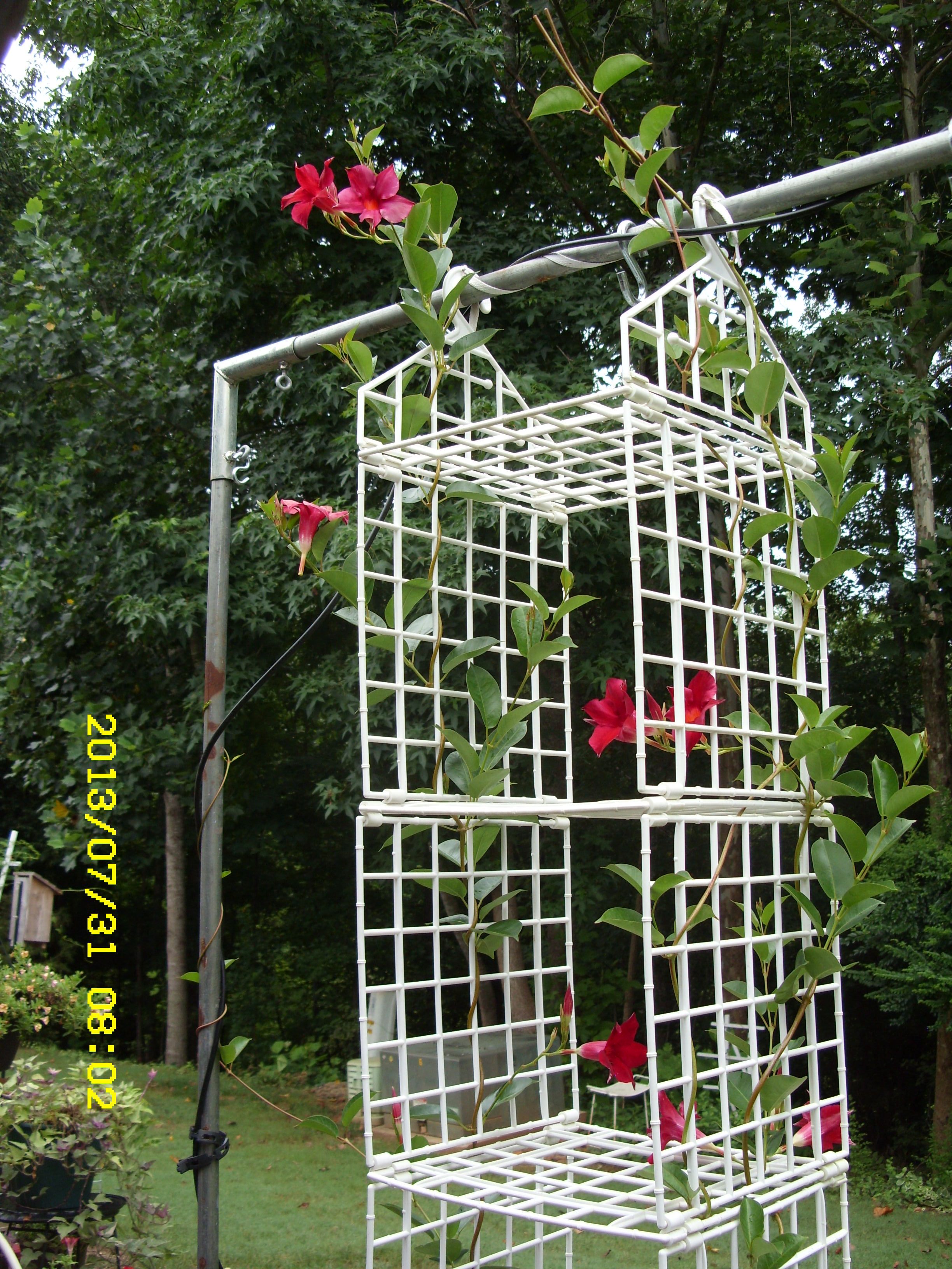 Pictures taken just prior to “more rain”; two days anticipated. It has been unseasonably wet and there has been tremendous damage in areas near by. My garden has suffered from “too much rain”; far fewer blooms. Today I was compelled to document the Mandevilla Vine climbing the closet organizer. The vine is growing from the white five-gallon pail. I couldn’t stop with three pictures!! #7 & 8 are Cypress Vine–successfully grown this season but a failure last year.