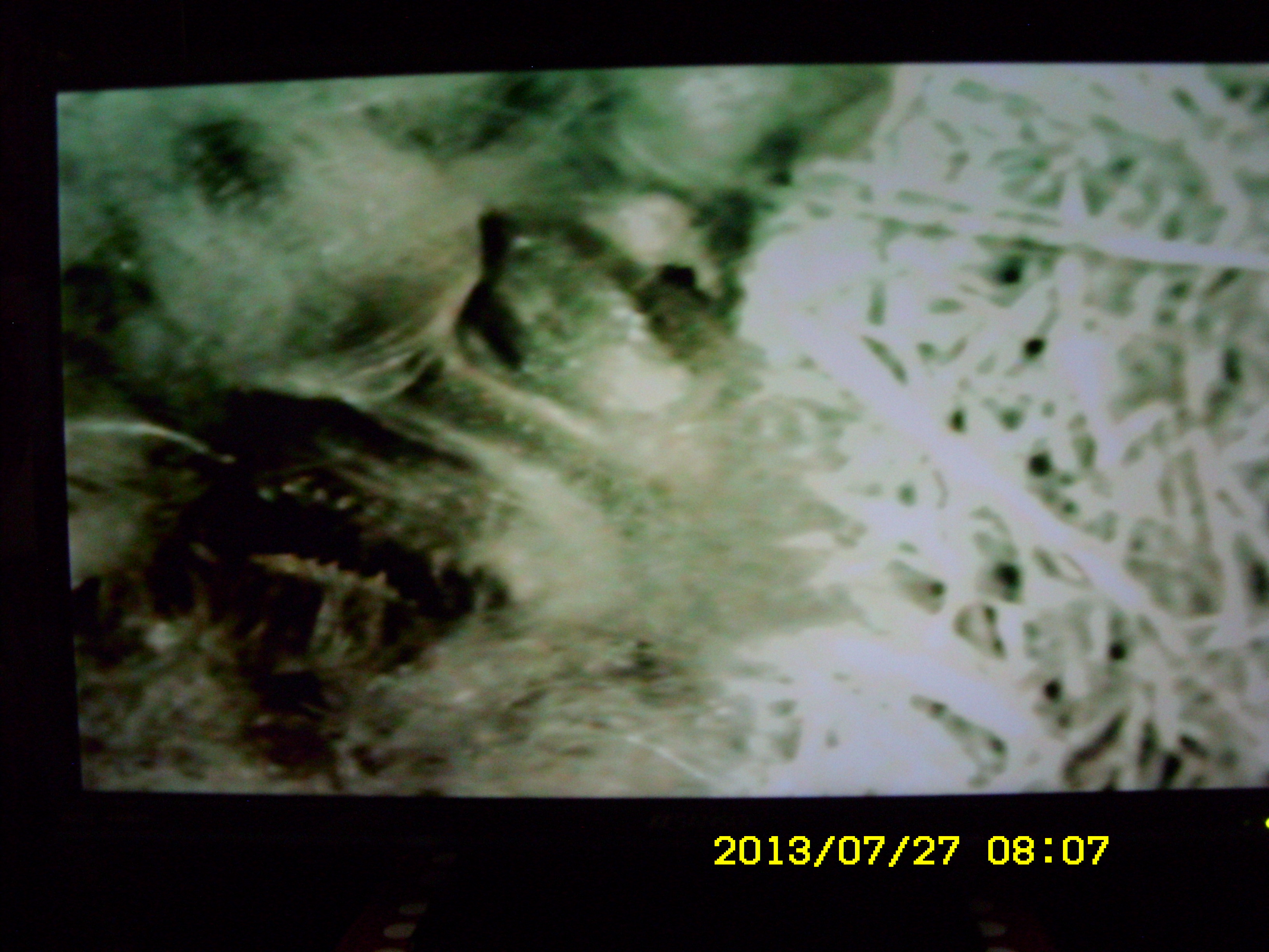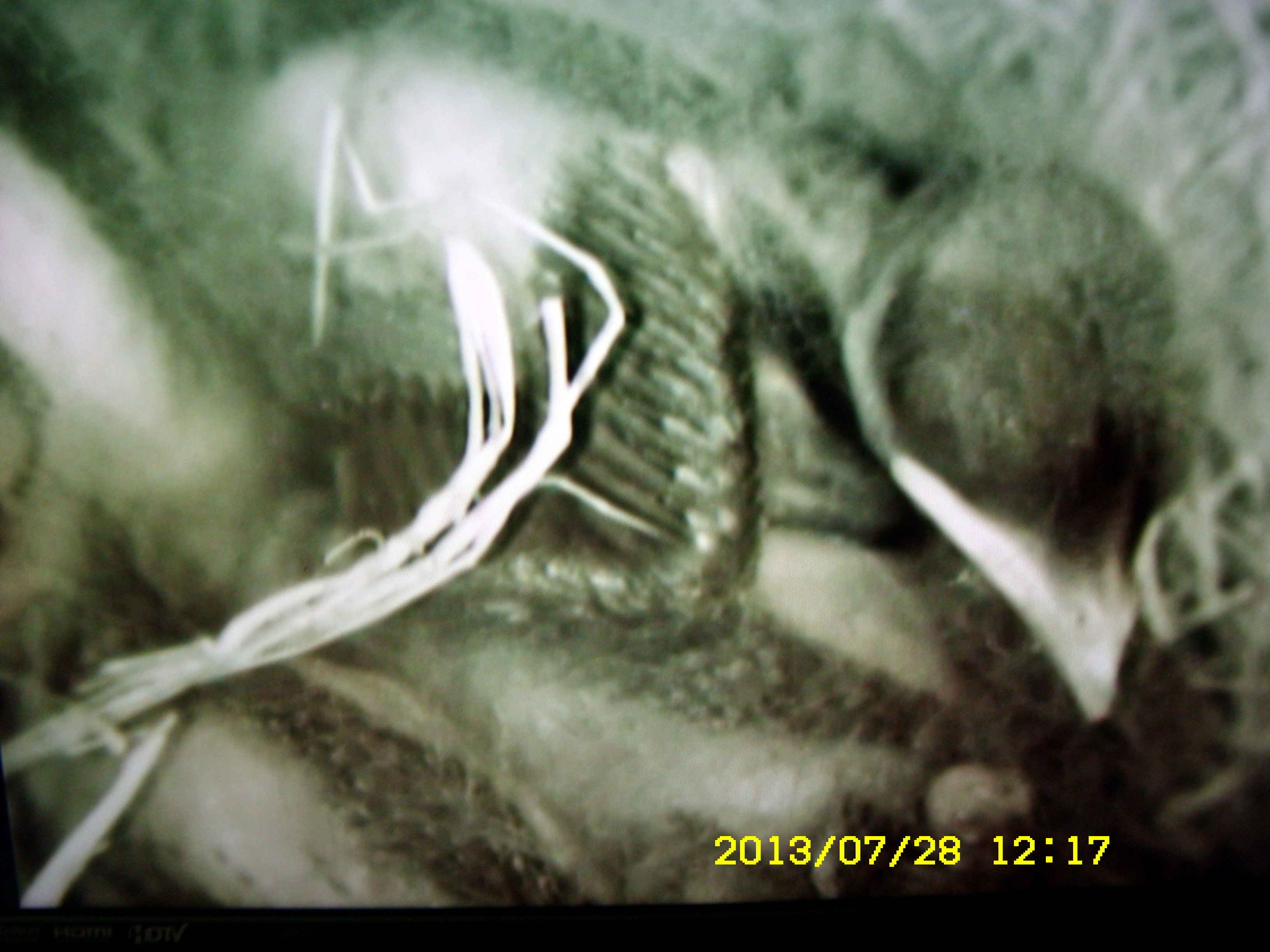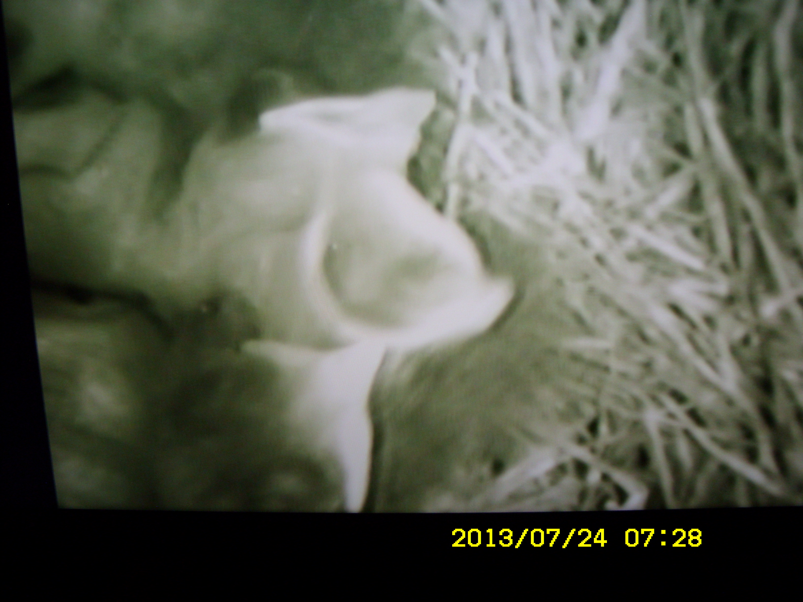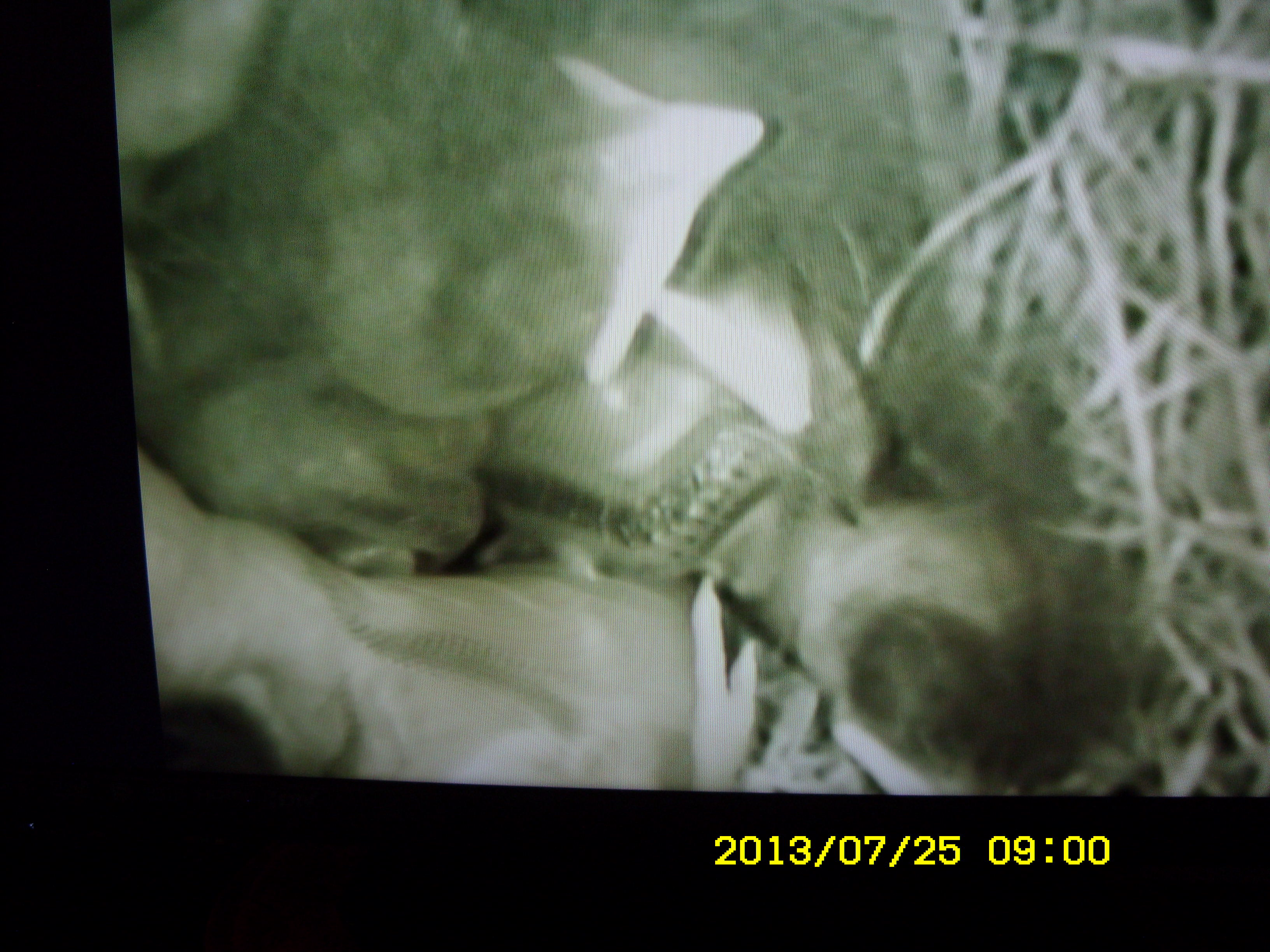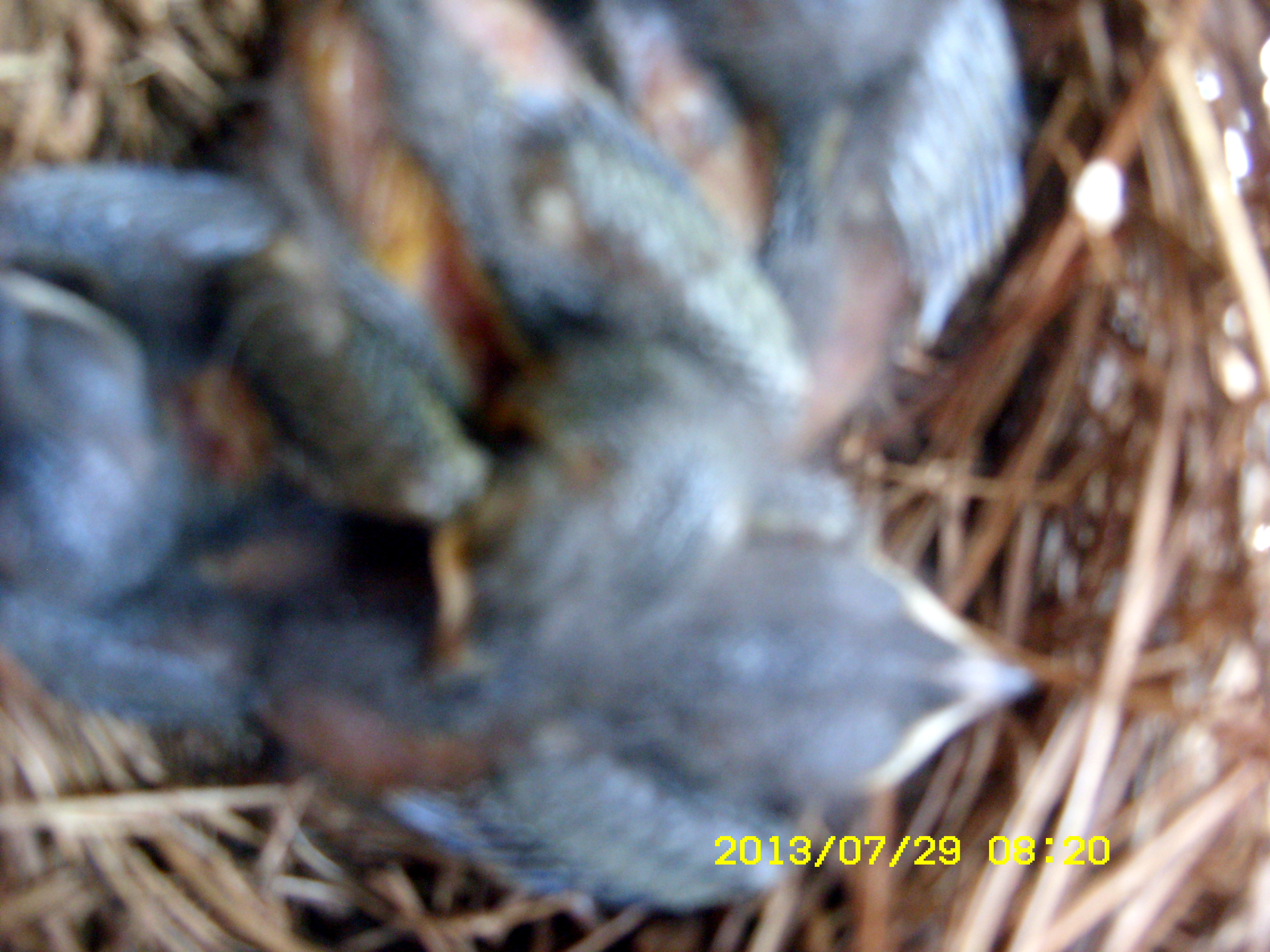 Monday, July 29, 2013, 8:45 AM: Imperfect pictures, my apology. There is limited space between nest and ceiling of the Bluebird house so pictures are out-of-focus. The Canon is too large to put in the bird house.