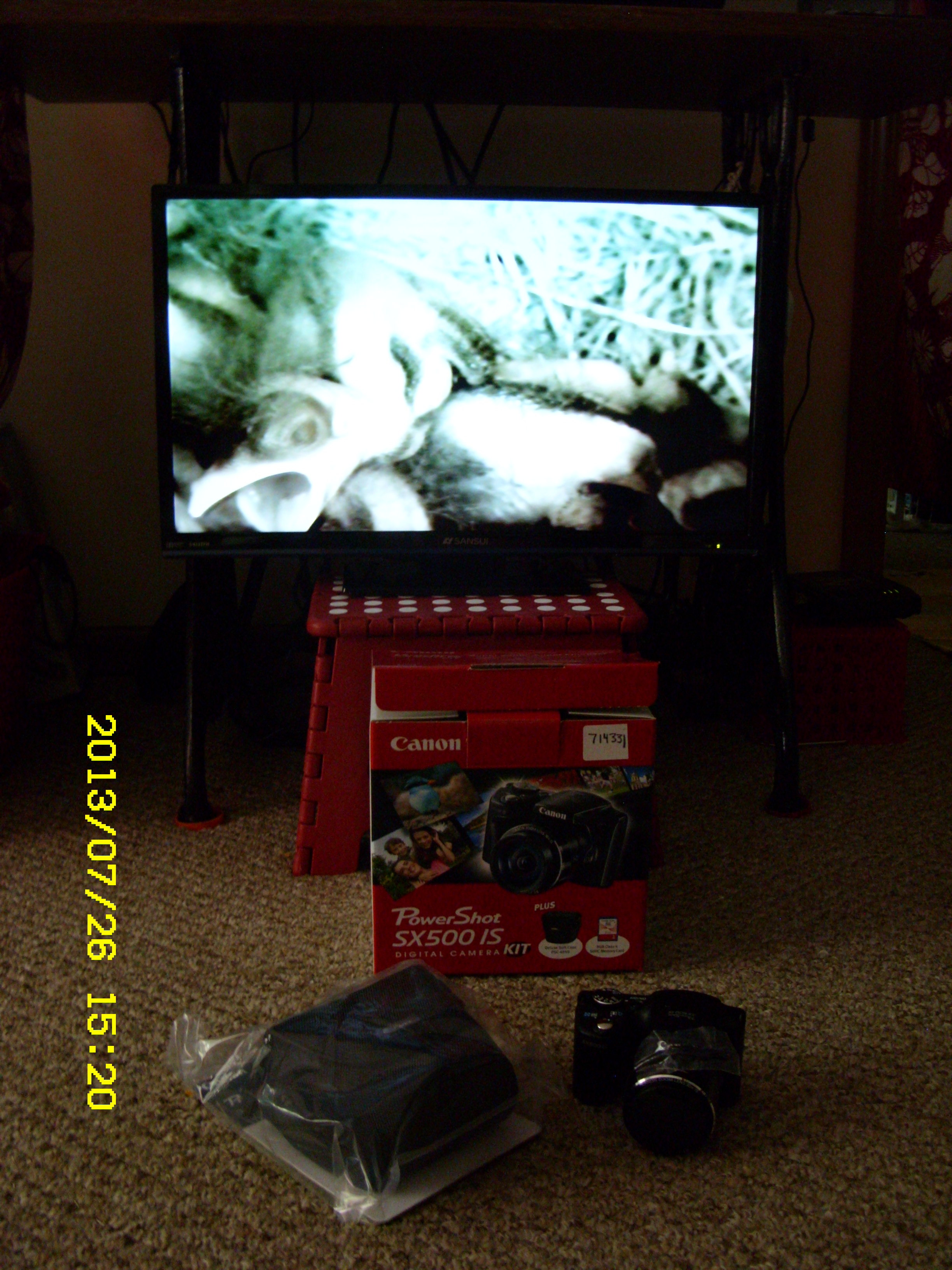 Friday, July 26, 2013, 6:00 PM: Fewer pictures of the baby Bluebirds today. I had a chiropractic appointment followed by trip to BJ’s for groceries, etc. Specifically “et cetera“!! I wanted a new camera to document my wildlife. I bought a Canon SX500 IS and have yet to study the manual and arrive at the point where I can take pictures. Furthermore, I bought a new TV so I can monitor the Bluebird house while watching regular television programming. Remember I missed the hatching of three babies because I left… and was watching the news. Pictures #1 & 2 illustrate the difference between images on old TV and new TV. I hope to improve the appearance by changing settings. The new TV is sitting on a little stool below older TV. Picture #5 shows new camera on the floor in front of new TV. #6 shows box the Canon came in.