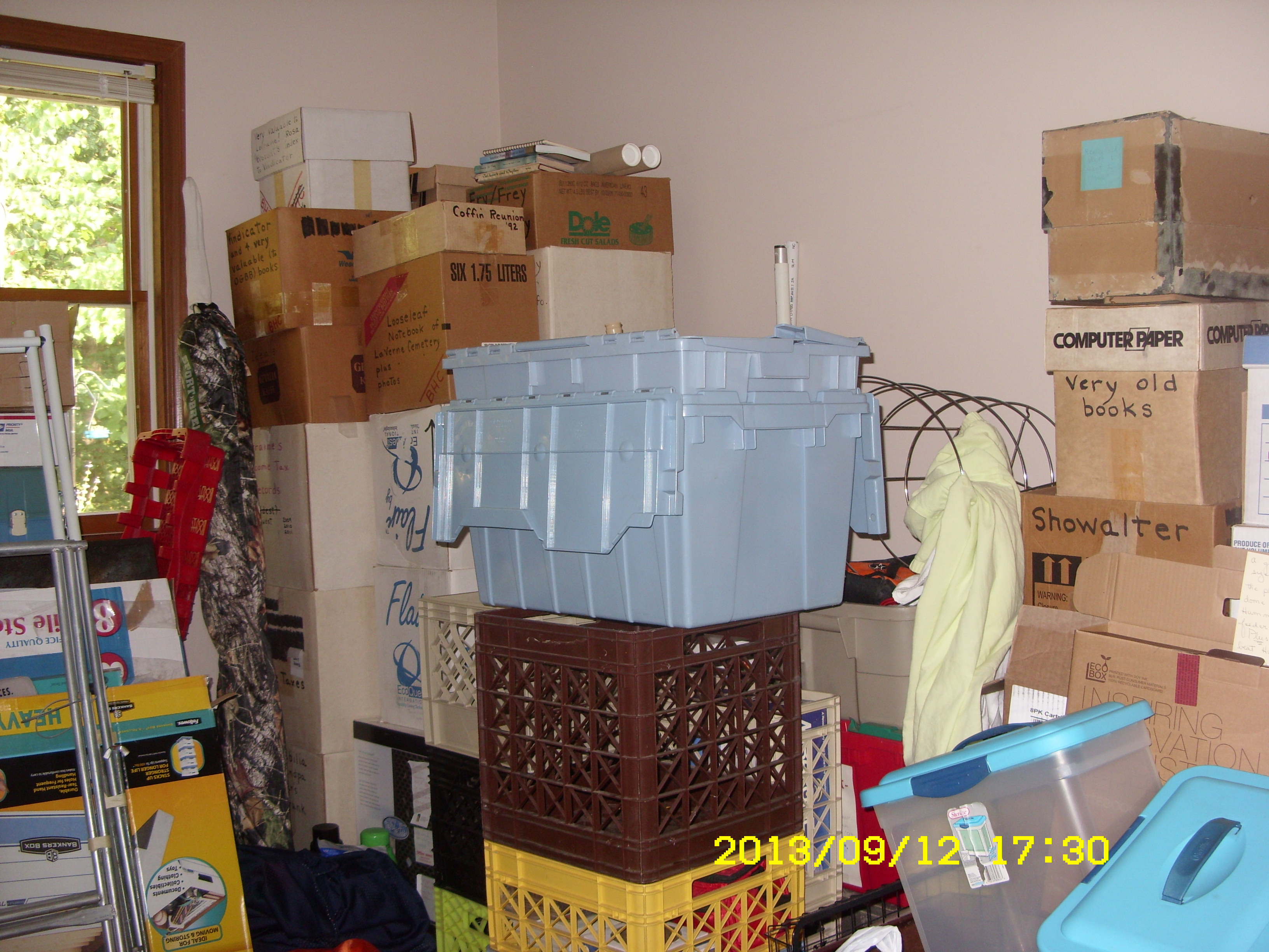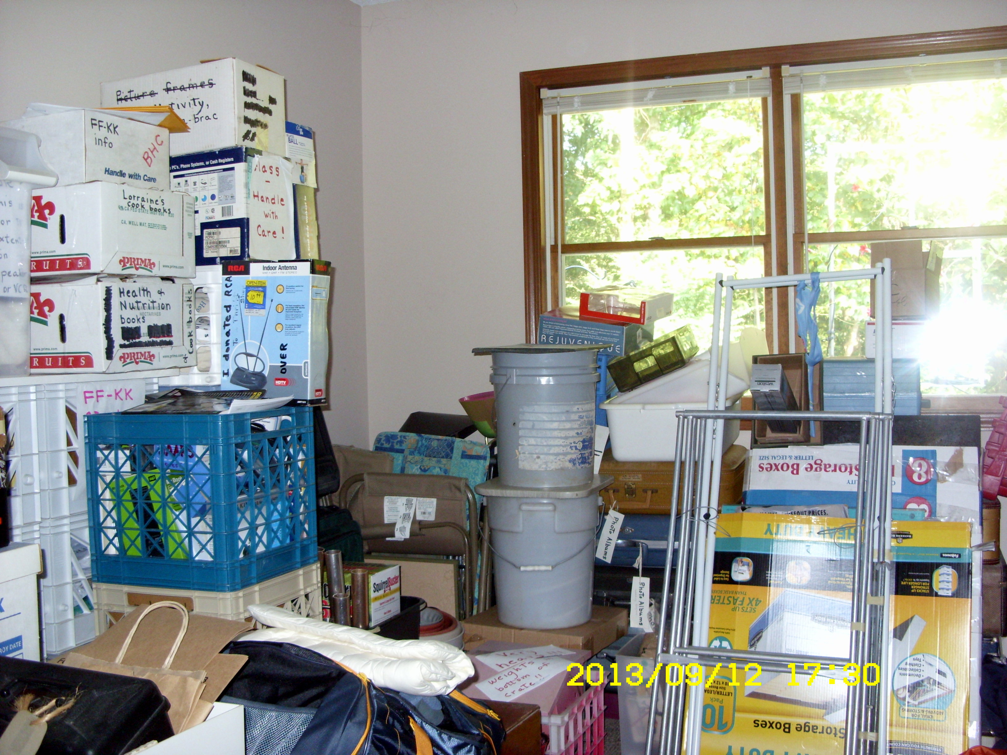 Yes, I’m stressed beyond description. There are so many items to sort through and make decisions: Keep? Shred? Donate? Trash?? On a positive note, the project is coming together admirably. An oxymoron?! So much to do but coming together admirably. Is my brain scrambled?? ~~ Just three pictures. I could add one more… for the “storeroom” and several for the cluttered living room.