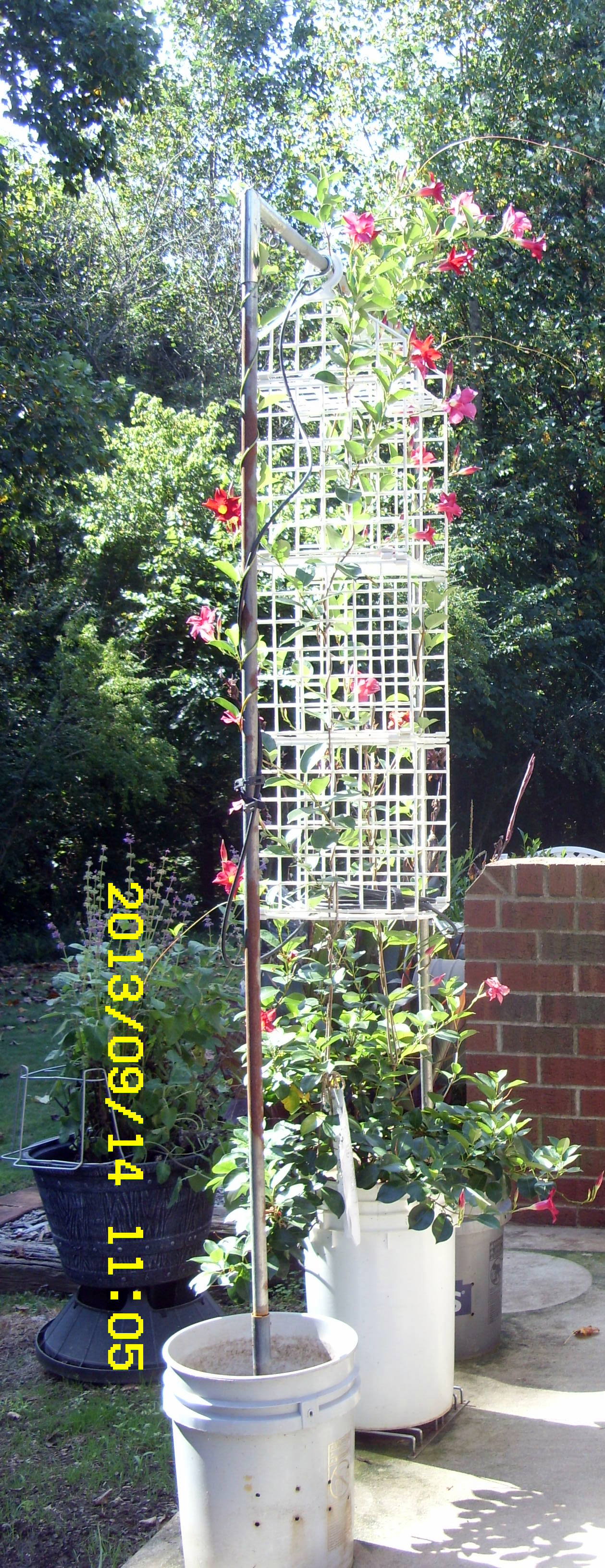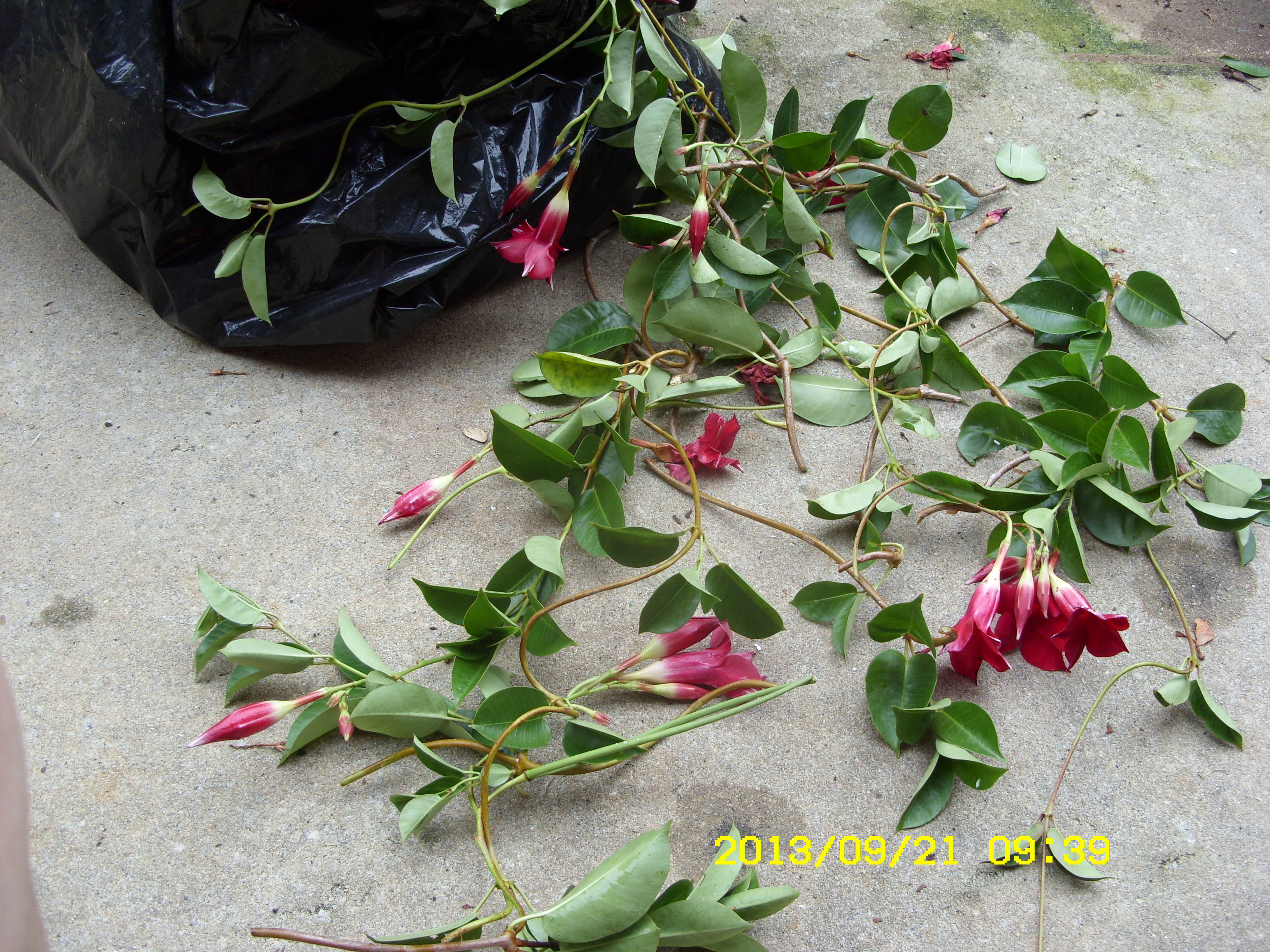 An overcast morning; great for picture-taking. Rain expected later in the day. The last thing I wanted to do… but couldn’t procrastinate!! First two pictures show the Mandavilla vine a few days ago. Up on my ladder, I began to cut the vine away from the trellis (closet organizer).