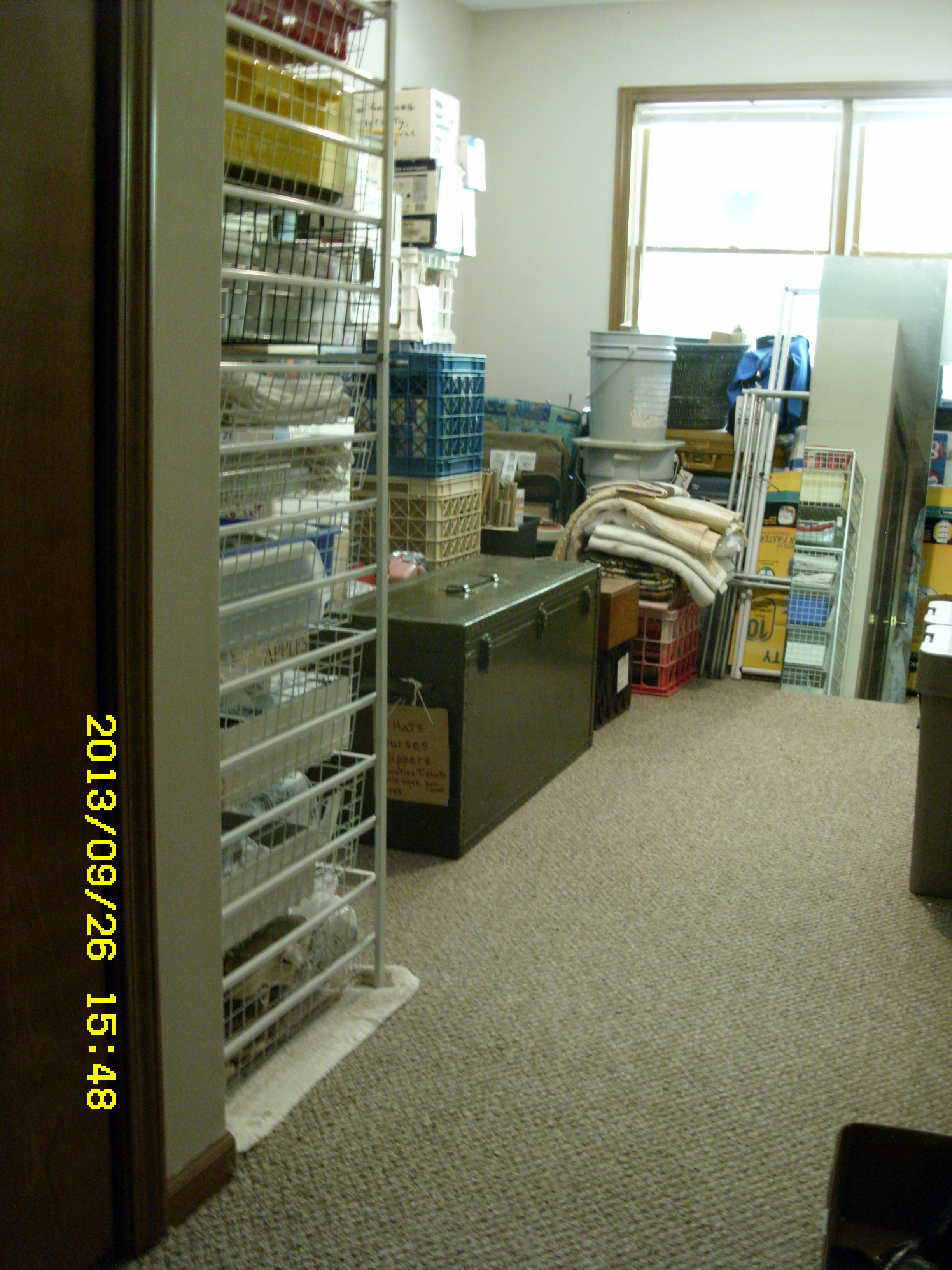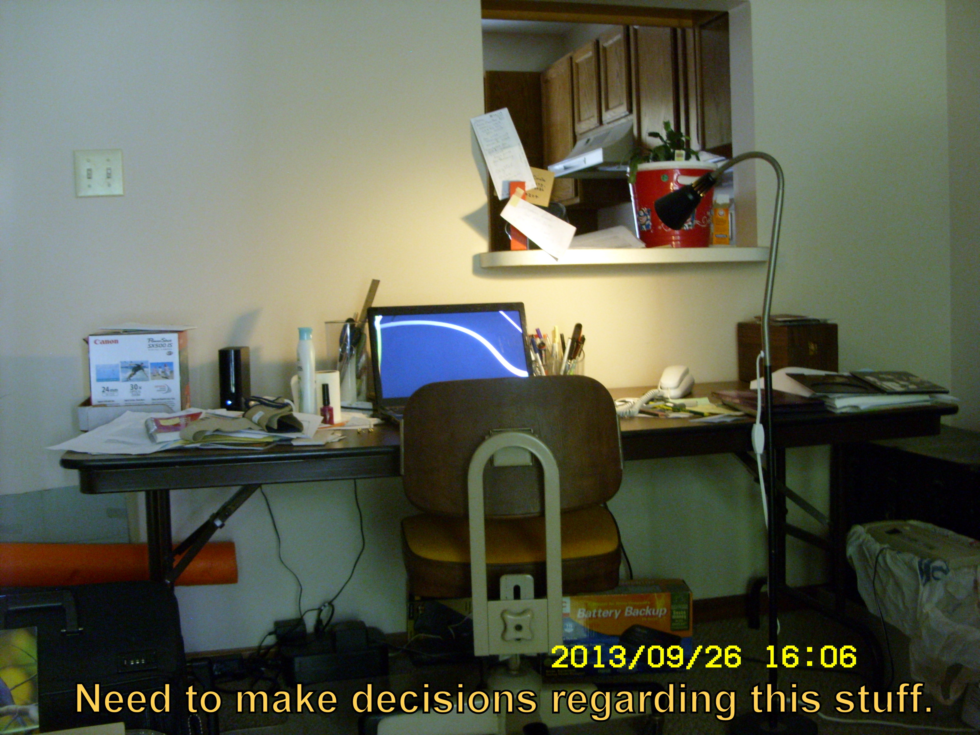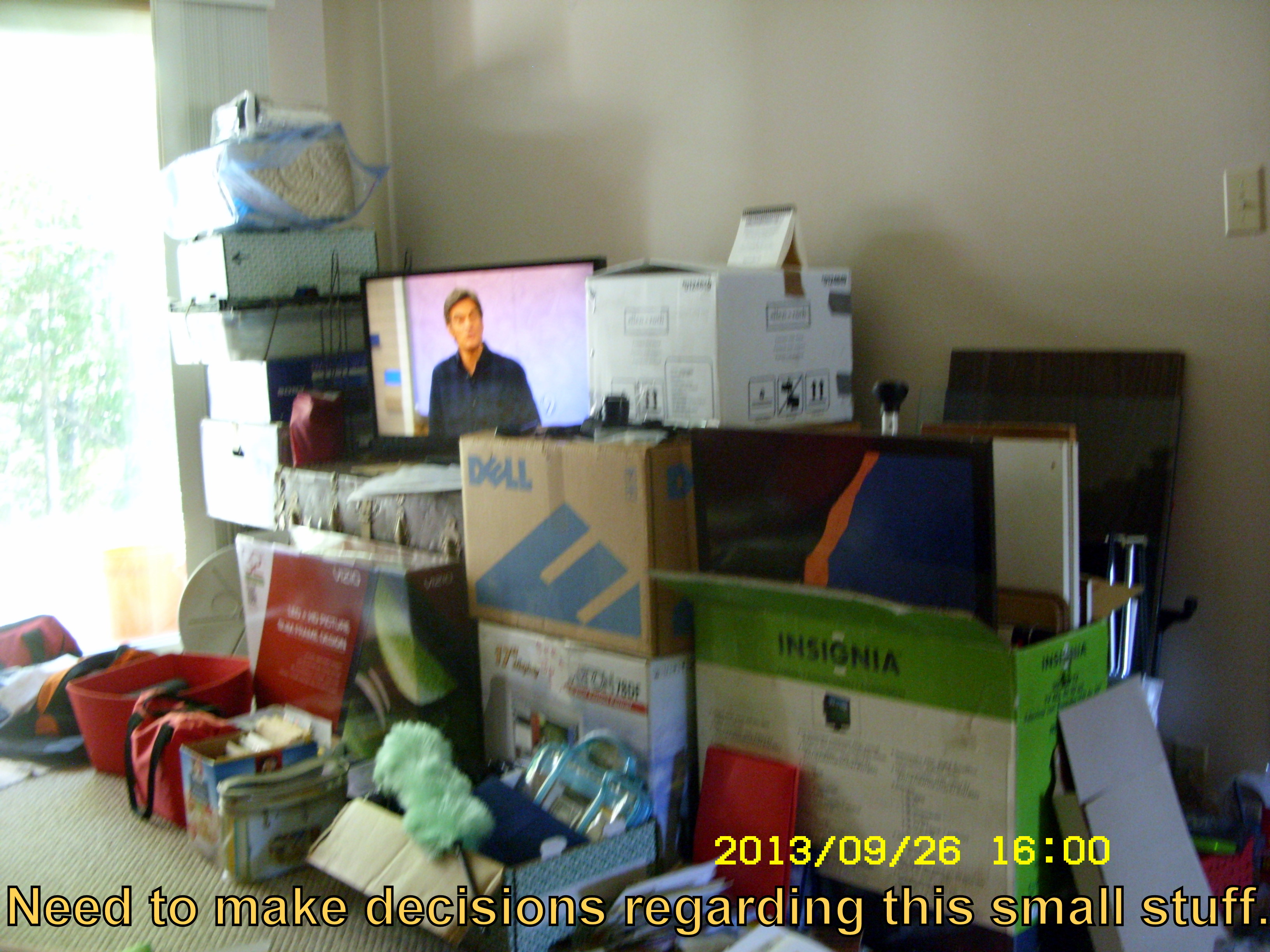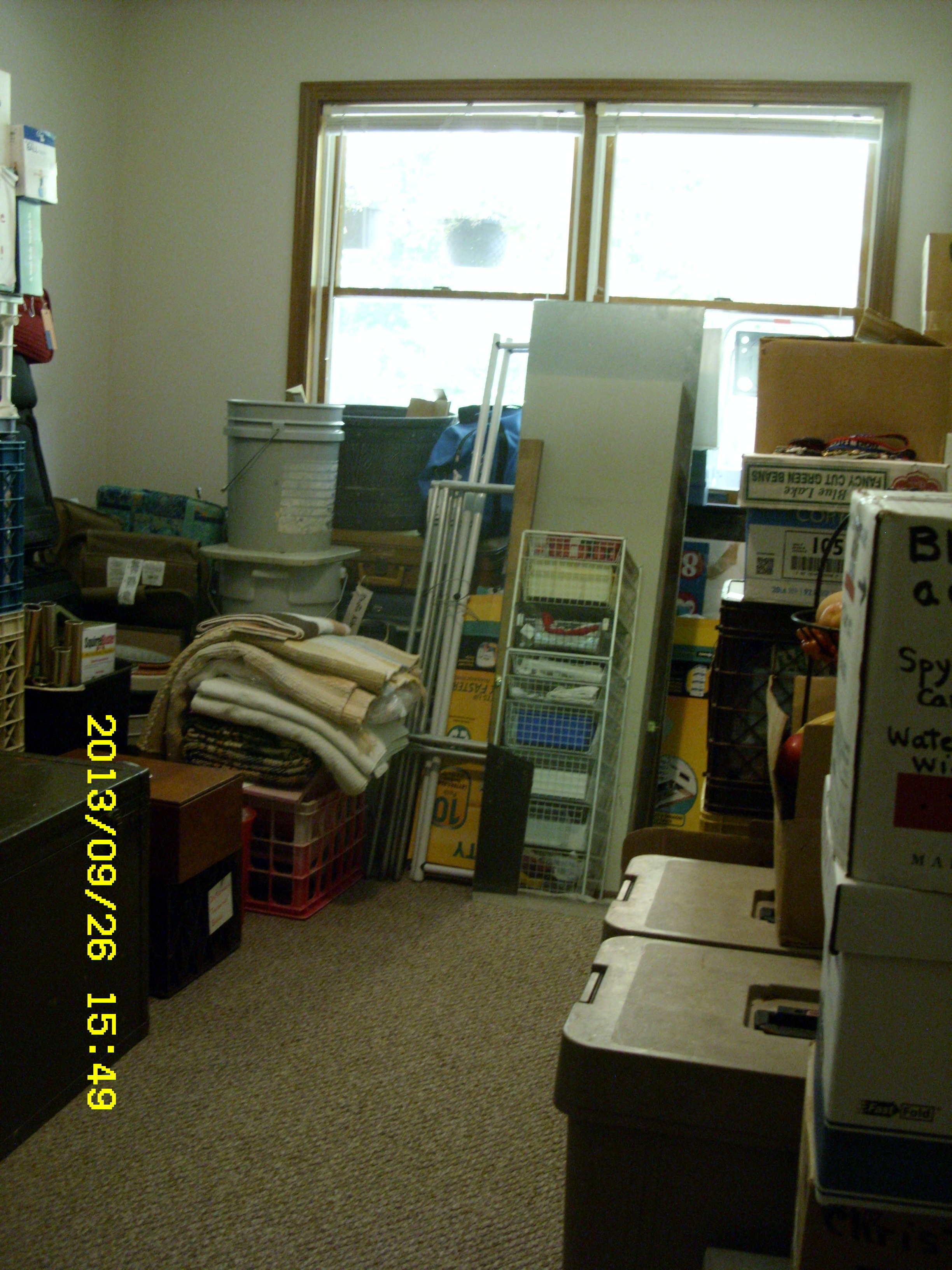 Confession: I‘m so tired, I’m cross-eyed!! Only three more days to finish packing. The kitchen cupboards are empty. The packages on the shelves (far left) are food items that will go into the trailer. Pictures three, four, five, six and seven in the storeroom (bedroom). Paperwork on the floor, and table next to computer, needs final decisions: sort, shred?, pack?, recycle cards and cardboard!! ~~ It’s only 7:30 but I think I’ll crawl into bed.