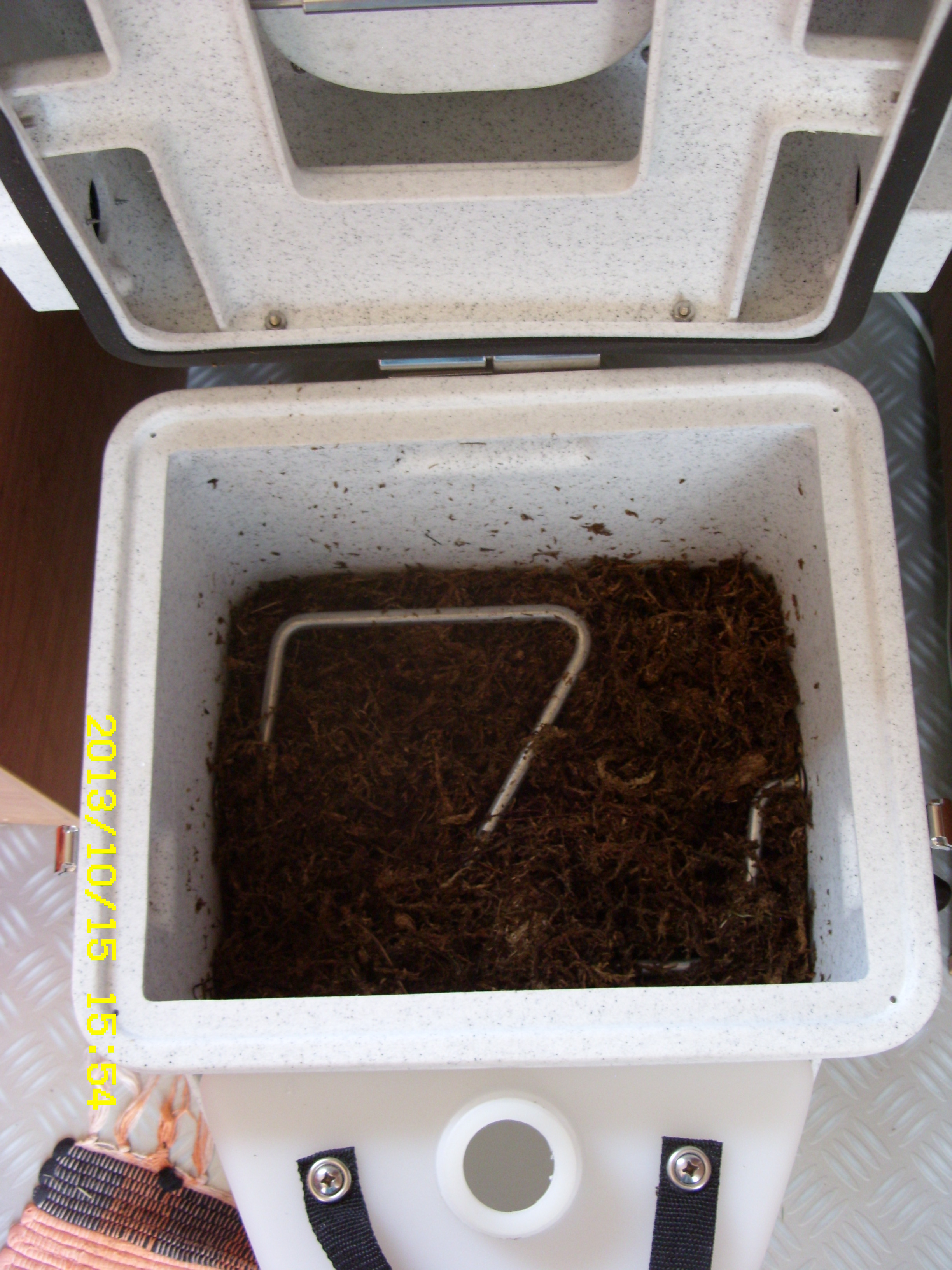 Four-thirty PM and my fancy toilet is ready for use. I made a fifteen mile round trip to Lowe’s for peat moss. (Gratefully, I didn’t have to buy a bale!!) That was my first trip away from the Resort and–having a one-track-mind–made no other purchases during the trip. Back “home” I mixed the peat moss with a small amount of water (in the orange pail). Look how perfectly my purchase fits between the bench (left) and cupboards (right). I have it covered with a bright orange-color towel.