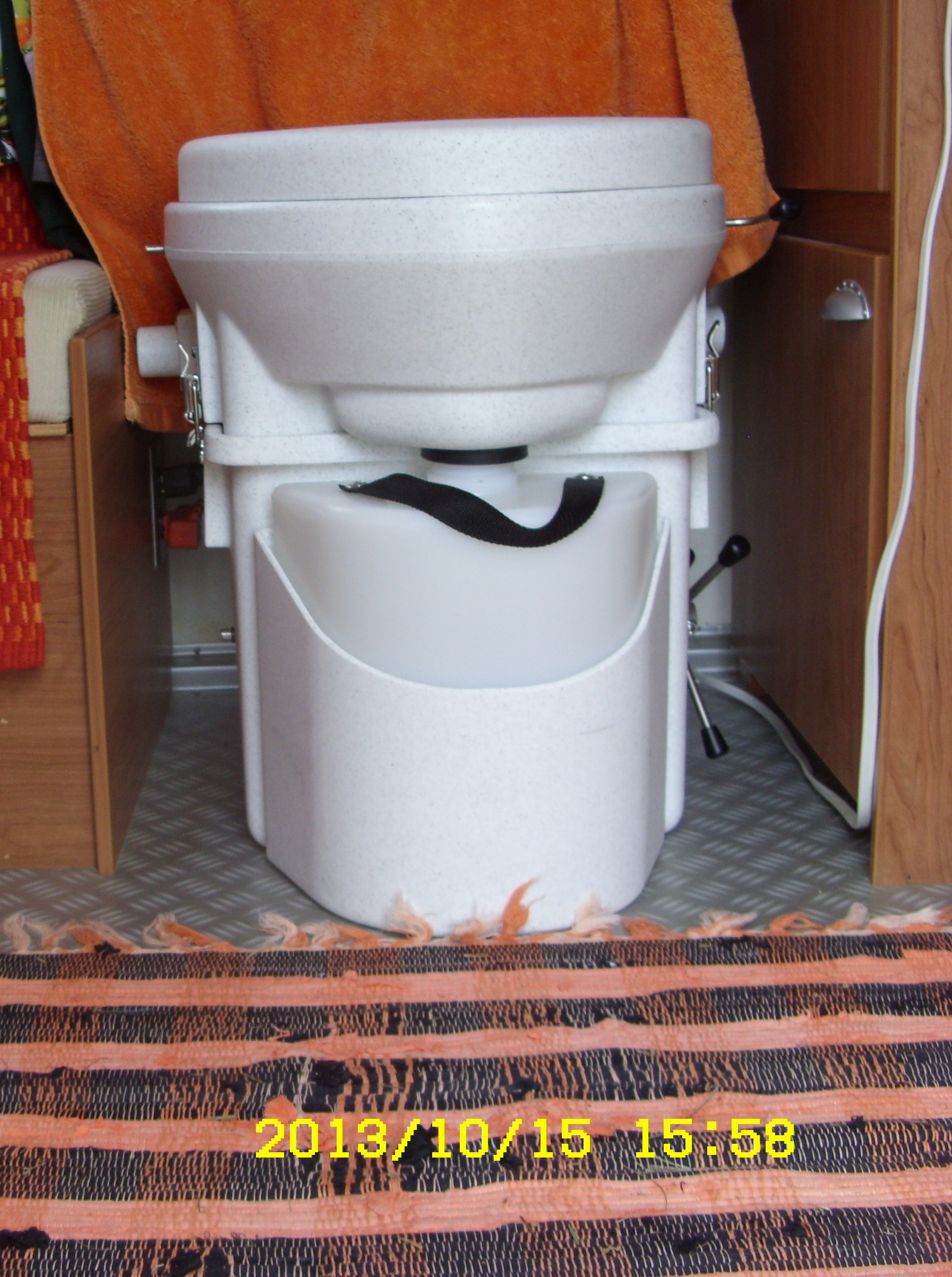 Two-thirty PM and that very awesome item is in a conspicuous corner of the T@B (discretely covered with an orange-color towel). For years I have given tours of “that cute little trailer.” Now I’ll be giving a tour of “that new style camping toilet.”