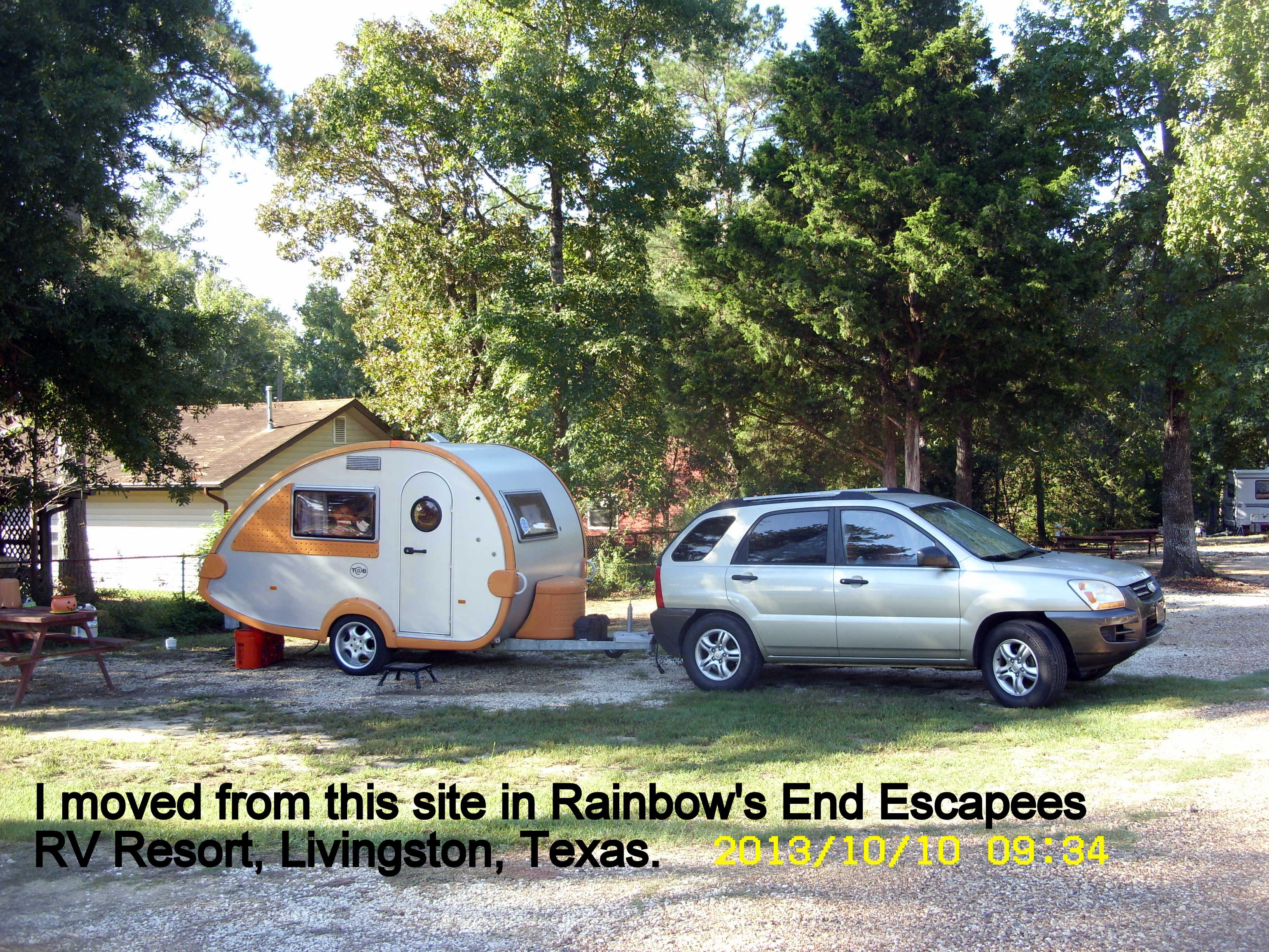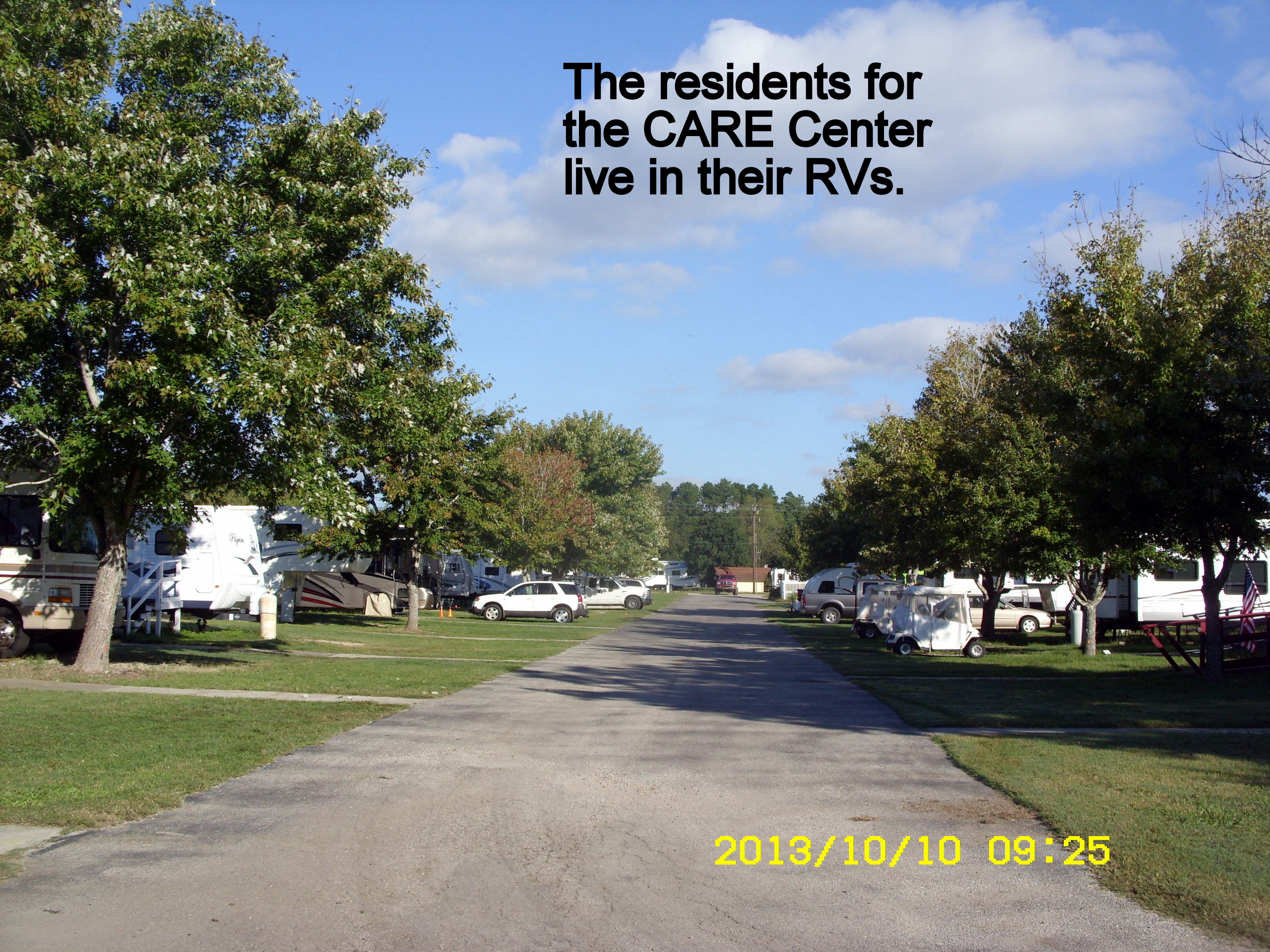 Greetings from the CARE Center located at Rainbow’s End Escapee’s RV Resort in Livingston, Texas. I’ll bring you up-to-date in increments–as I have time. I was able to use WiFi for the first time at 5:00 tonight, Thursday, October 10th. It has taken almost three hours to upload pictures from my camera to the computer and from the computer (Picasa) to this blog. At this time, I can’t provide all the information regarding the trip. It was an almost uneventful trip (more about that later). I arrived safely about noon on Tuesday, October 8th. I’m three weeks ahead of my scheduled volunteer assignment but they quickly put me to work pricing merchandise for their garage sale. All day Wednesday pricing, all day Thursday (today) working “the sales floor” while a parade of customers shopped. We have two more days and unquestionably it is a success!!