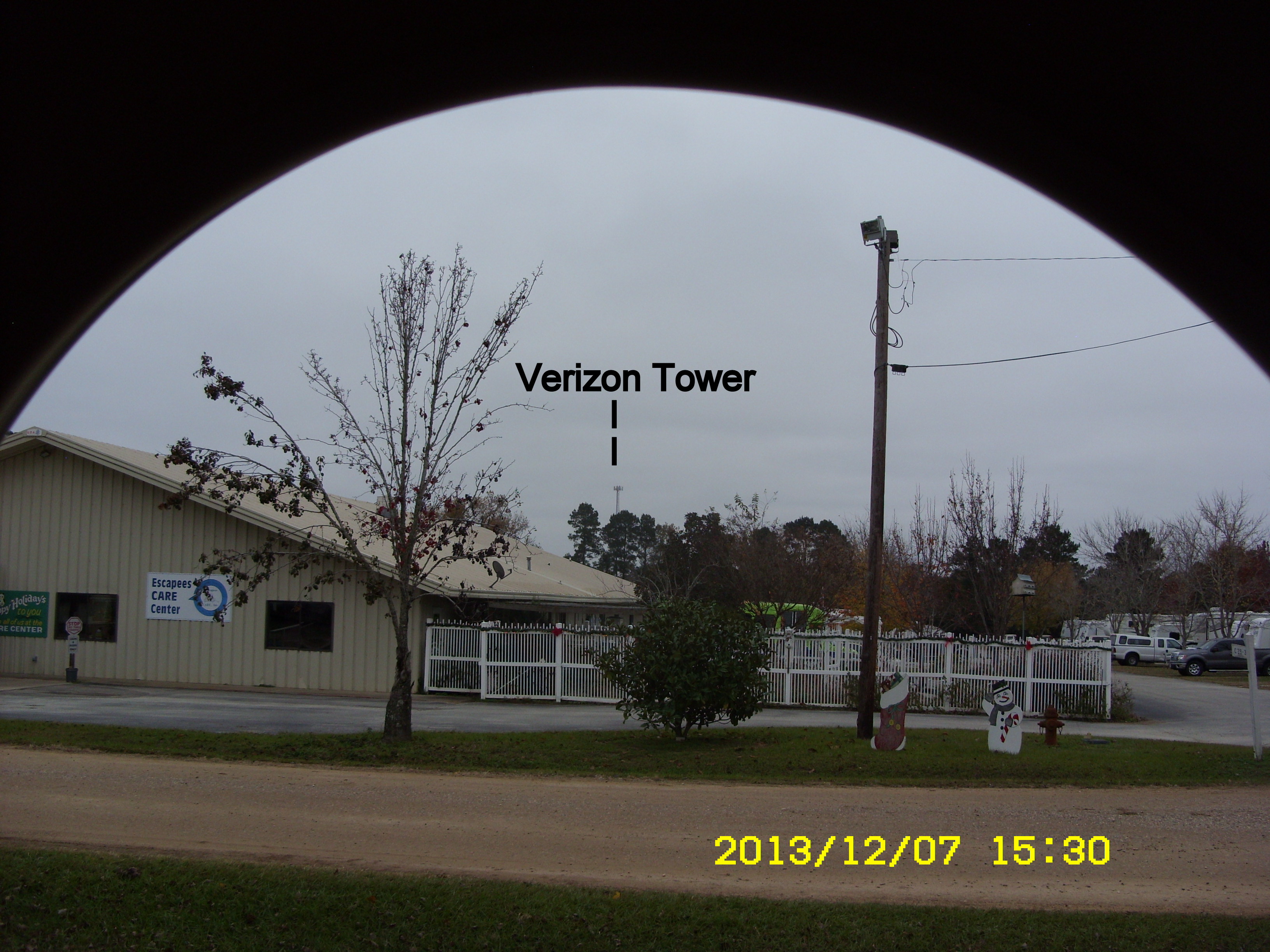 Second: Please look at the attached pictures. Note that the Verizon tower is at the edge of the property. ~~ I am in Texas, for the winter, at an RV Park. That’s my little trailer. From inside the trailer, I can see the Verizon tower.