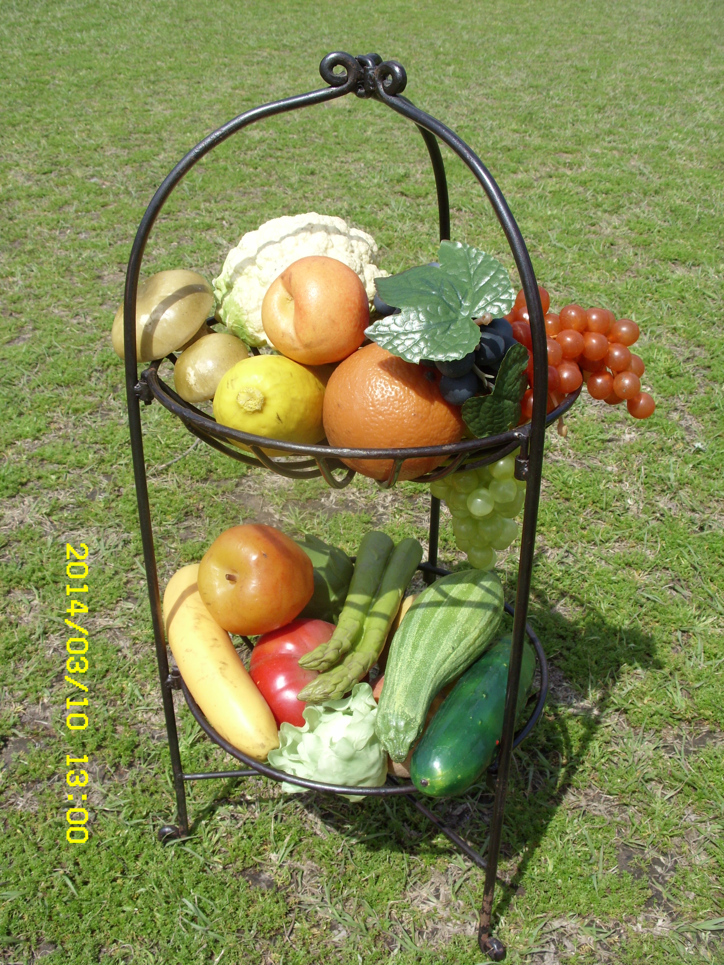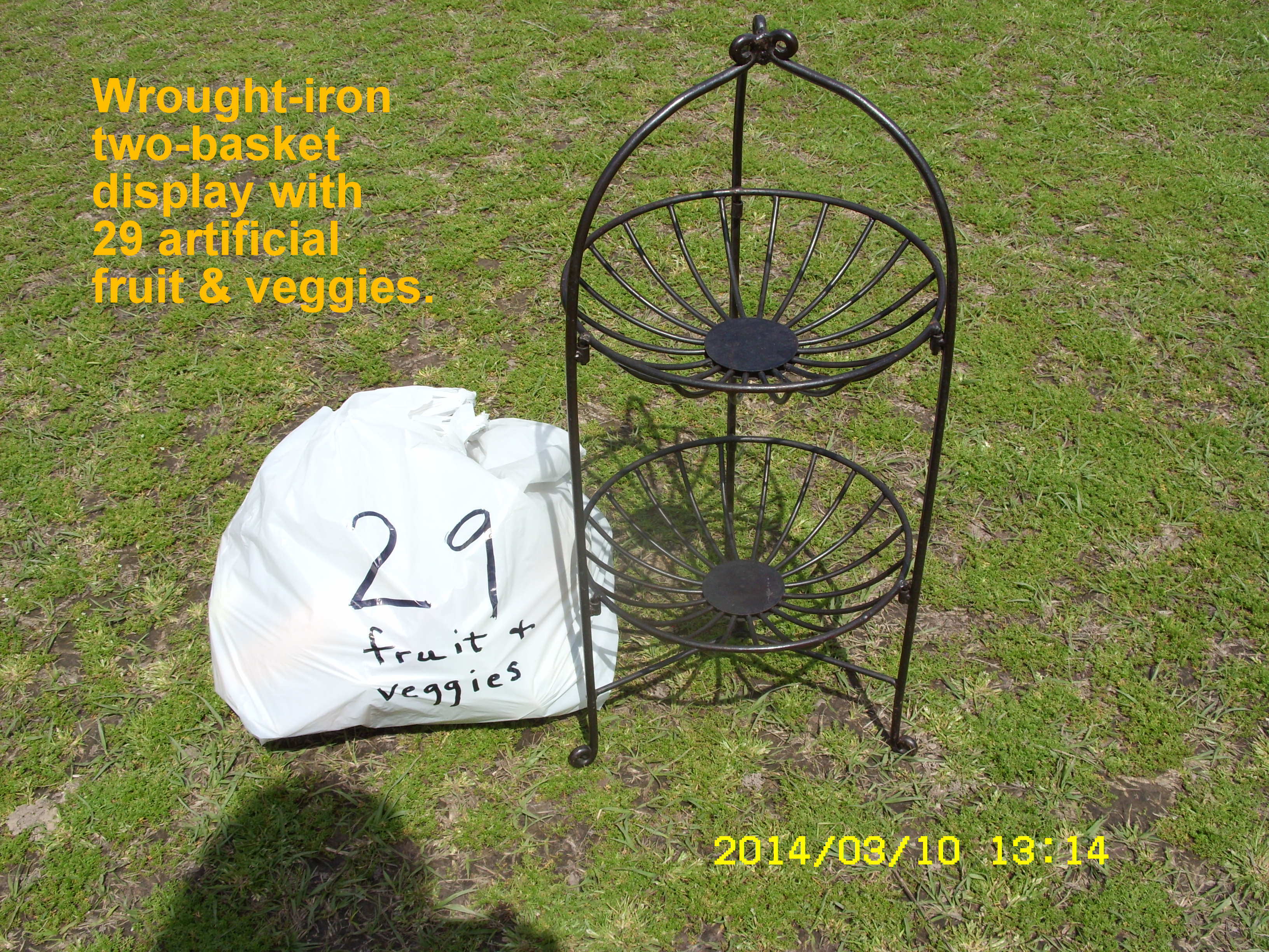 Wrought-iron fruit basket. ~~ Very realistic artificial fruit & veggies.