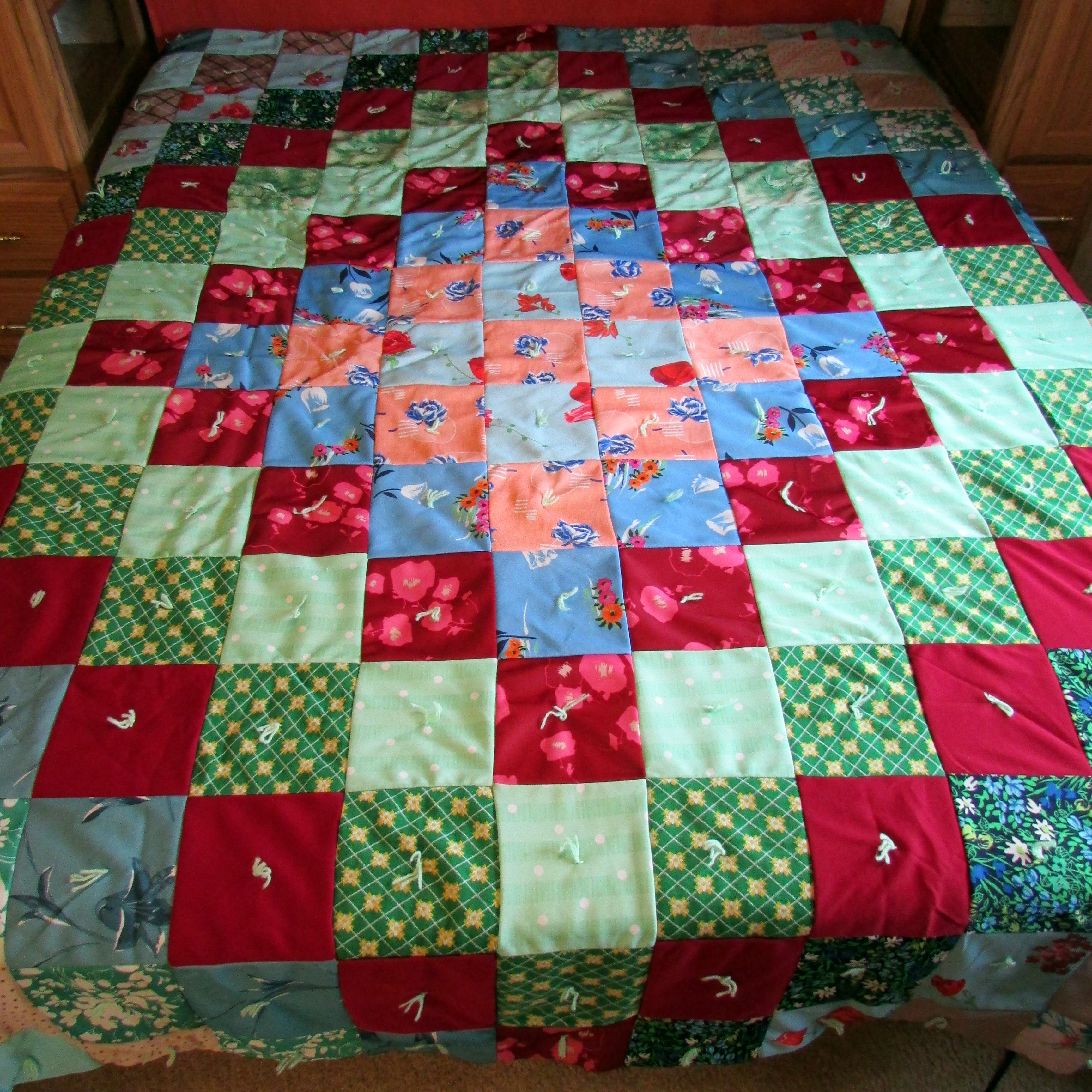 My mother, Pearl Showalter Frantz, had a large wardrobe of polyester dresses (polyester was popular three decades ago). Some of my “genealogy cousins” made this comforter from the fabric in the dresses. I can look at the various squares and visualize my mother in that outfit. A pleasant memory.
