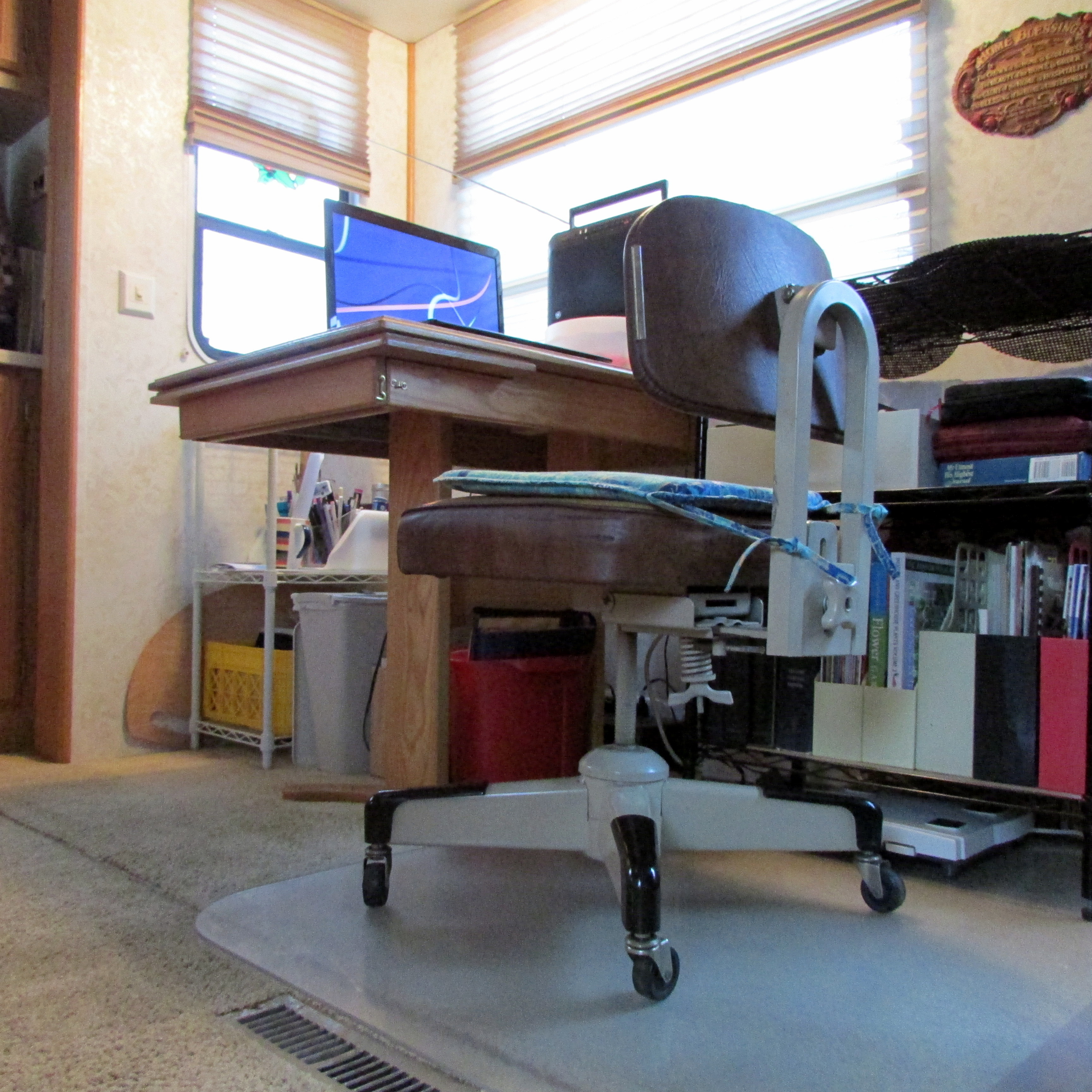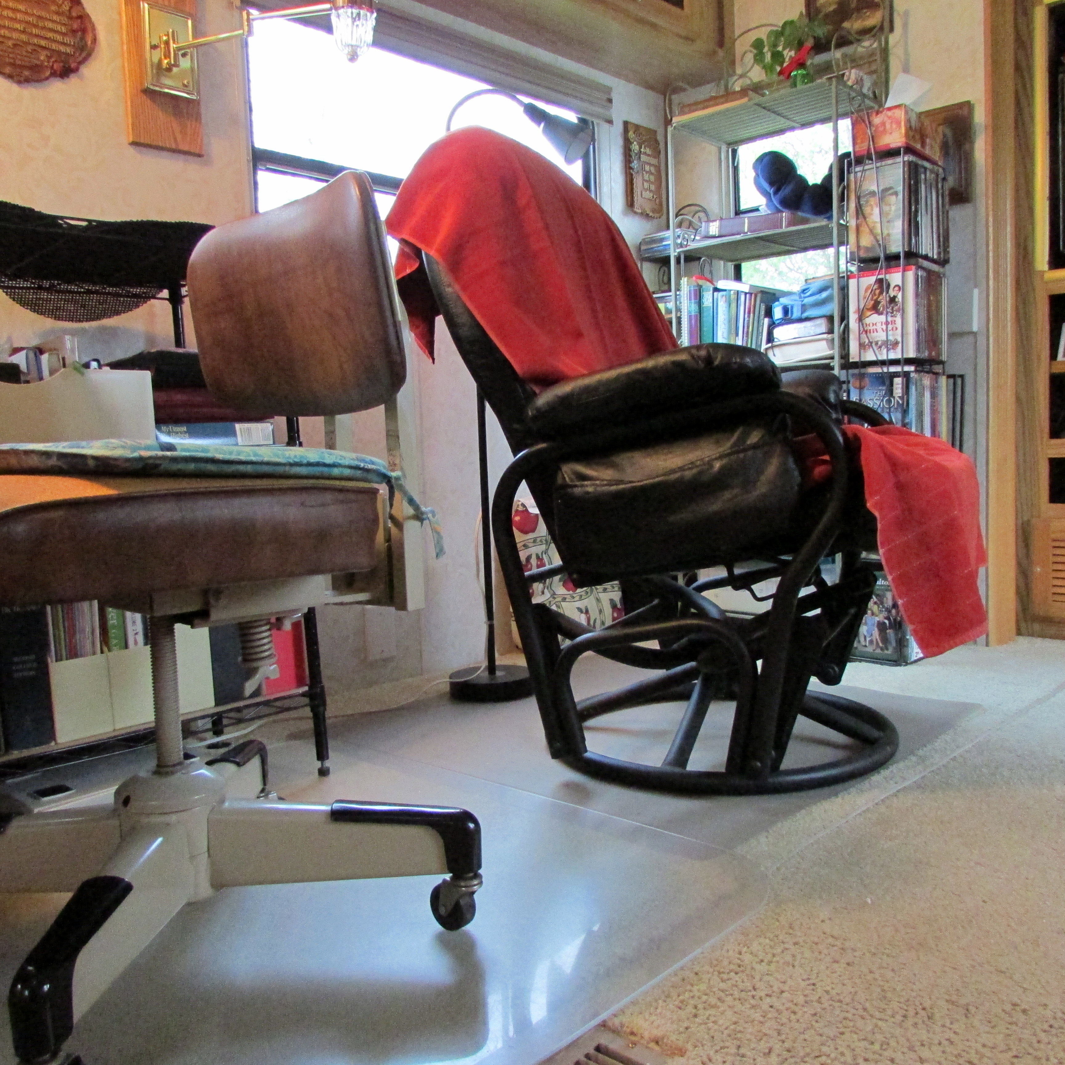 It is another dark gloomy day as I write this (9 o’clock). Because of “re-arrangements,” my back is turned so I can’t see the street and people coming and going. Notice in the second picture that I have my decades-old office chair at the side of the table. Previously I was using a big dining table chair at the end. There is “decades-old” plastic between the carpet and the chair wheels. That was lugged-in from the yard and scrubbed. A similar plastic is under the glider-recliner chair (brought in from the yard and scrubbed) but it was larger and required work. With my heavy-duty long-handle tree-limb clippers, I removed about fifteen inches along one side (now turned to the back, of course). Why have plastic? So the black wrought-iron base doesn’t blemish the carpet. (I can’t argue with success; I’ve done it that way for years!!) Notice the rust-color towel on the glider-recliner? That towel is over thirty years old, never used, elegant luxurious Egyptian cotton. Why do I cover the chair? Because over-the-years (especially when it was in storage for fifteen months) the simulated-leather became sticky!! So-o-o-o, I lubricate the material with WD-40 and I cover the chair. (It’s a very comfortable chair!!)