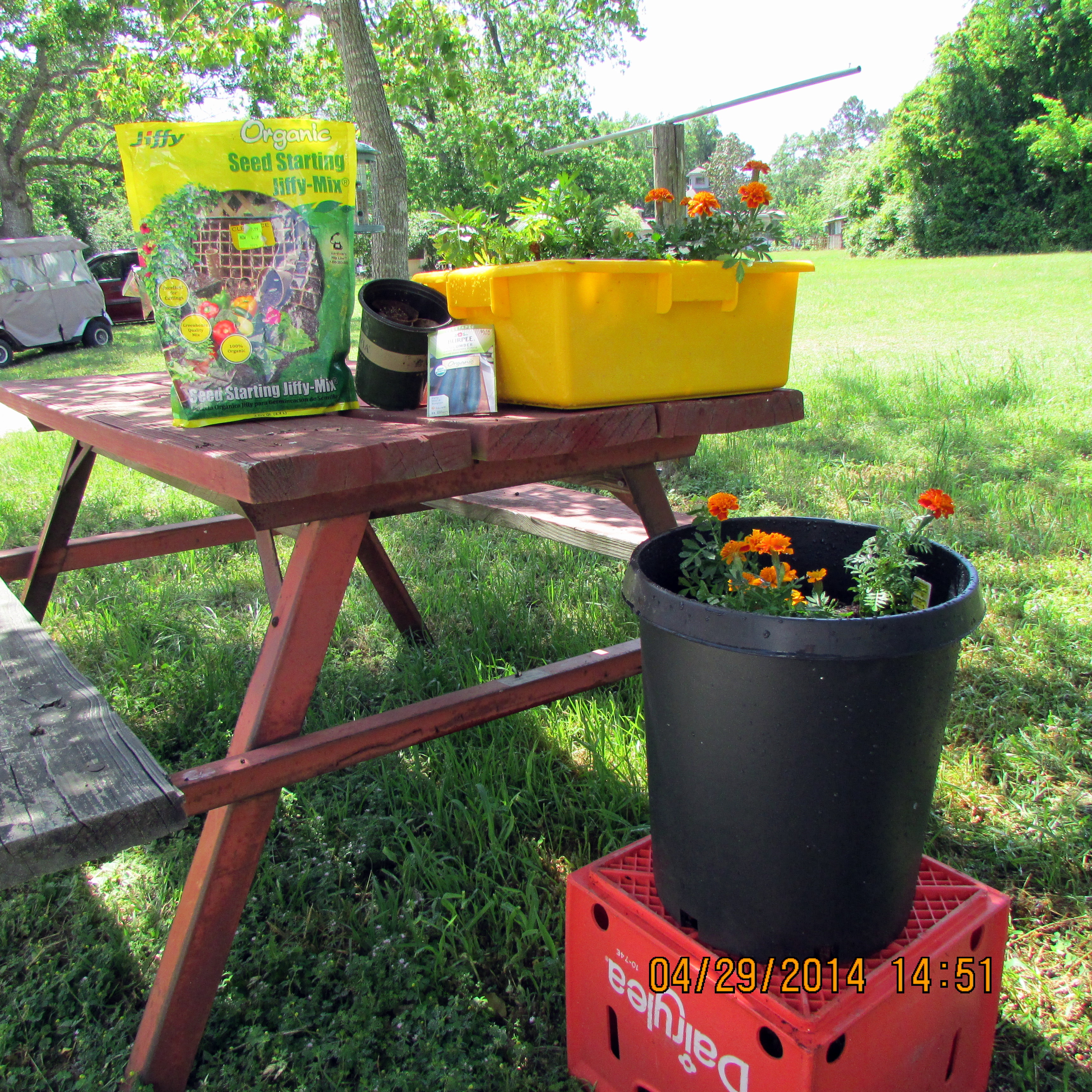 3:30 PM: Yup!! I’ve been in the garden!! I planted organic cucumber seeds in organic starter soil. Then I transplanted marigolds (from Lowe’s) to a planter that will be a gift for one of the faithful, hard-working volunteers. I’ve mentioned Sam before; he was my team-mate while I was volunteering at CARE. He volunteers month-after-month. Maybe he will be spared mosquito bites while sitting, reading, in his yard?!